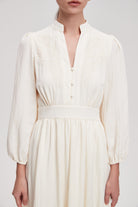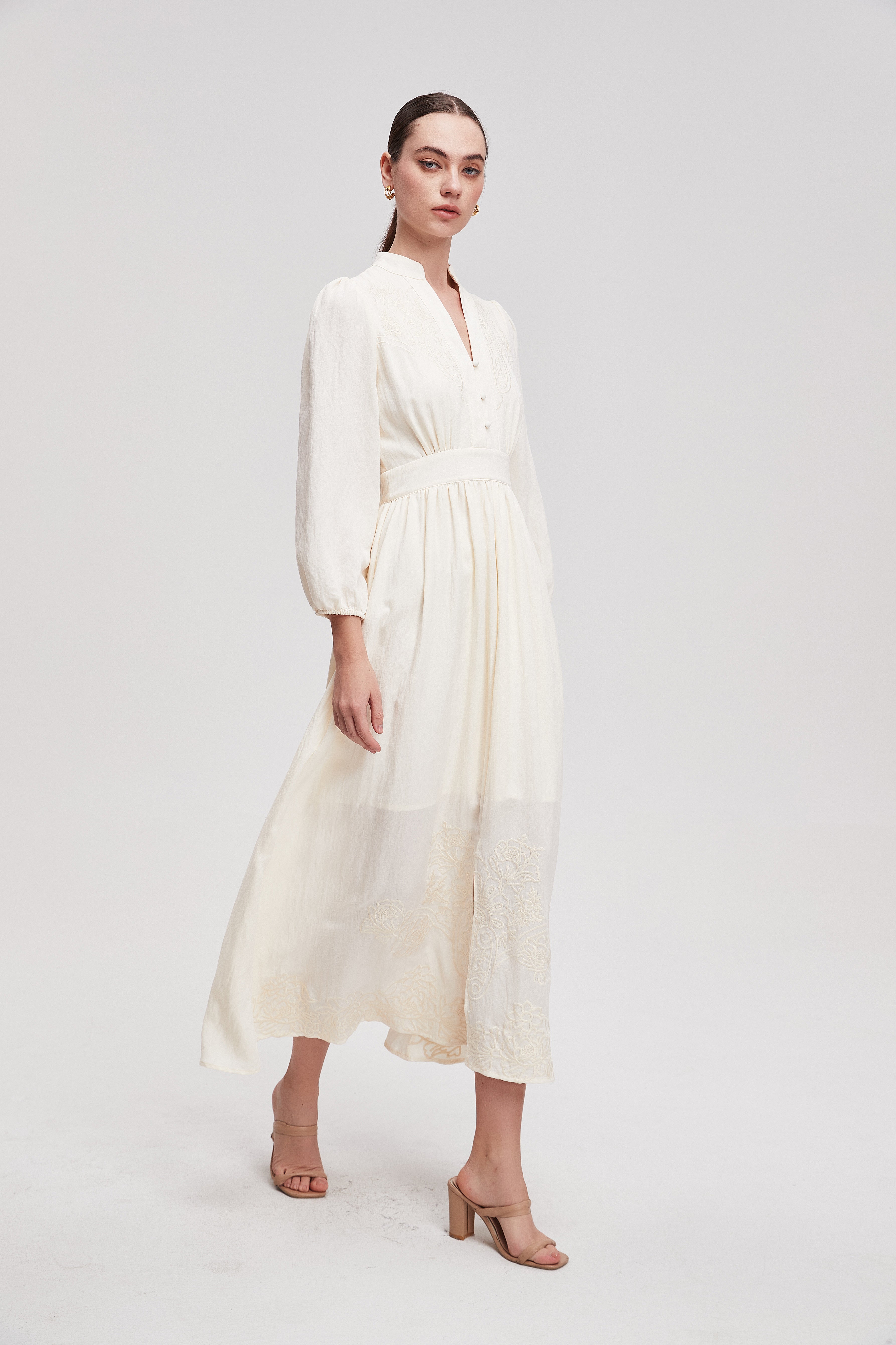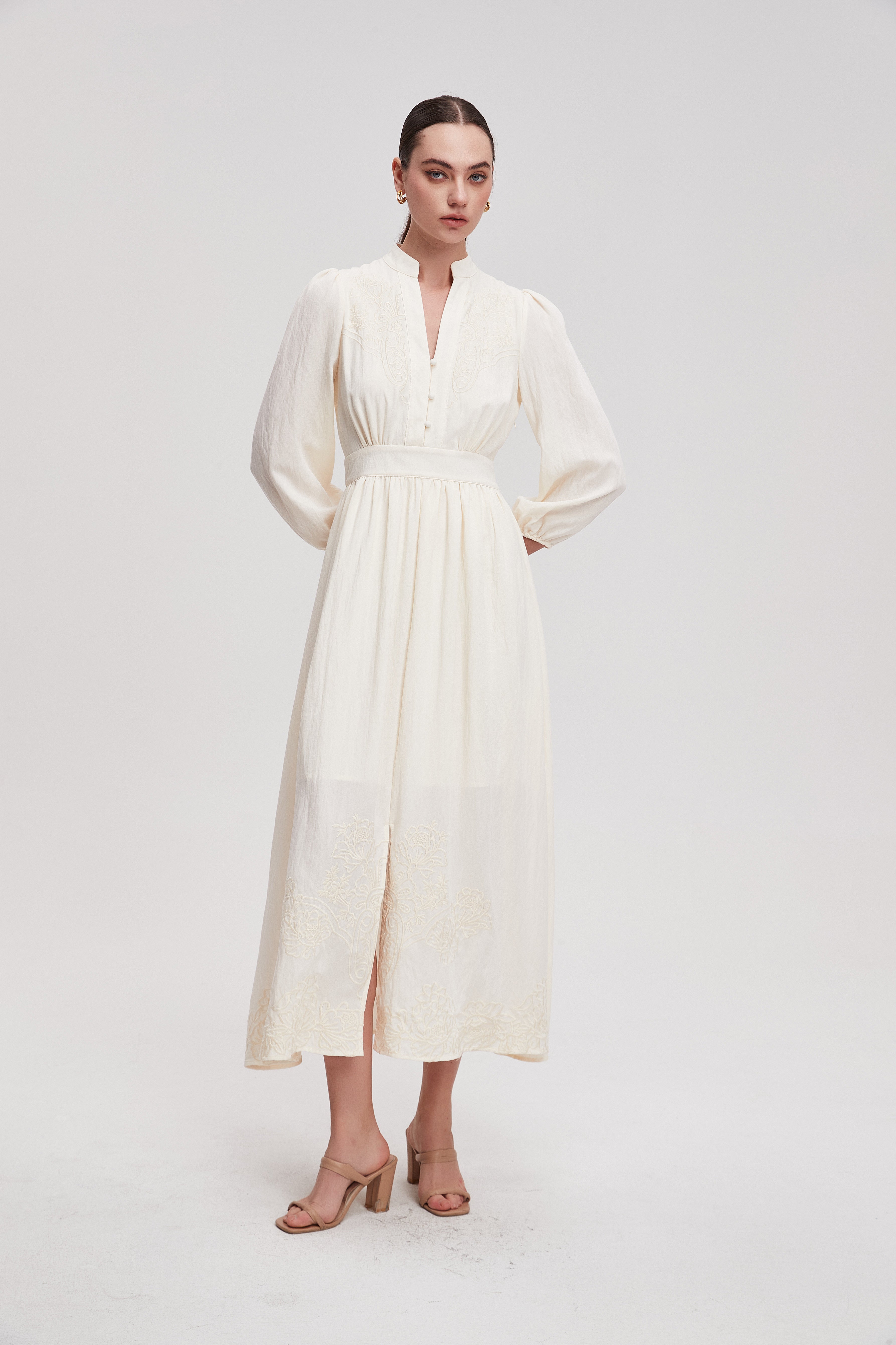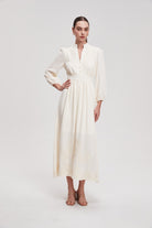 فستان ماكسي مخصر بفتحة صدر بأكمام طويلة