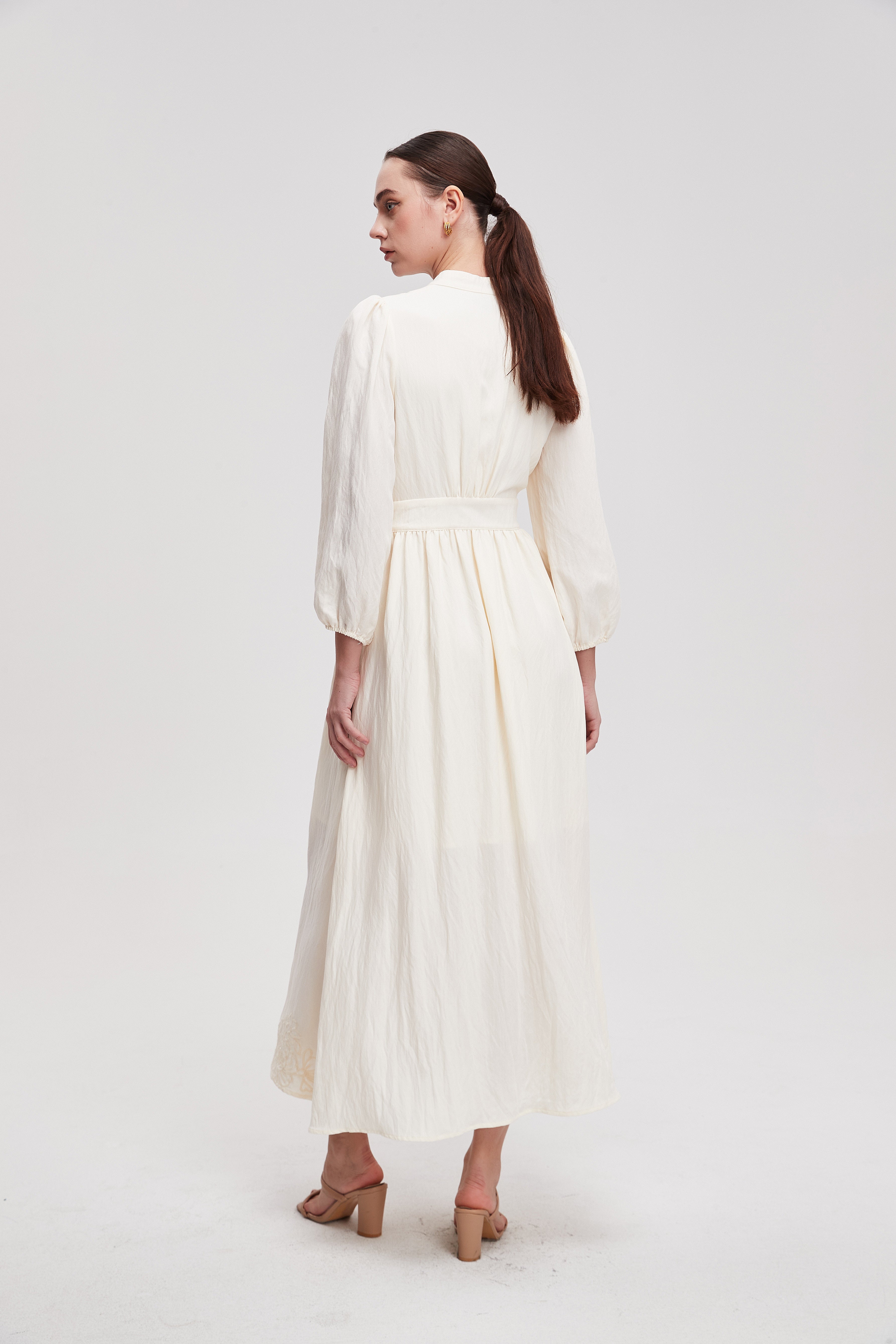 يتكون هذا الفستان من مزيج متناغم من 80% فيسكوز و20% نايلون، مما يمنحه نعومة فائقة وملمساً لطيفاً على البشرة. ينساب القماش بخفة مع الحركة، ويعكس اللون الكريمي إشراقة وهدوءاً، مما يجعله مثالياً لأيامك المفعمة بالنشاط. يتميز بقدرته على التنفس ومقاومته للتجاعيد، ليحافظ على مظهره الأنيق طوال اليوم. استثمار في قطعة تجمع بين الراحة المطلقة والأناقة الدائمة.