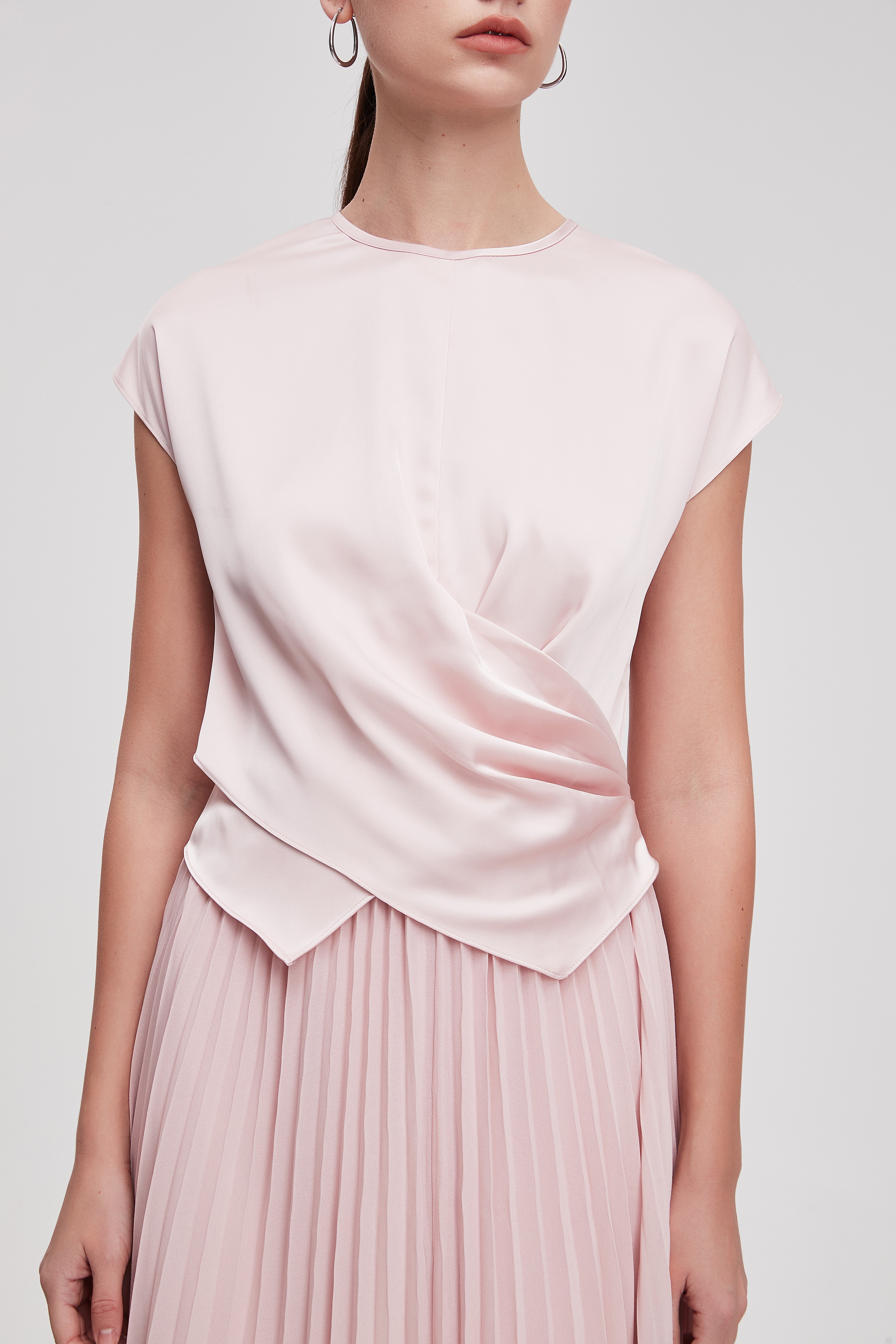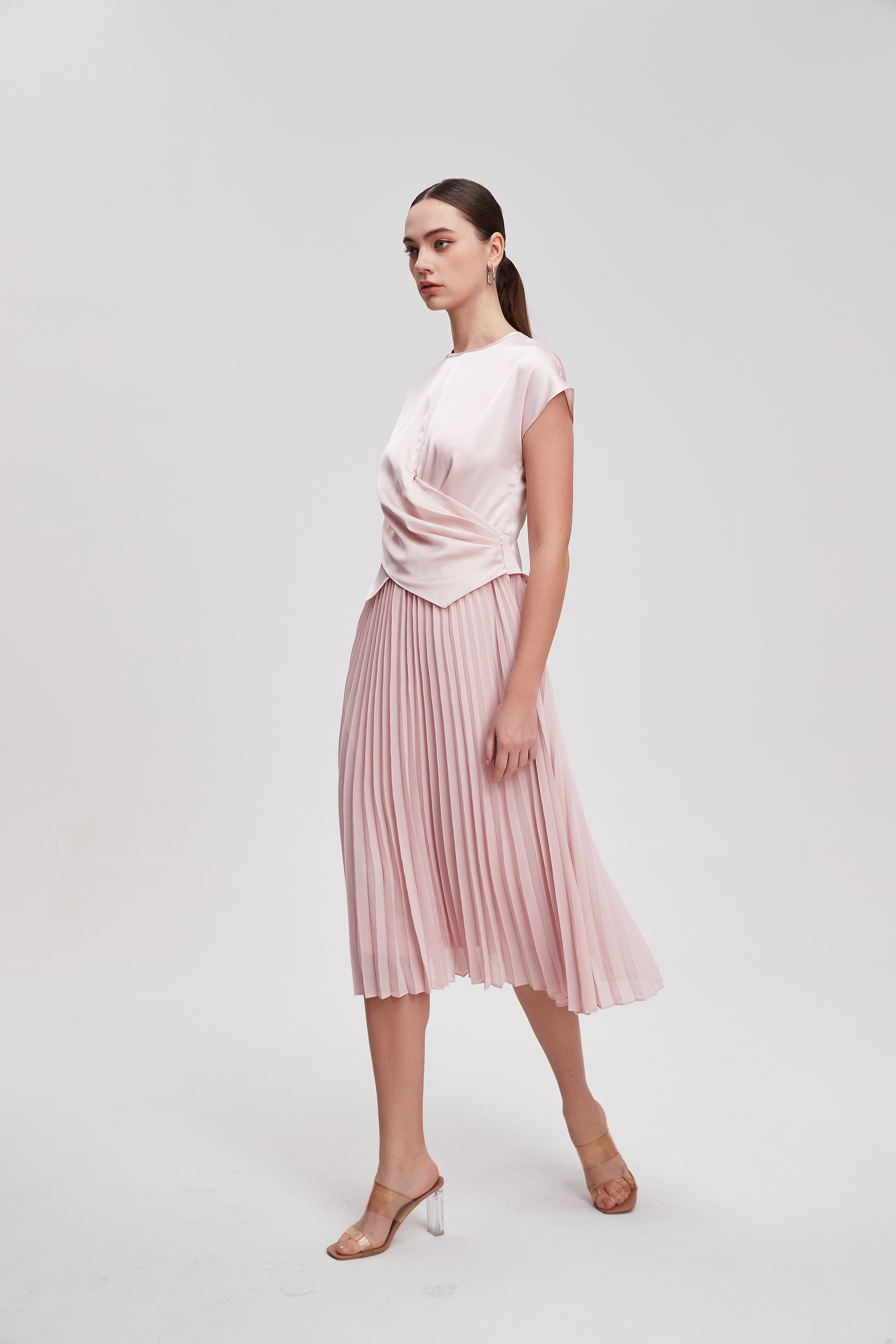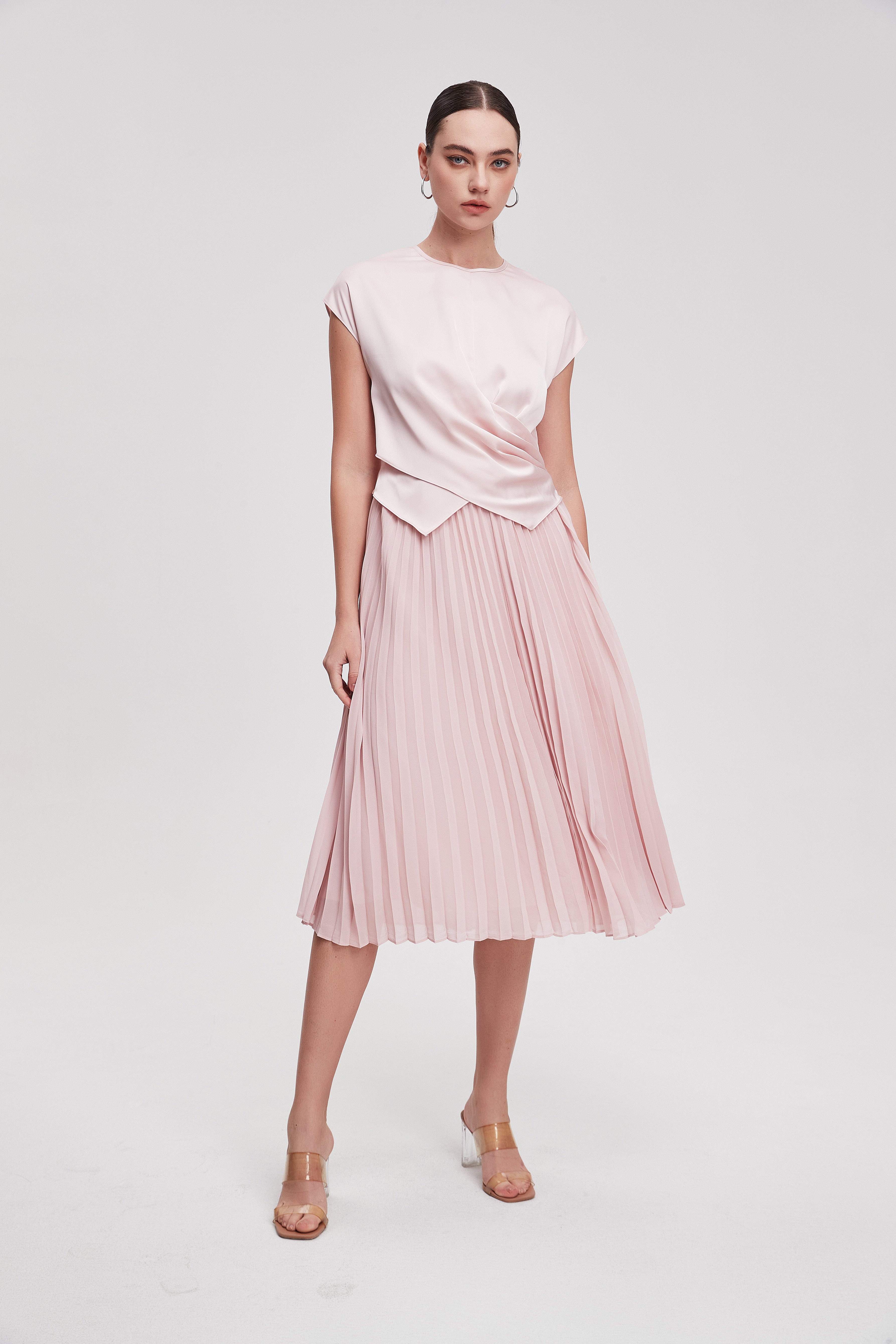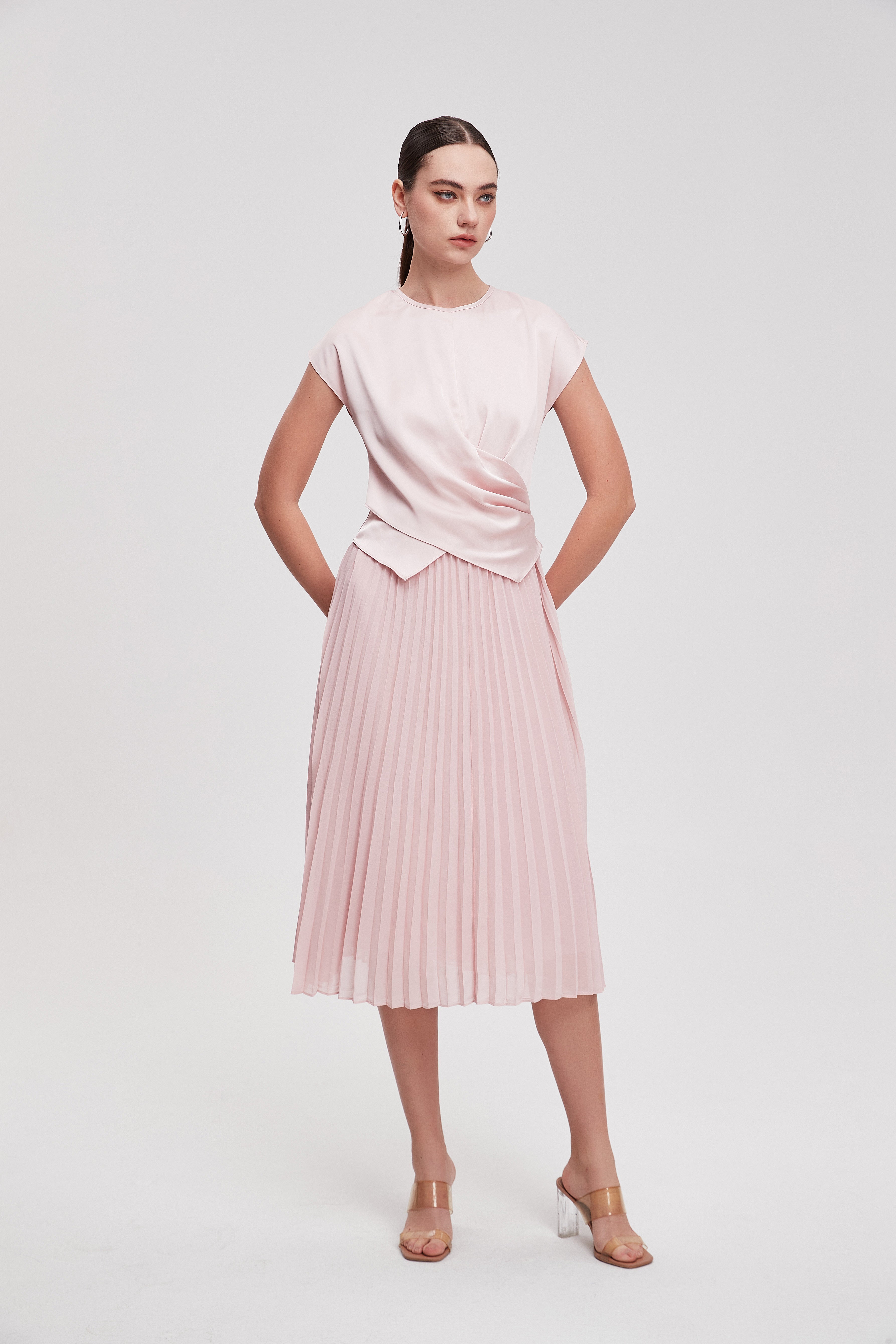 صُنع هذا الفستان بالكامل من البوليستر النقي 100%، مما يمنحه ملمساً ناعماً وانسيابياً ينساب برقة على الجسم. هذه الخامة المعروفة بمتانتها ومقاومتها للتجاعيد، تحتفظ بشكلها ولونها الوردي الفاتح حتى بعد الغسيل المتكرر. توفر تهوية جيدة وتجف بسرعة، مما يجعله خياراً عملياً ومريحاً. استثمار في قطعة تدوم وتوفر راحة طوال اليوم دون التنازل عن الأناقة.