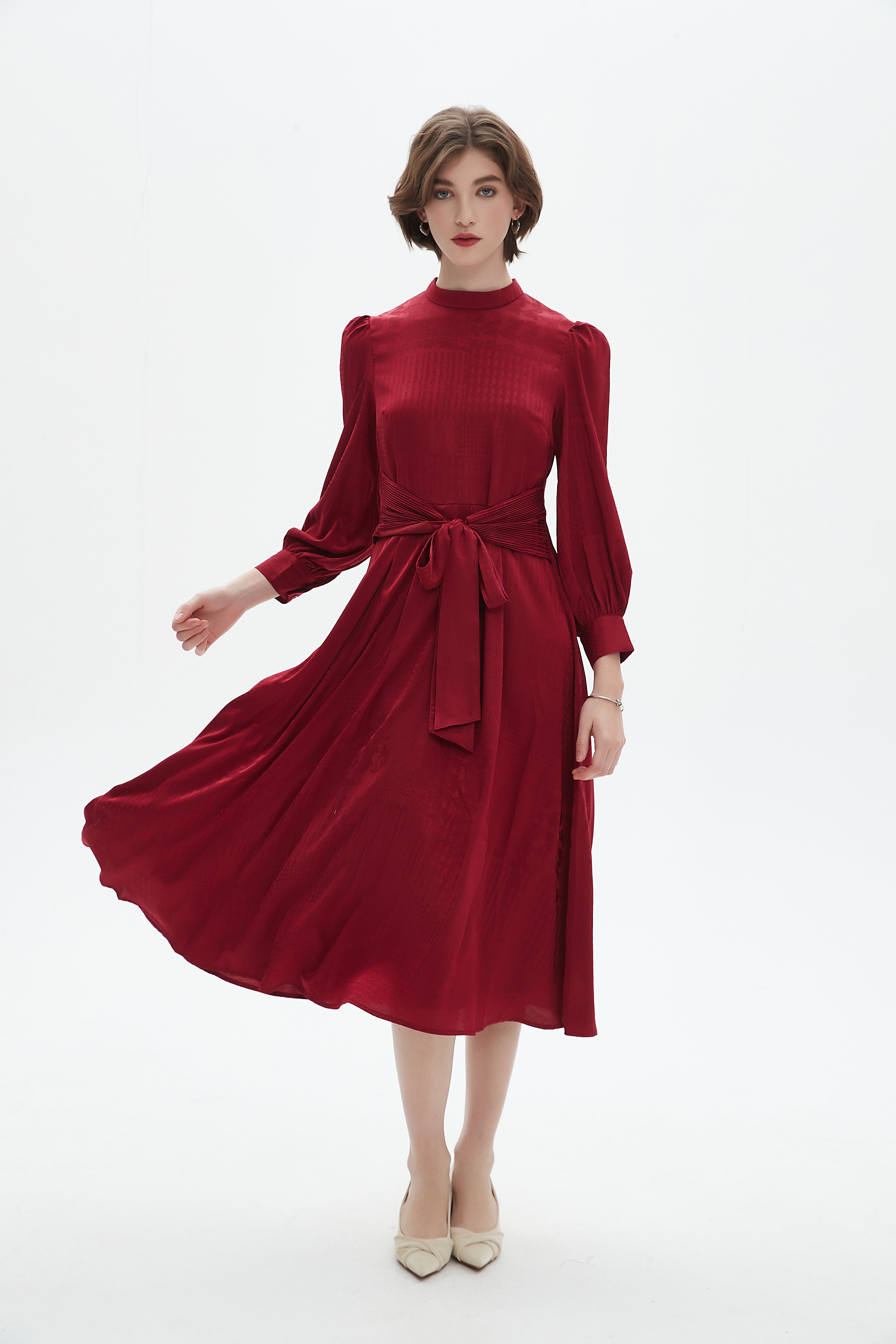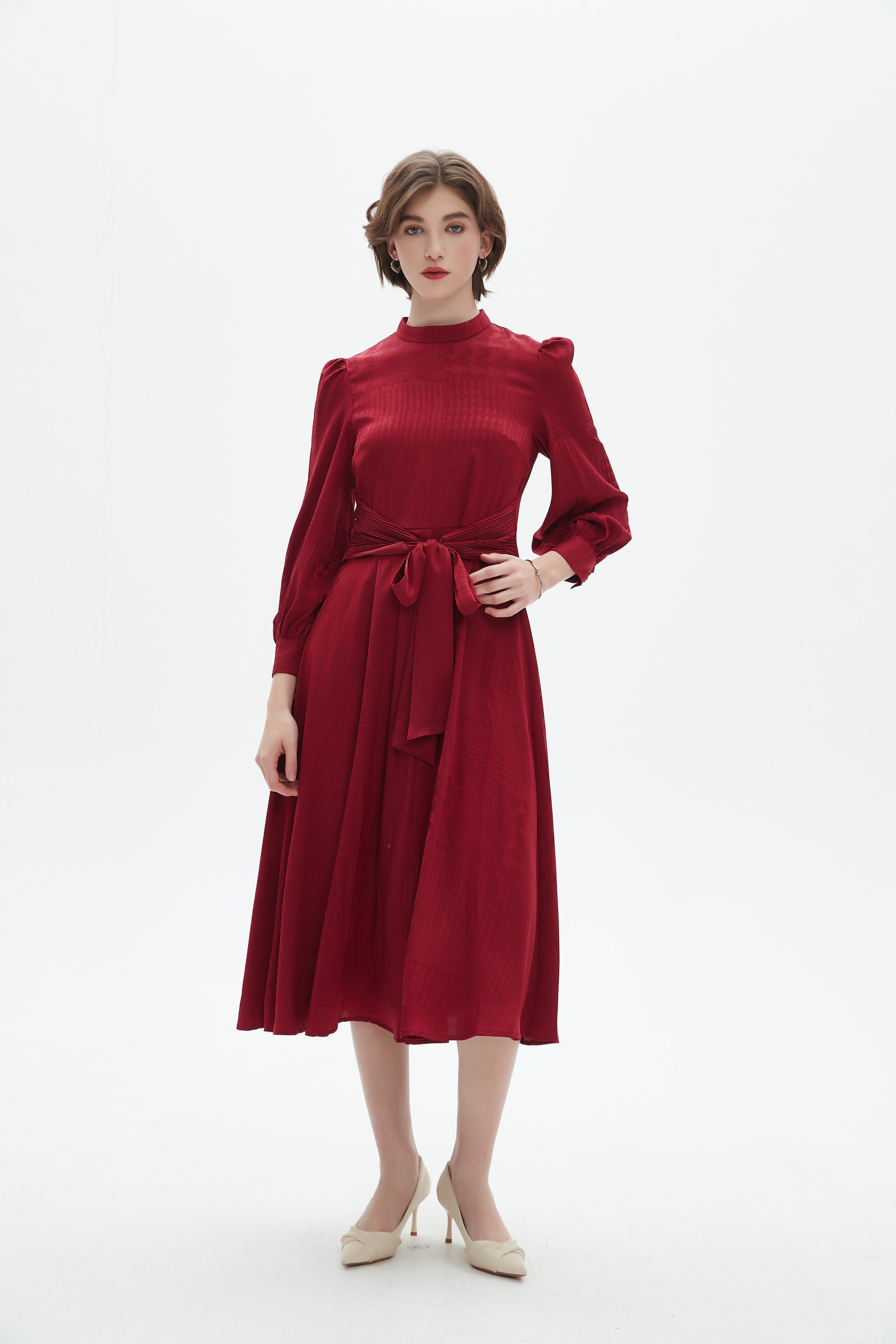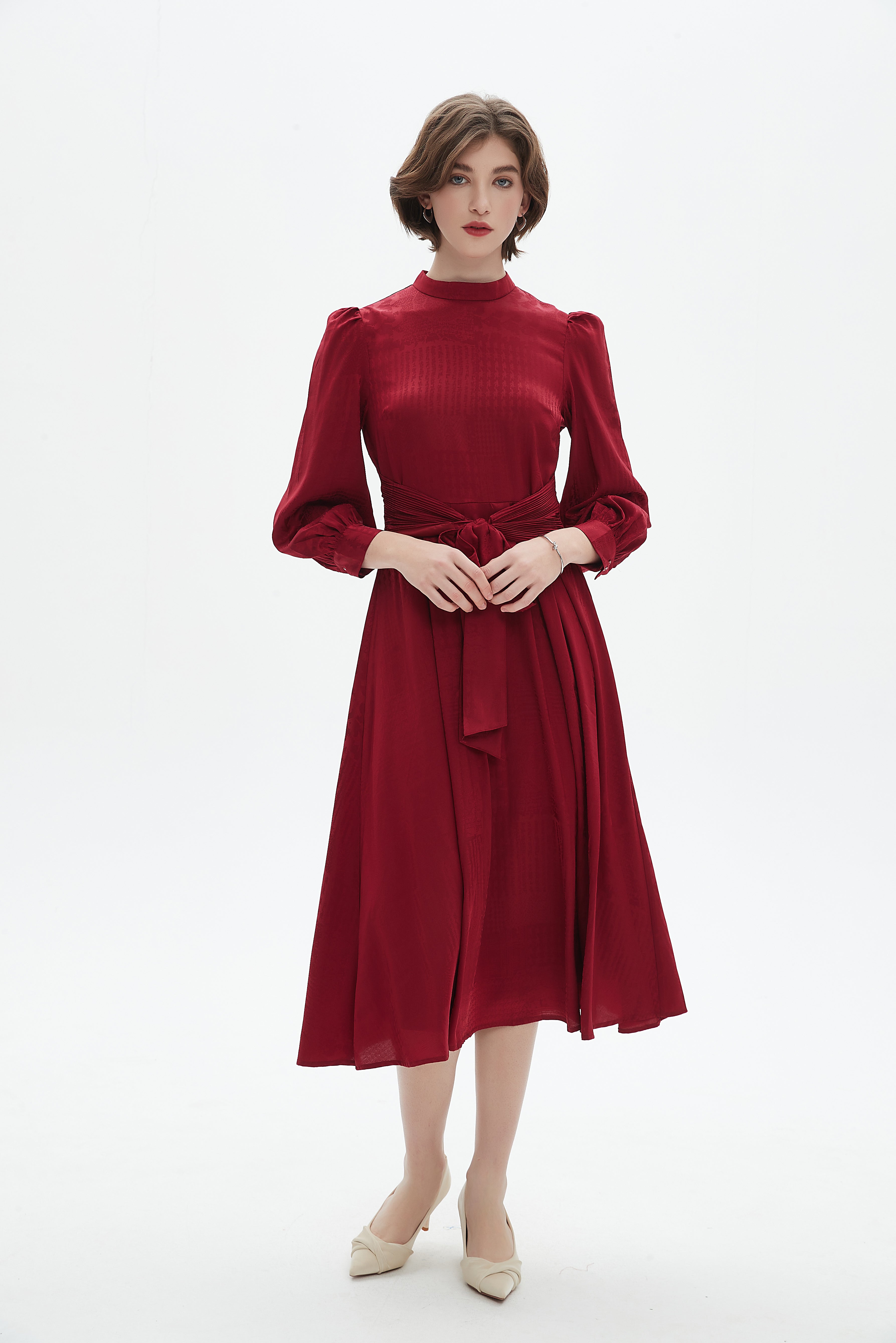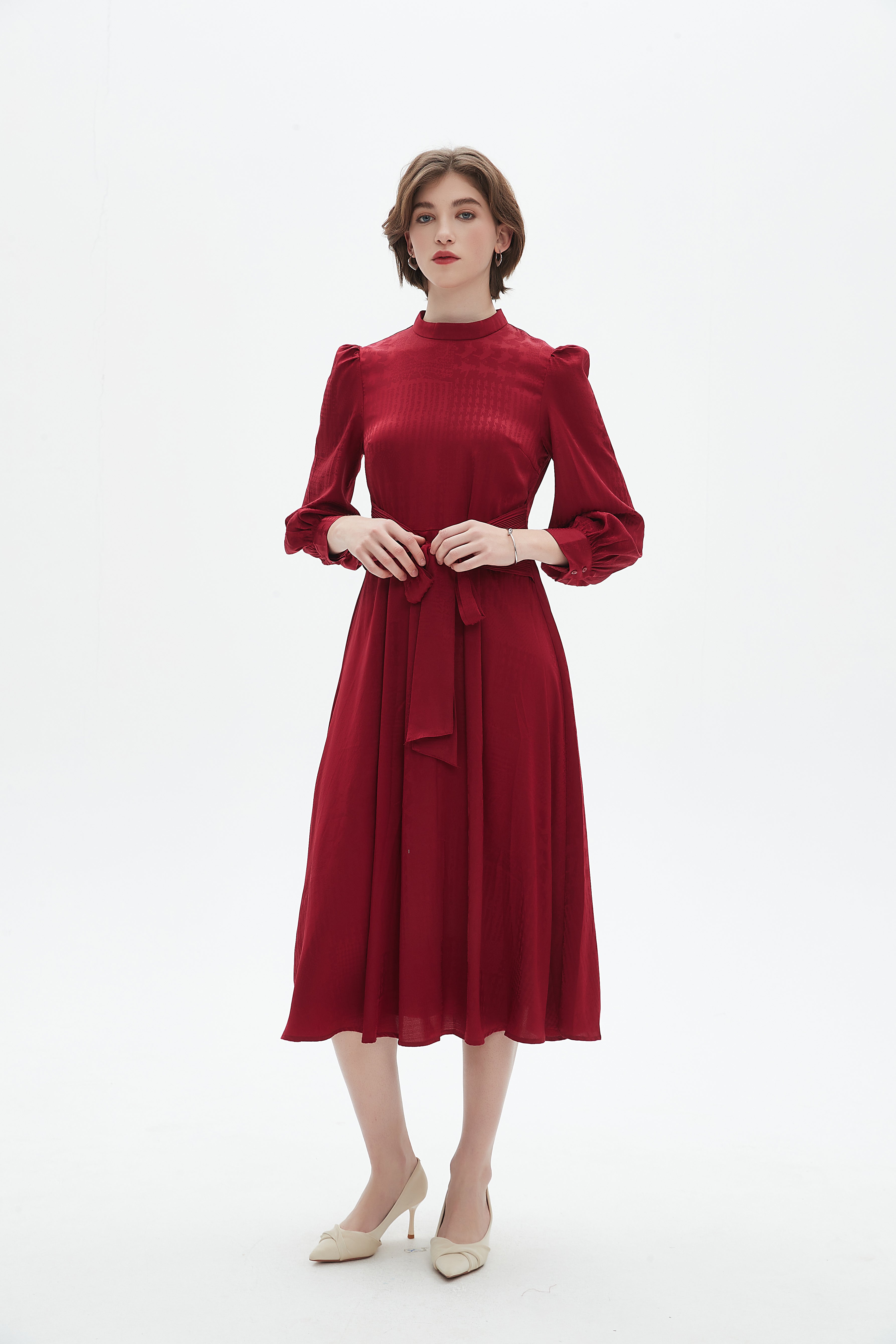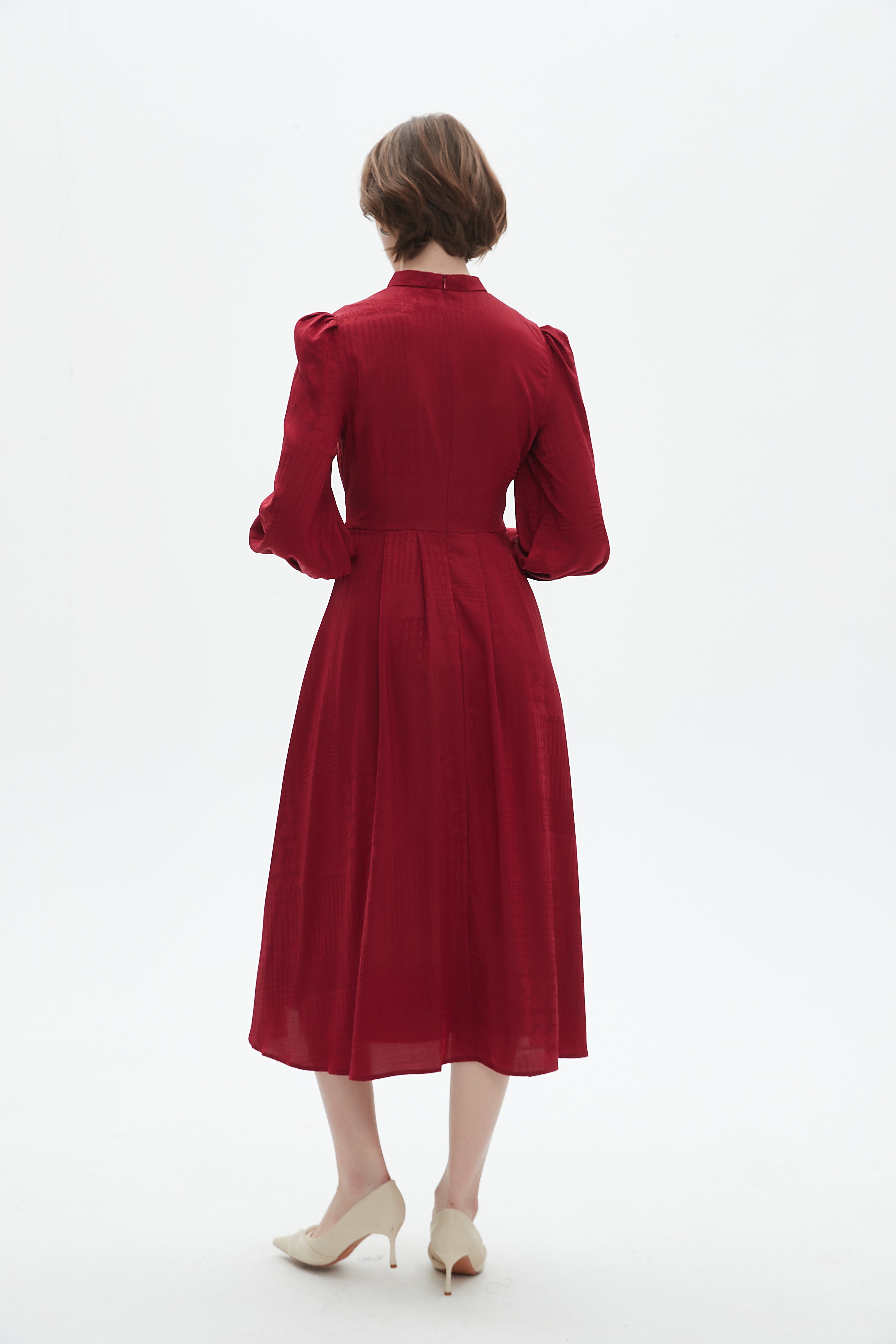 فستان ميدي بأكمام طويلة مكشكش وفتحة رقبة دائرية
