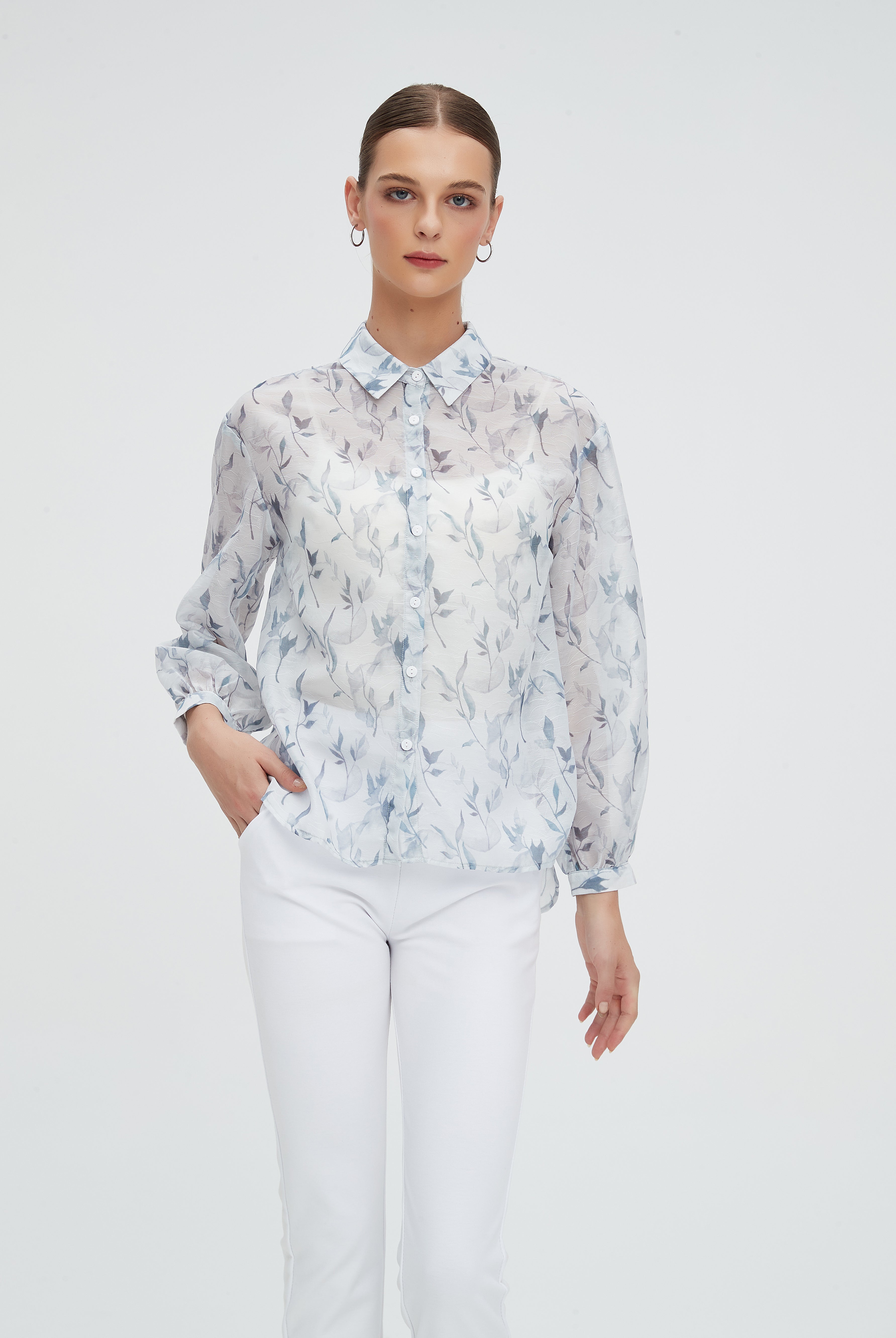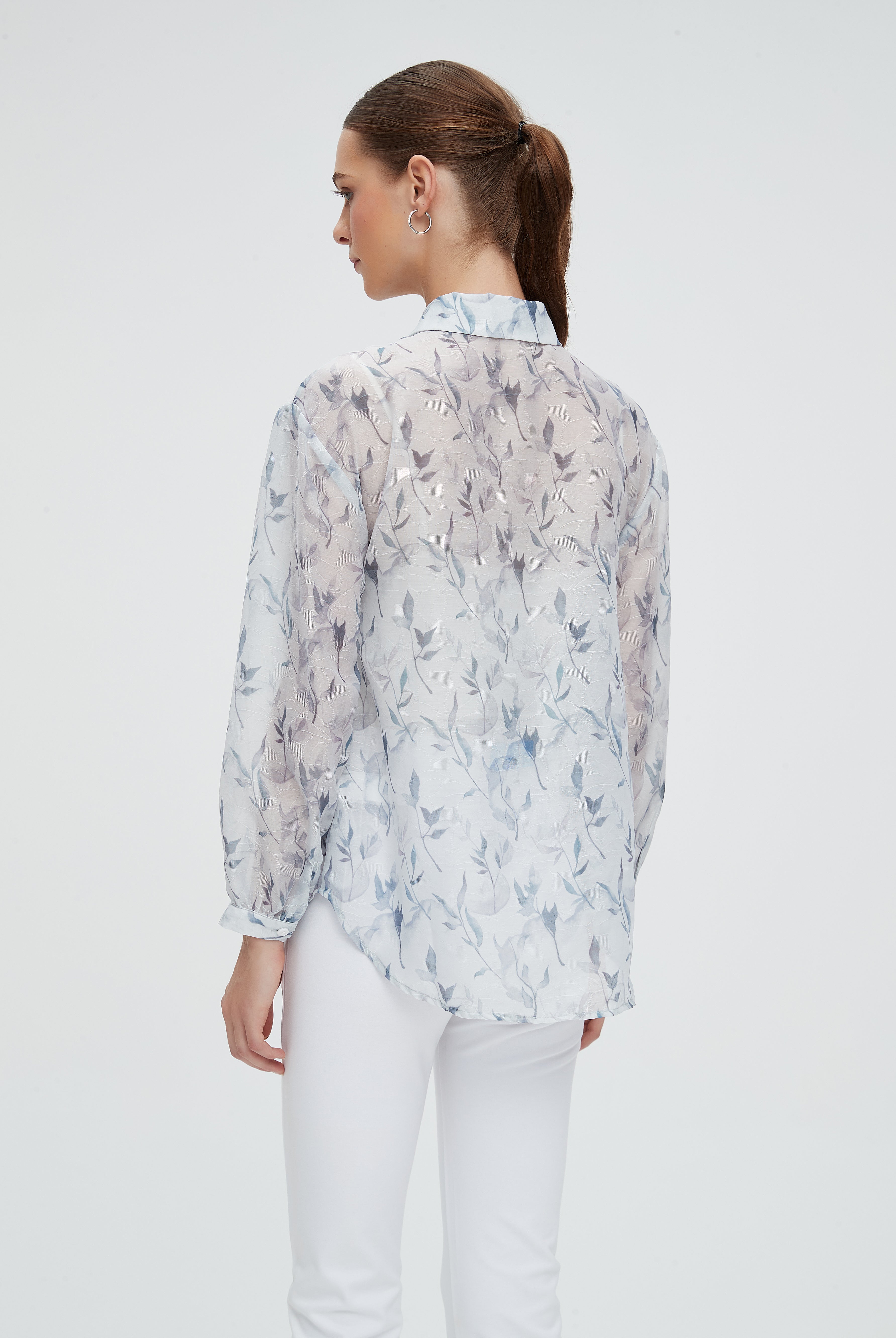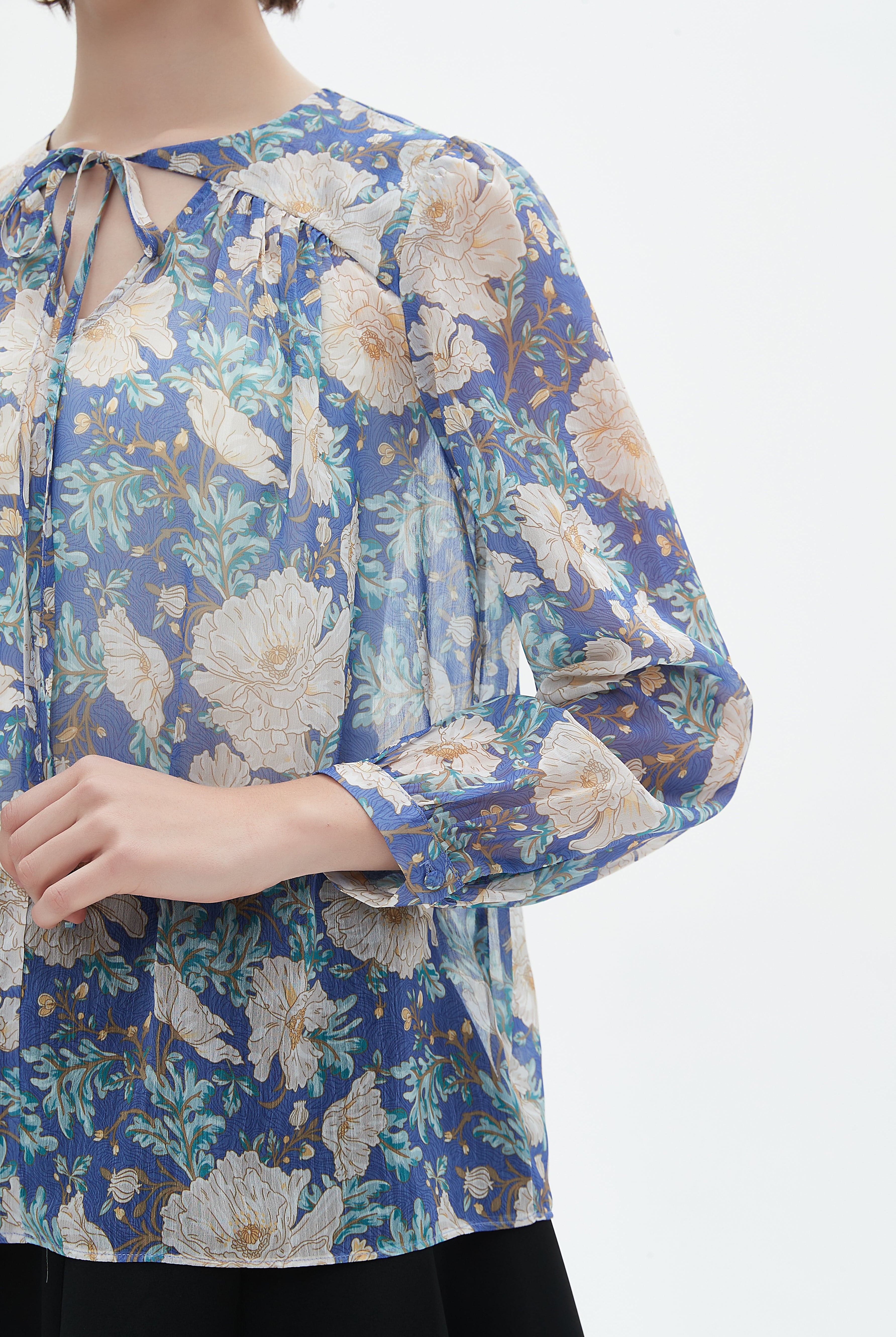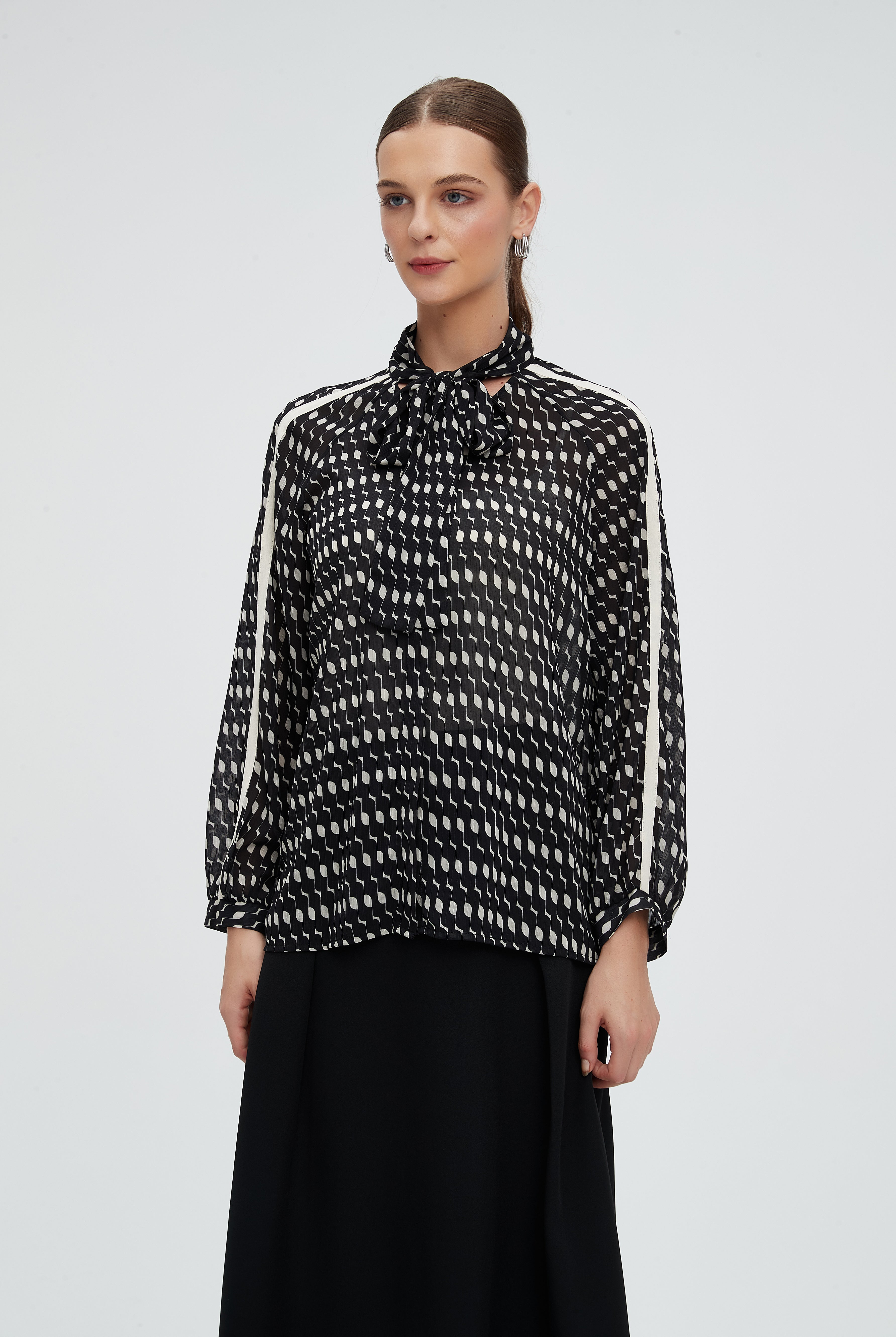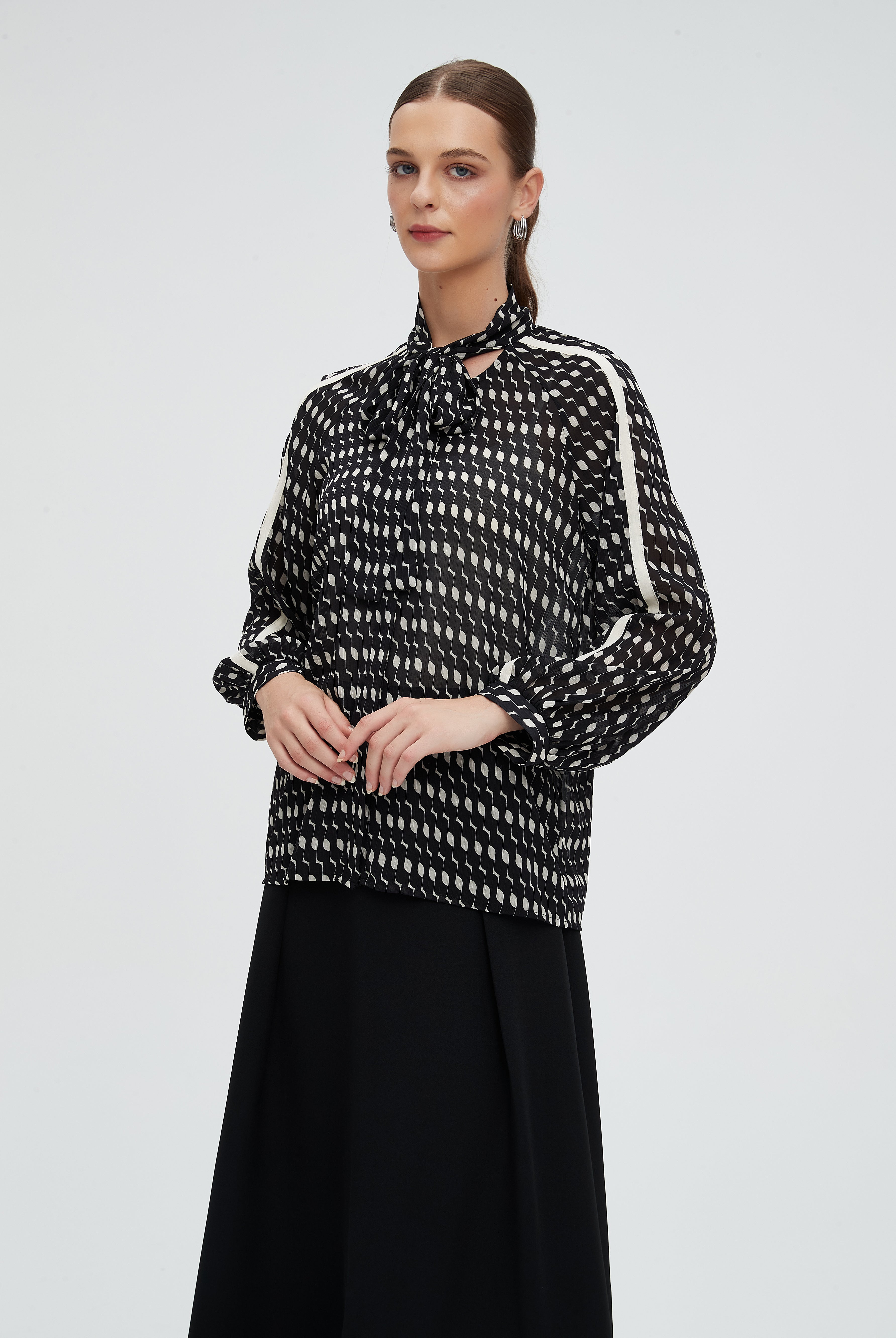 بلوزة نسائية كم طويل بلوزة بطول الخصر مشجرة بتفاصيل شيفون وفتحة رقبة دائرية