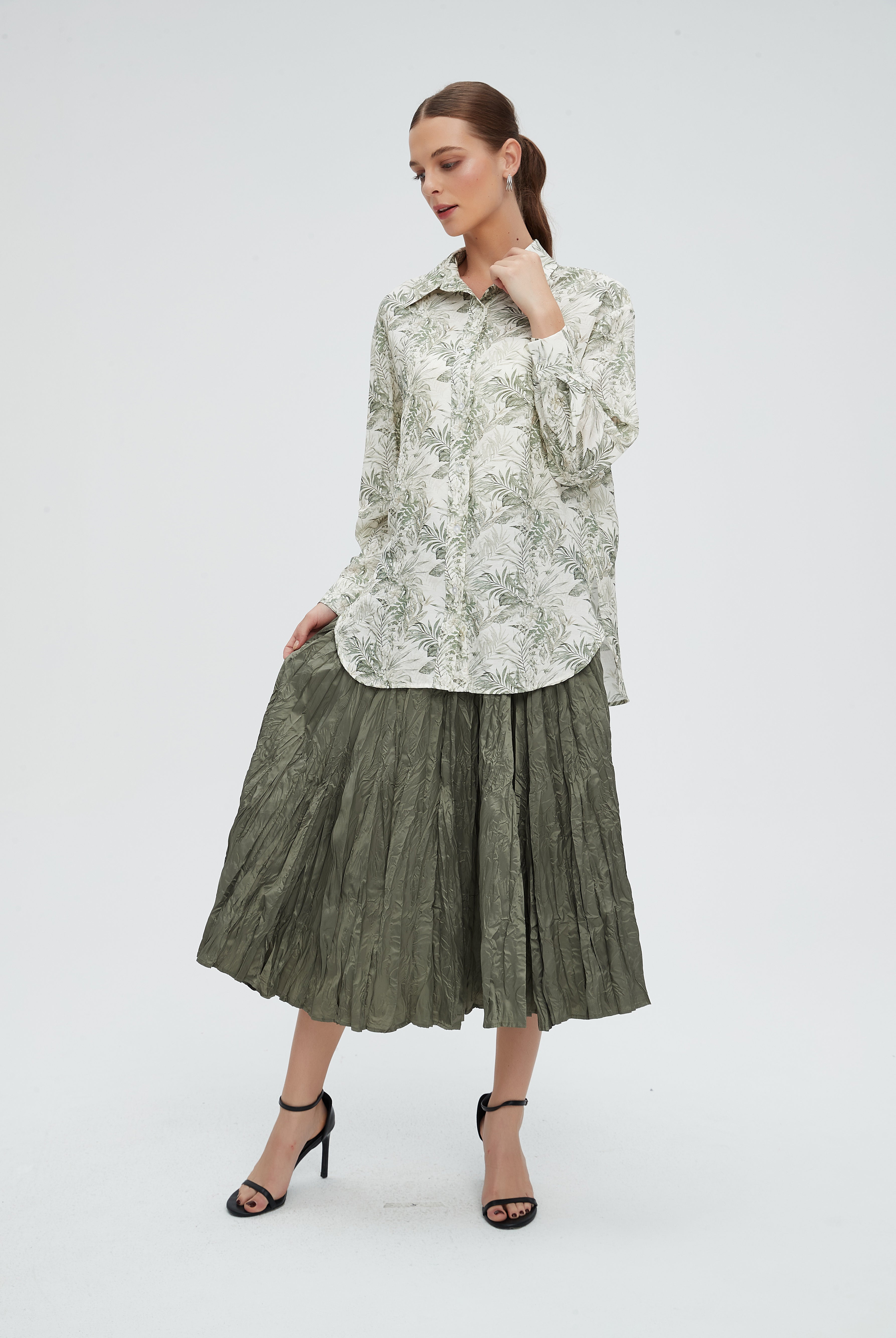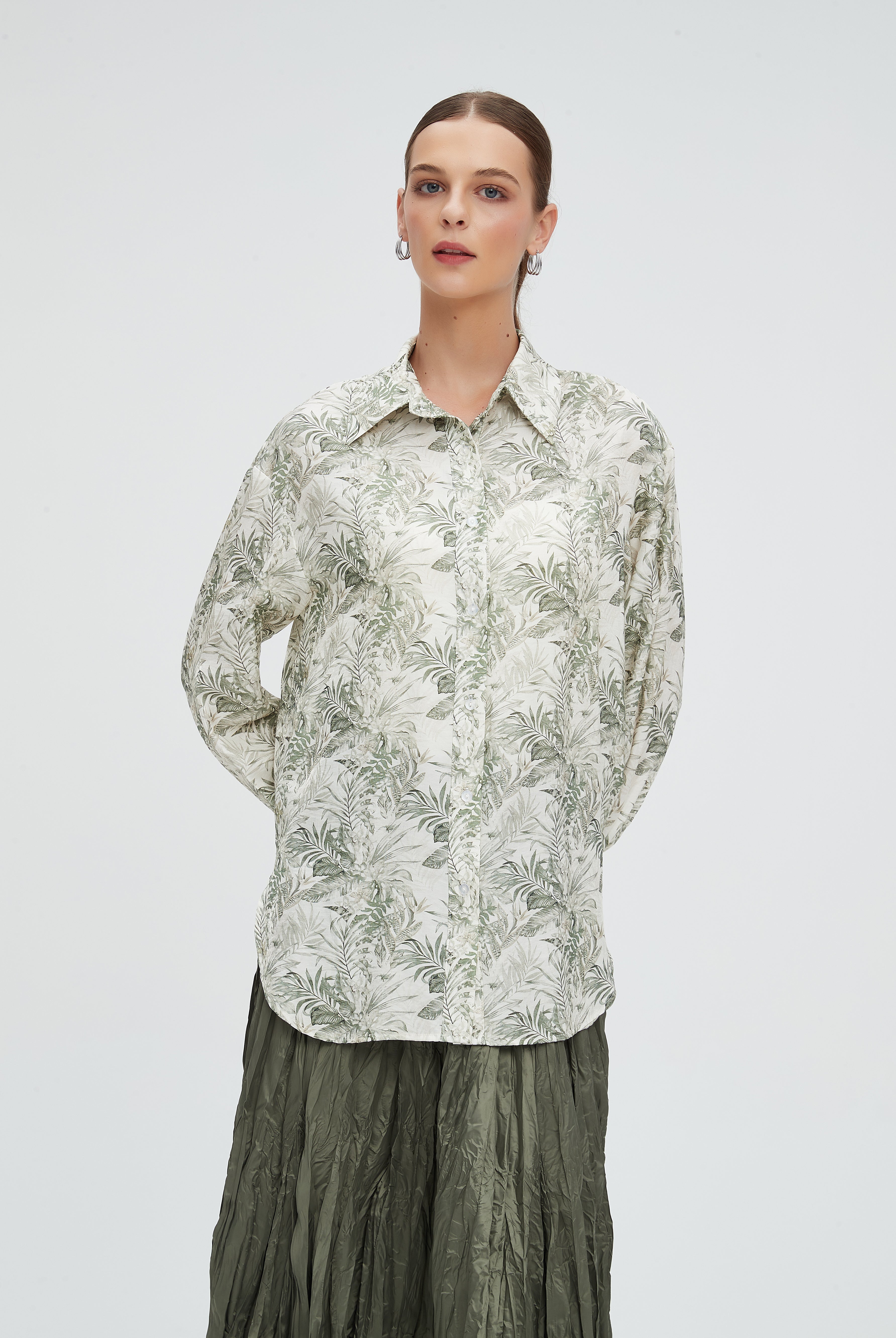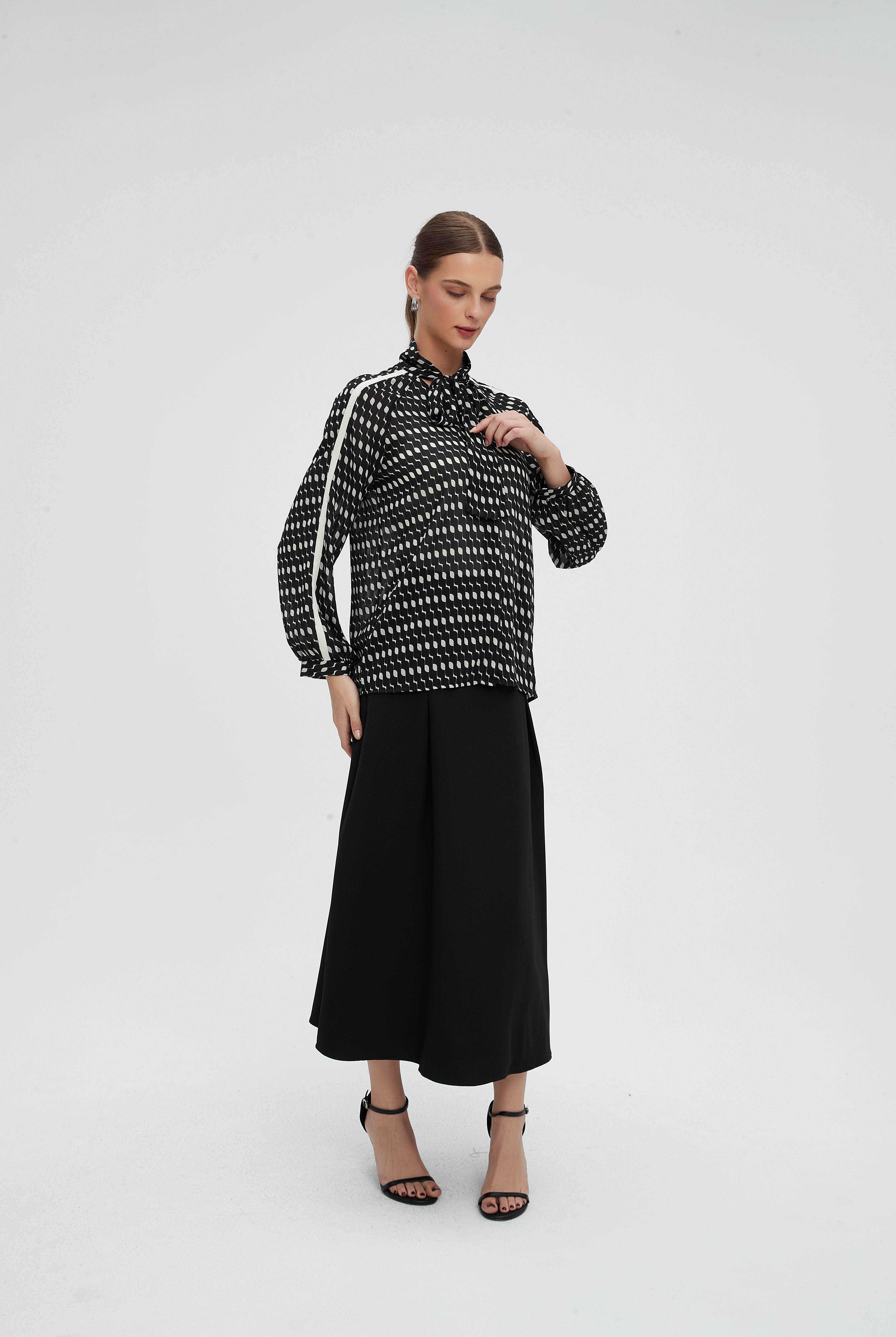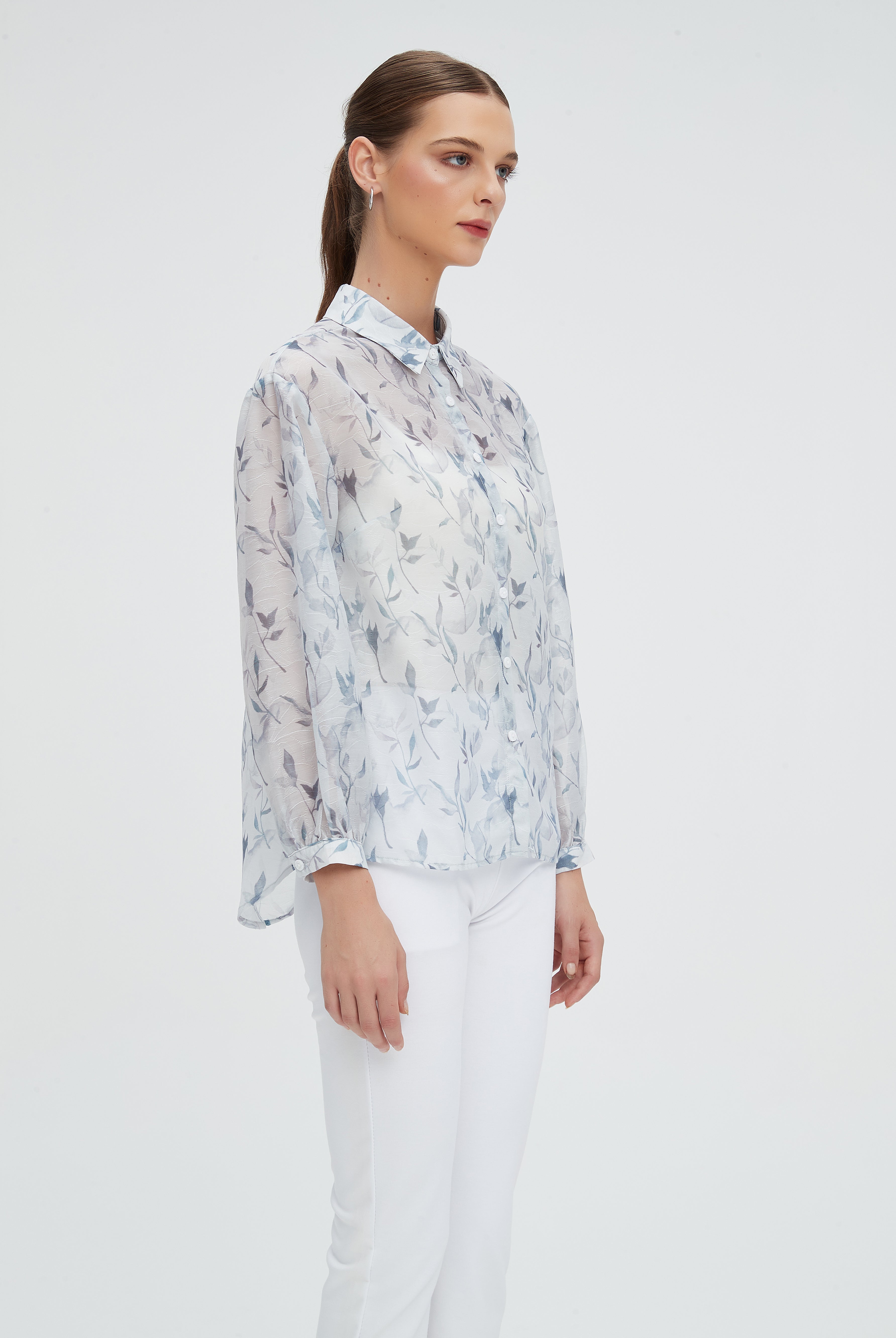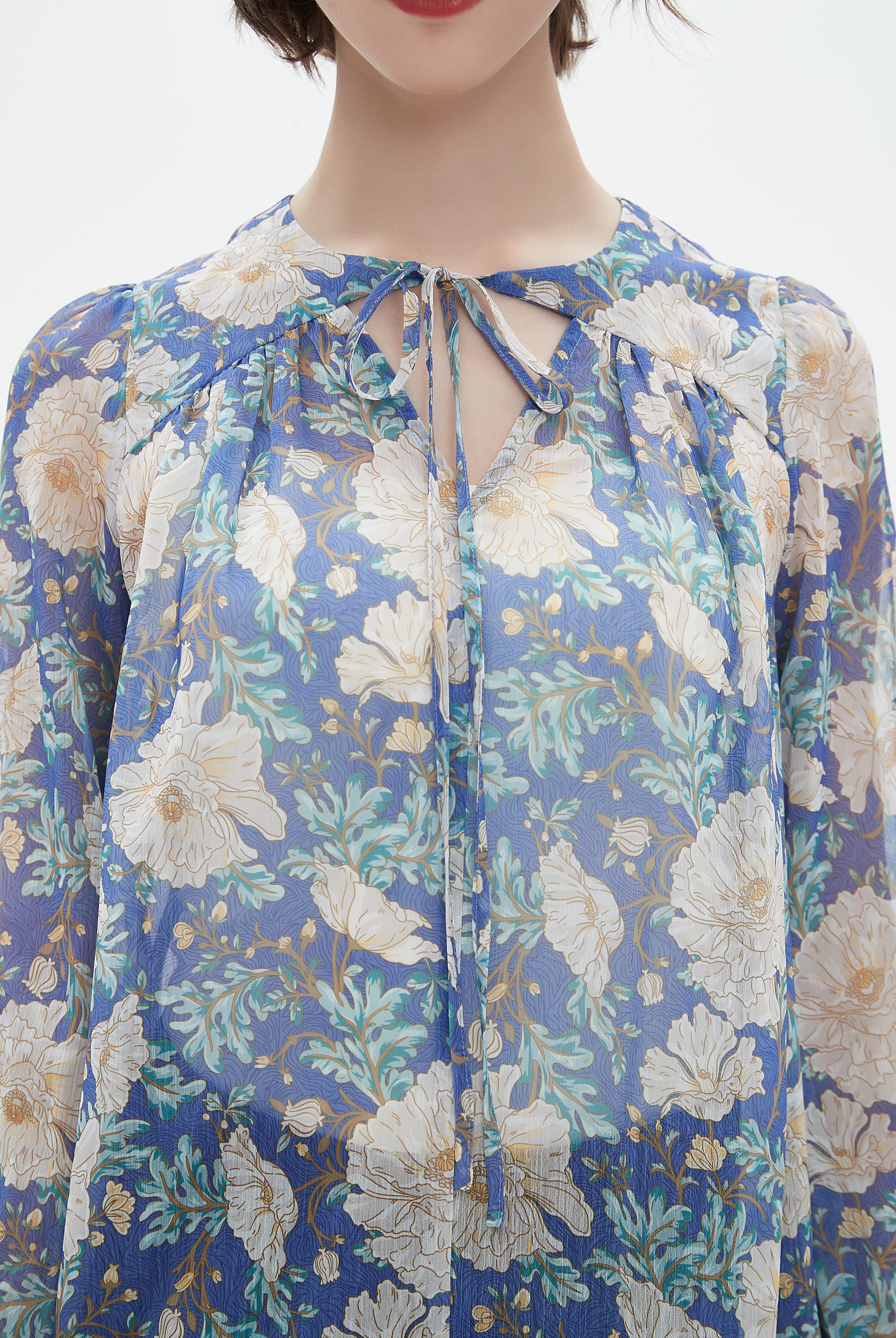 بلوزة نسائية كم طويل بلوزة بطول الخصر مشجرة بتفاصيل شيفون وفتحة رقبة دائرية