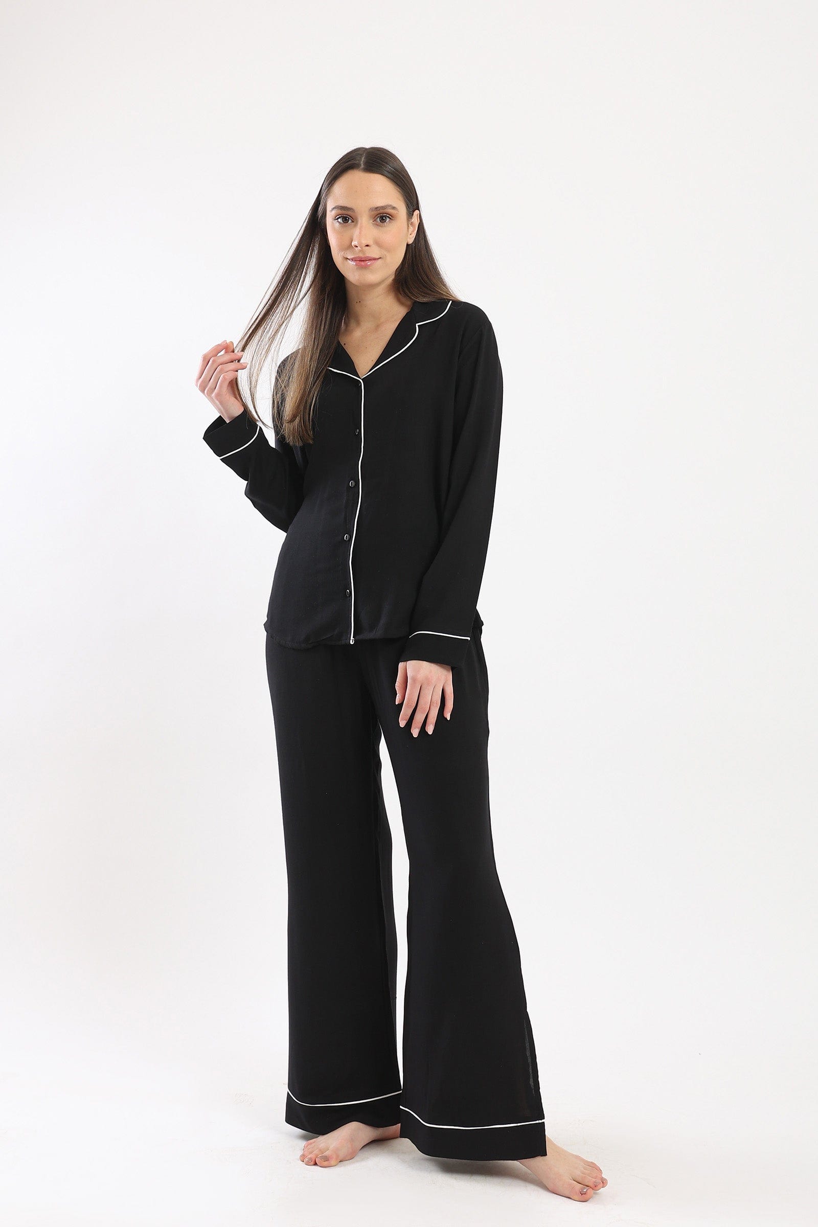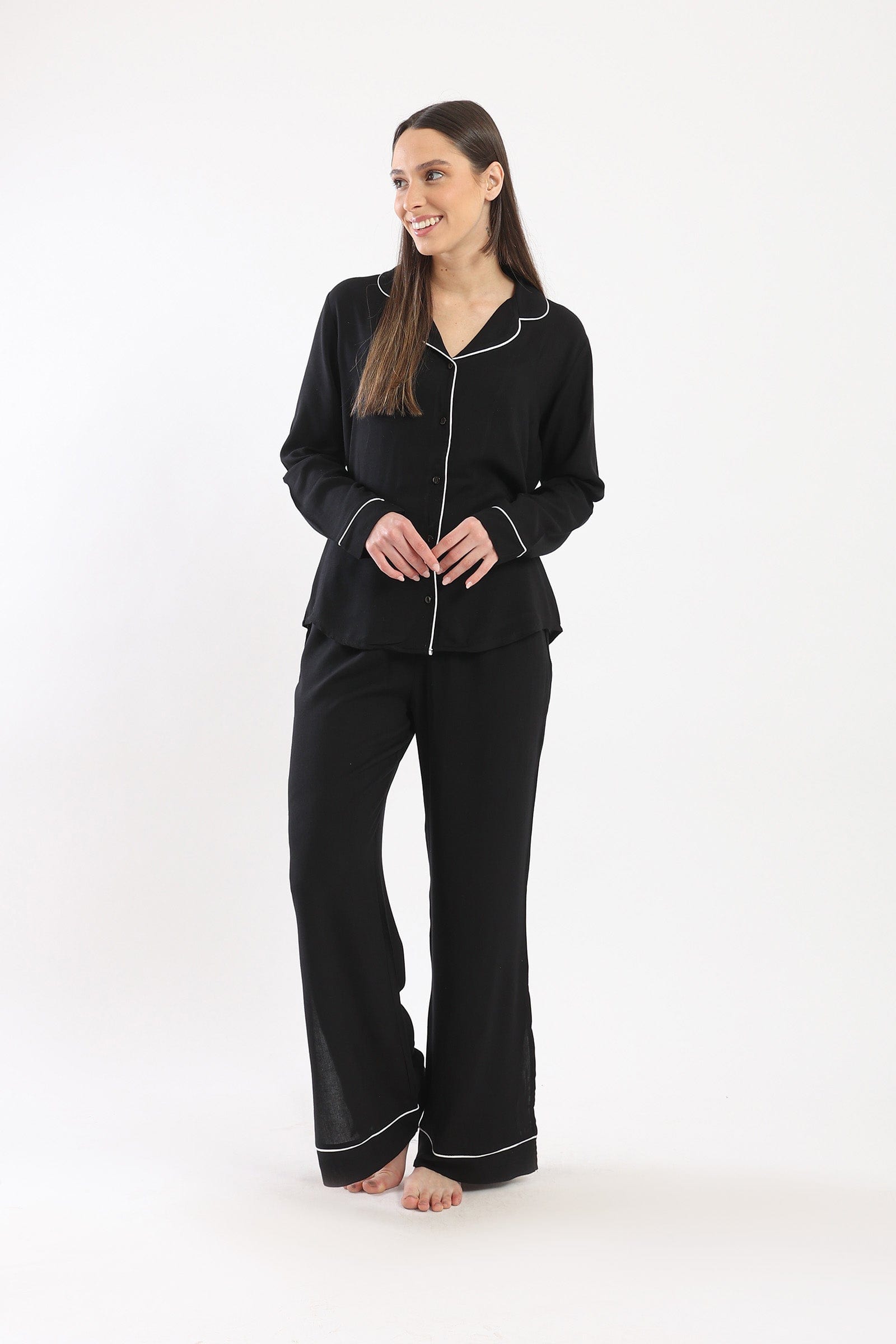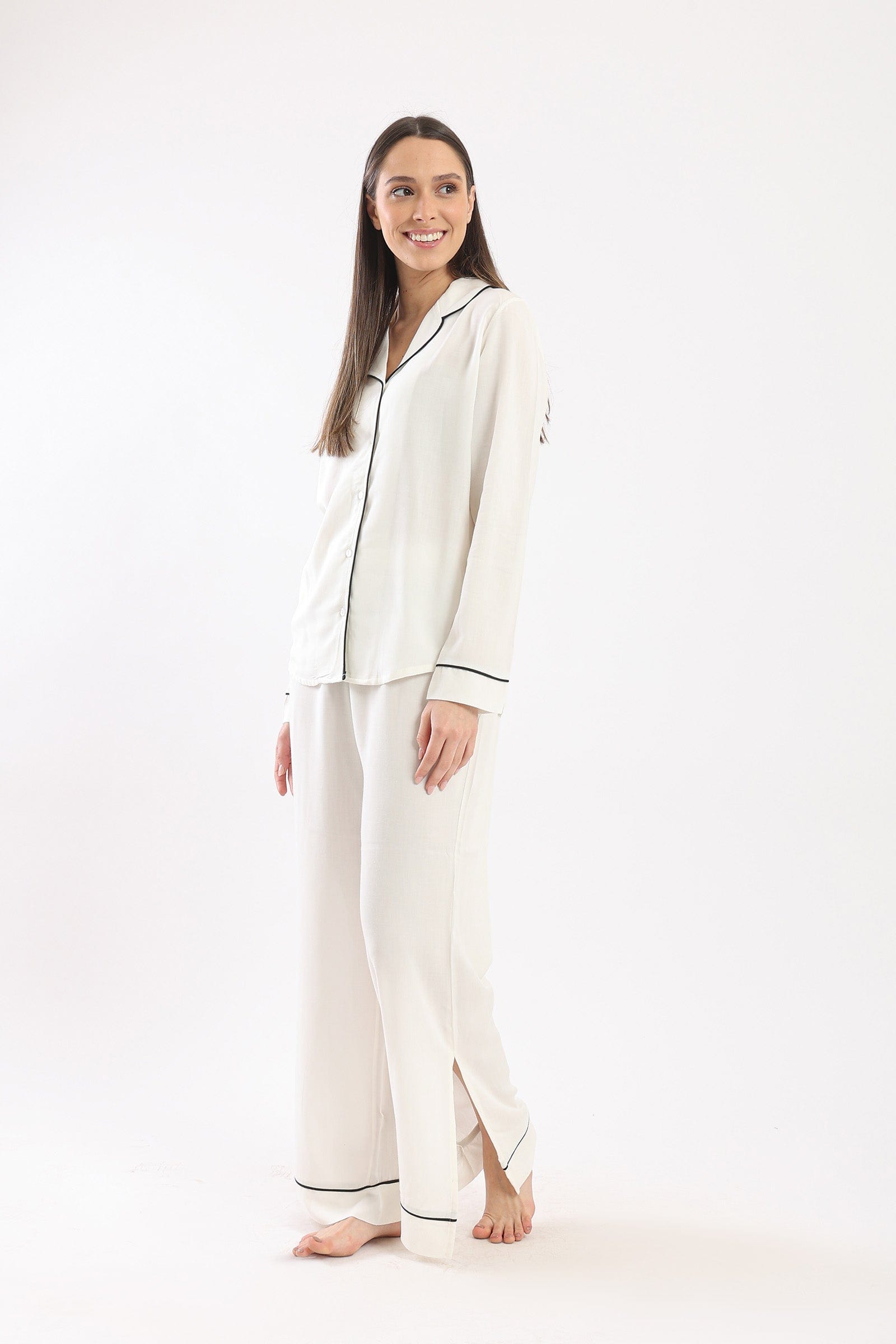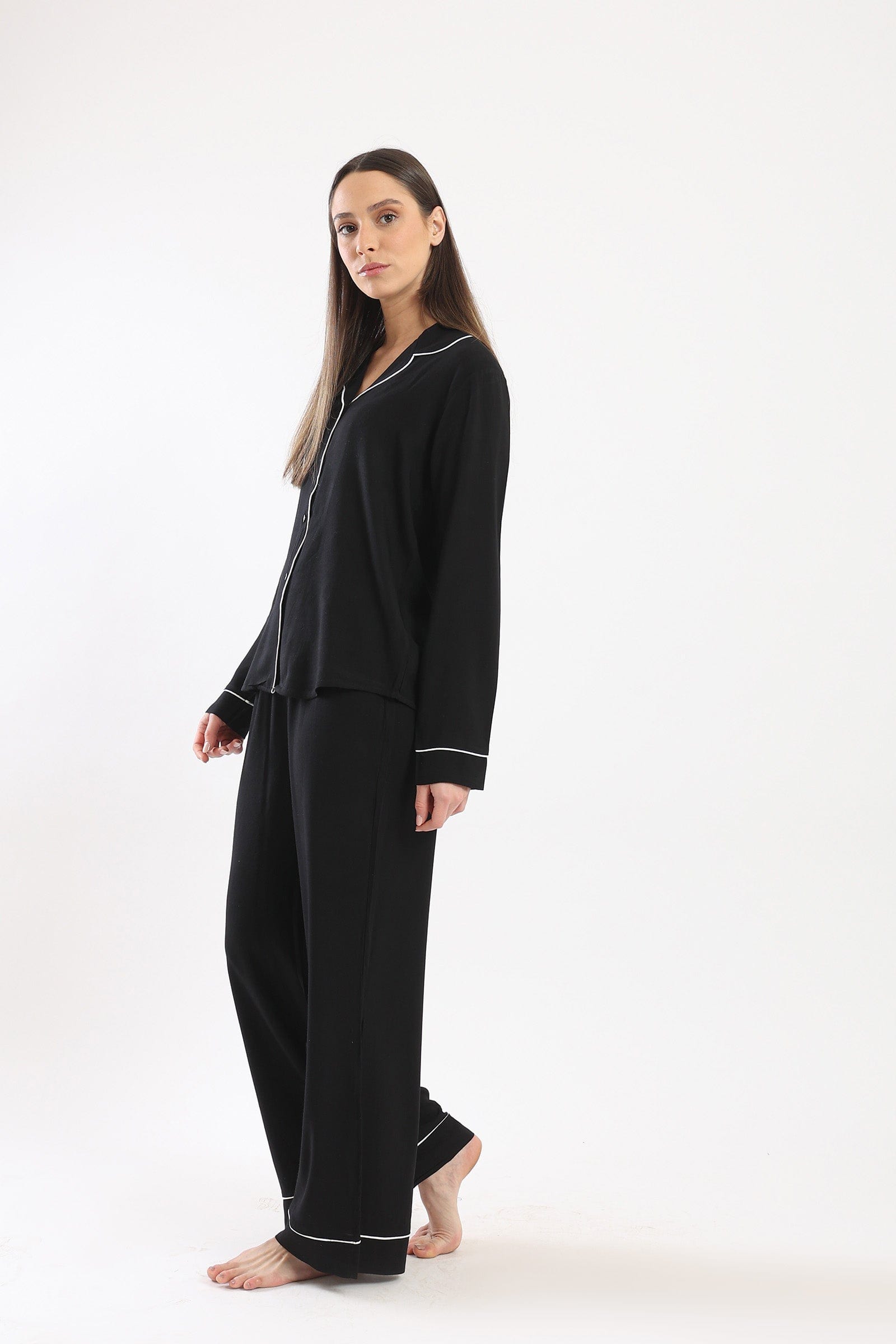 طقم بيجامة بلوزة كم طويل وبنطلون سادة