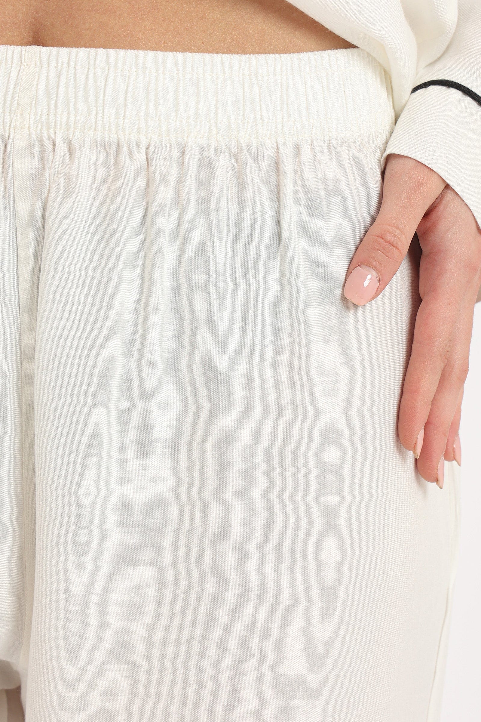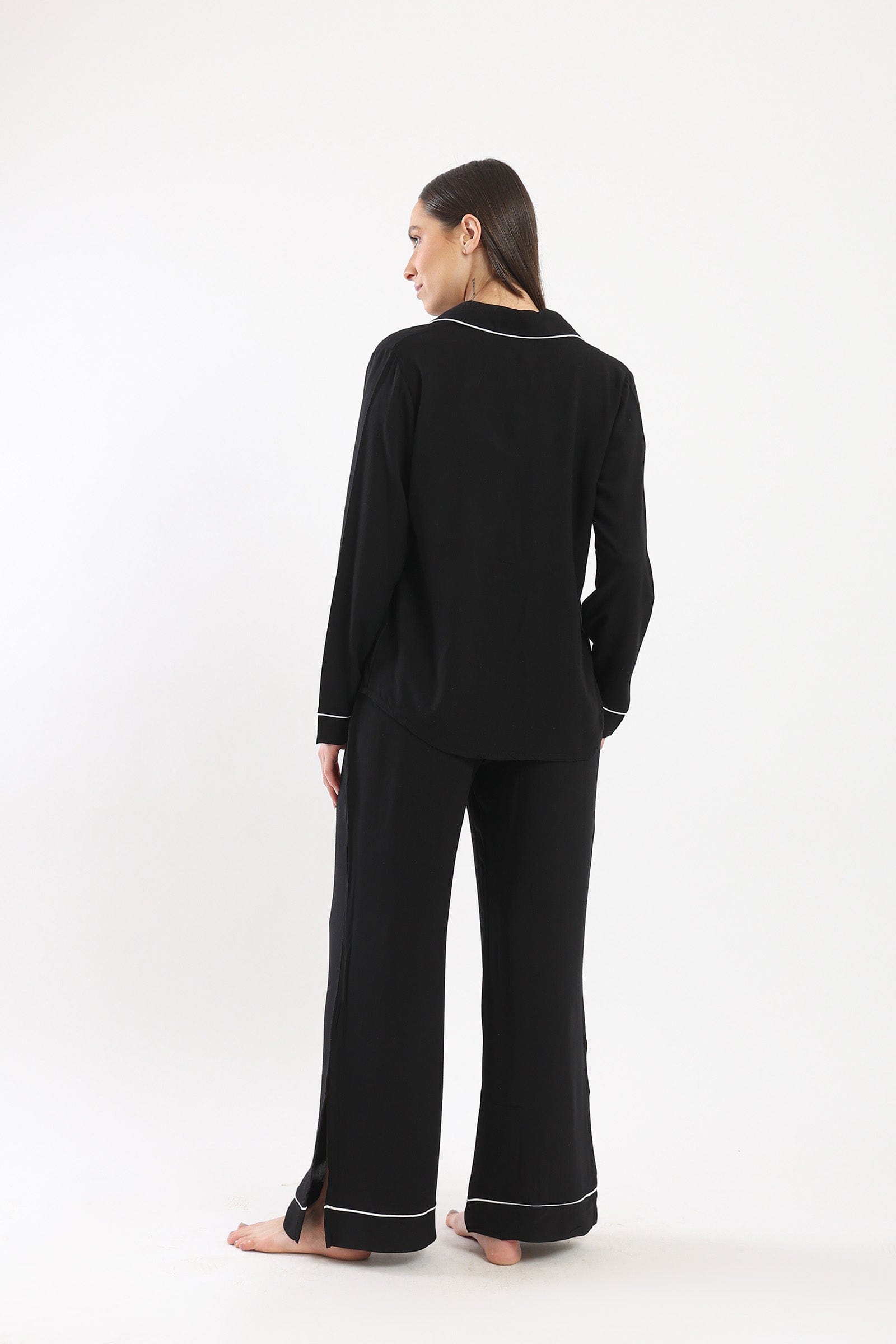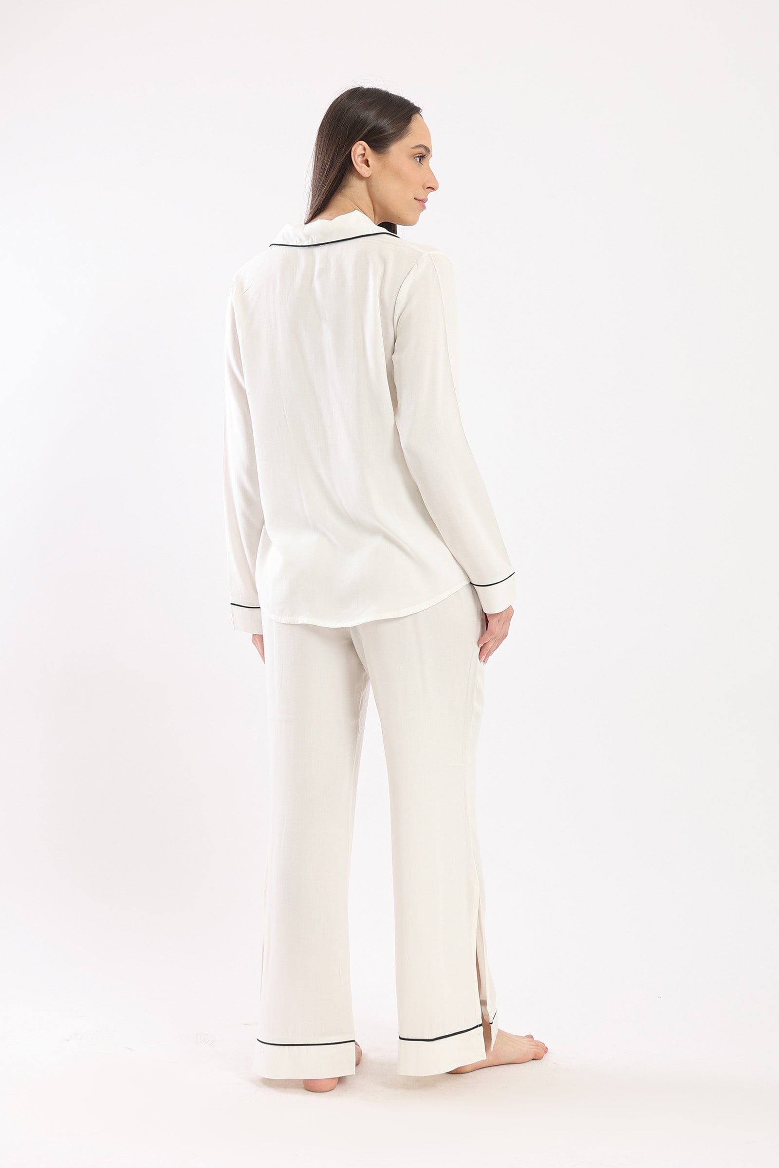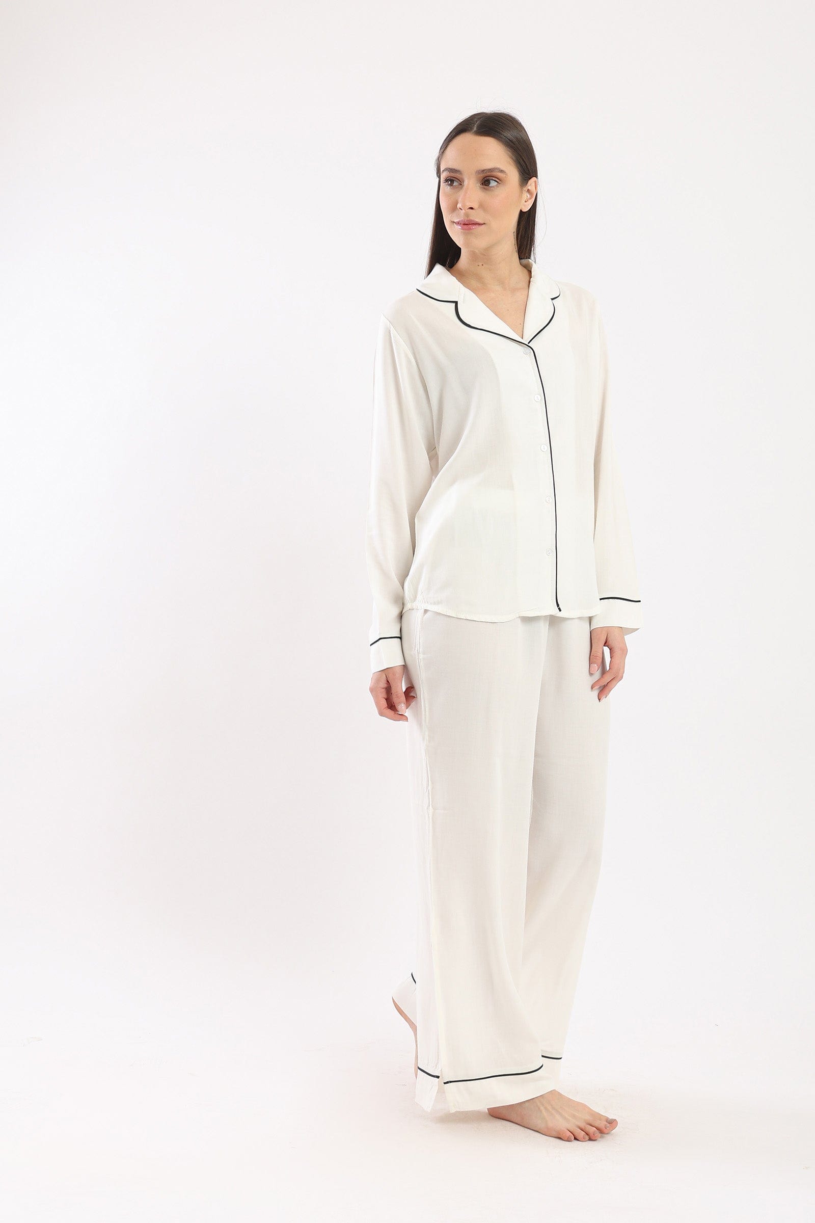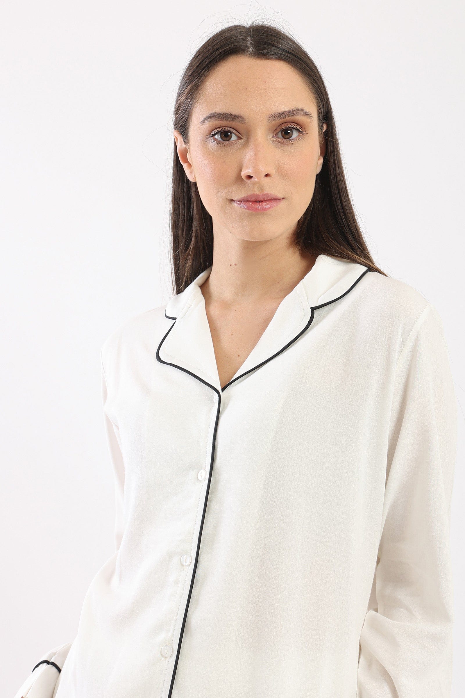 استعدي للراحة والأناقة مع طقم بيجامة بلوزة كم طويل وبنطلون سادة من كارينا. يأتي هذا الطقم بتصميم مريح وعصري، مما يجعله الخيار المثالي للإسترخاء في المنزل. يتميز بيجامتنا ببلوزة طويلة الأكمام وبنطلون سادة بتفاصيل ناعمة وراحة فائقة. يتوفر في ألوان جذابة باللون الأسود والأوف وايت، لتتمكني من اختيار اللون الذي يناسب ذوقك الفريد. احصلي الآن على طقم بيجامة بلوزة كم طويل وبنطلون سادة من كارينا واستمتعي بليالي مريحة وأنيقة. اطلبيه الآن عبر فاشن السعودية! Get ready to relax in style with our Carina Long-Sleeve Blouse and Solid Pants Pajama Set. This set is perfect for a cozy night's sleep or lounging around the house. The blouse features long sleeves and a comfortable fit, while the pants are solid in color, giving you a sleek and modern look. Choose between two classic colors: black and off-white, to match your personal style. Made with high-quality materials, this pajama set is designed to provide both comfort and durability. Don't miss out on this stylish and comfortable pajama set. رقم المنتج: 54294