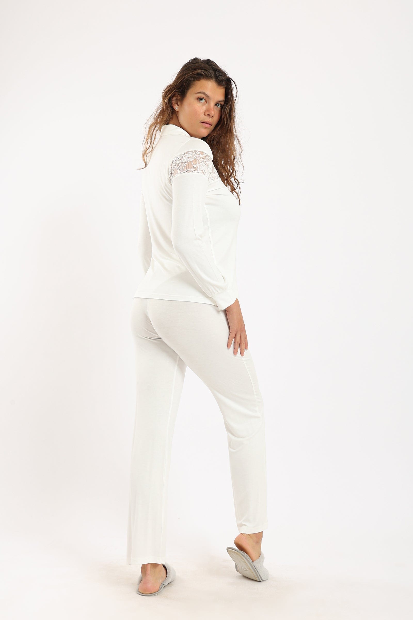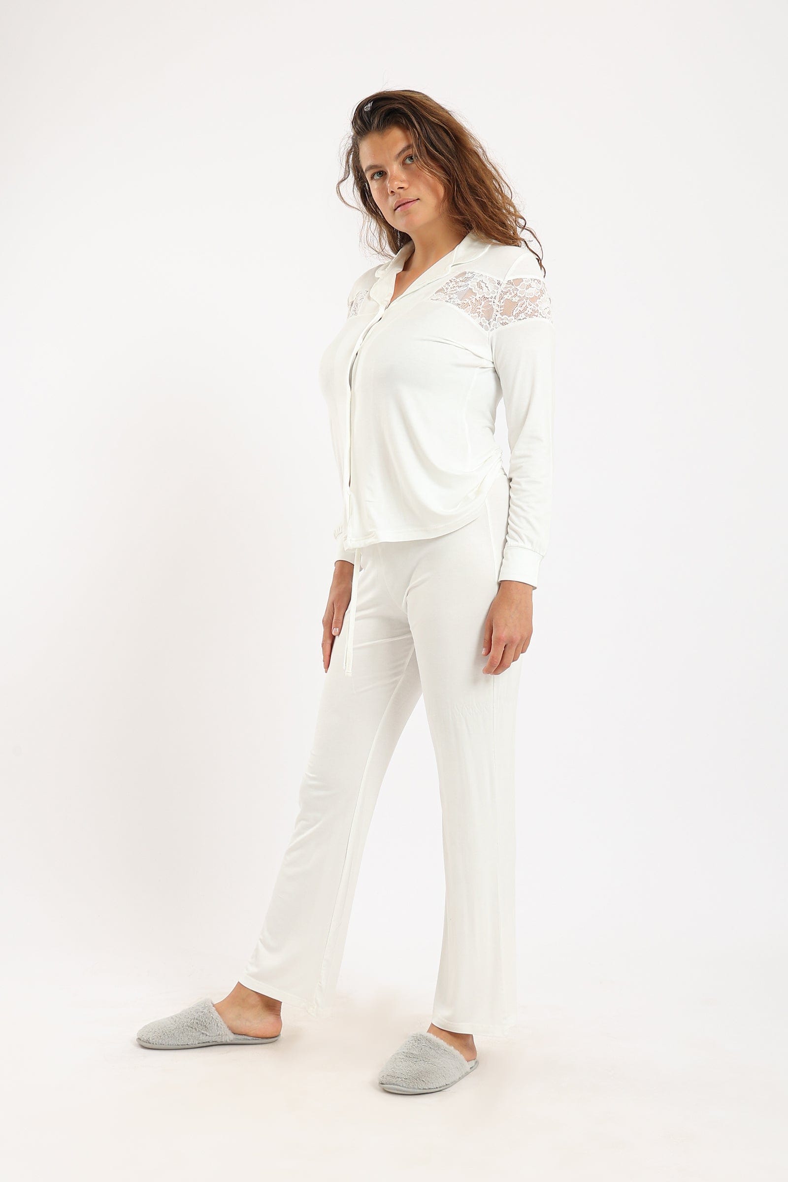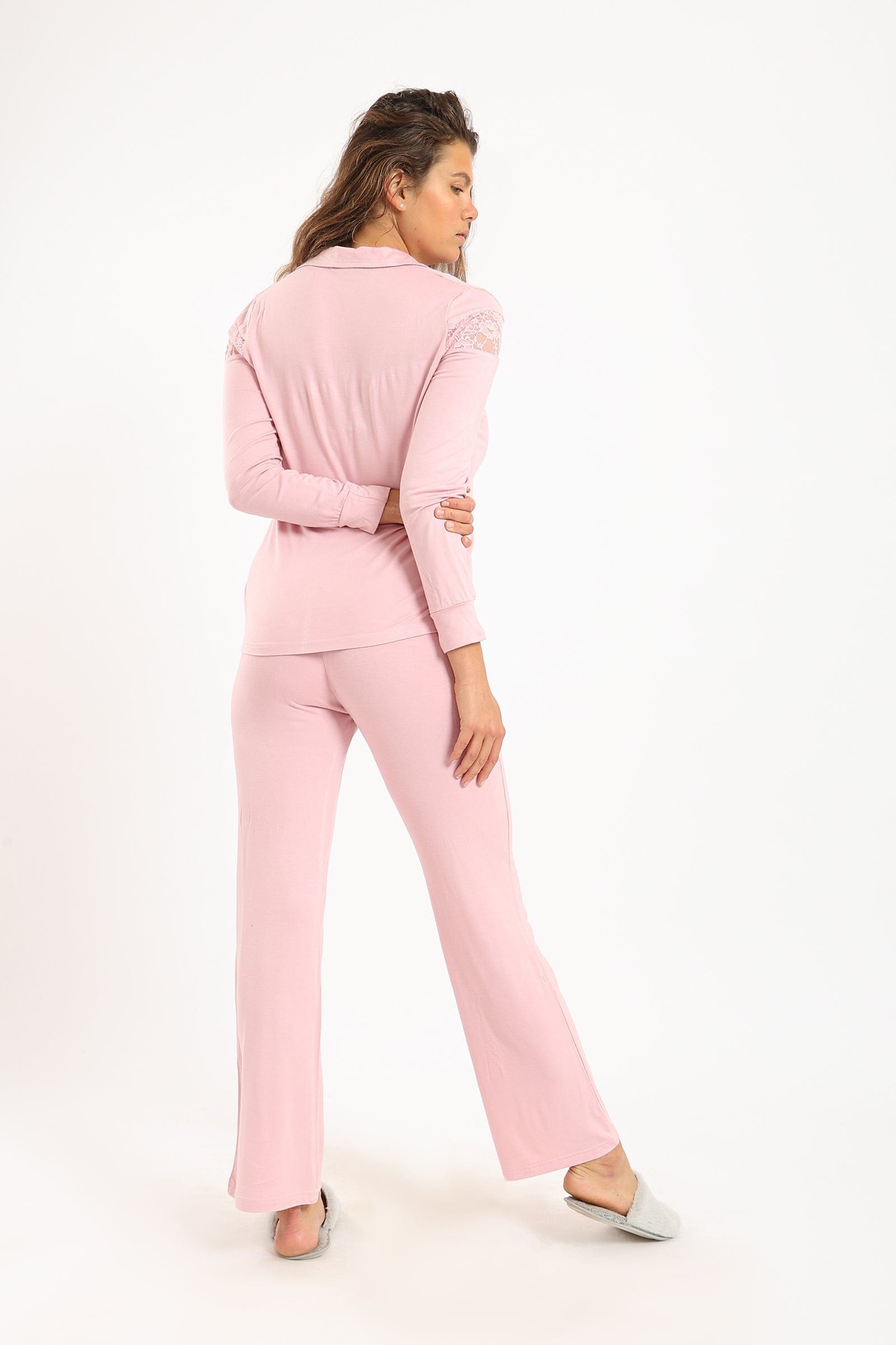 طقم بيجامة قميص بياقة مدببة بأزرار أمامية وبنطلون