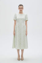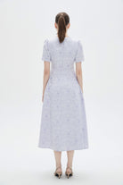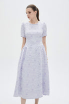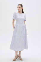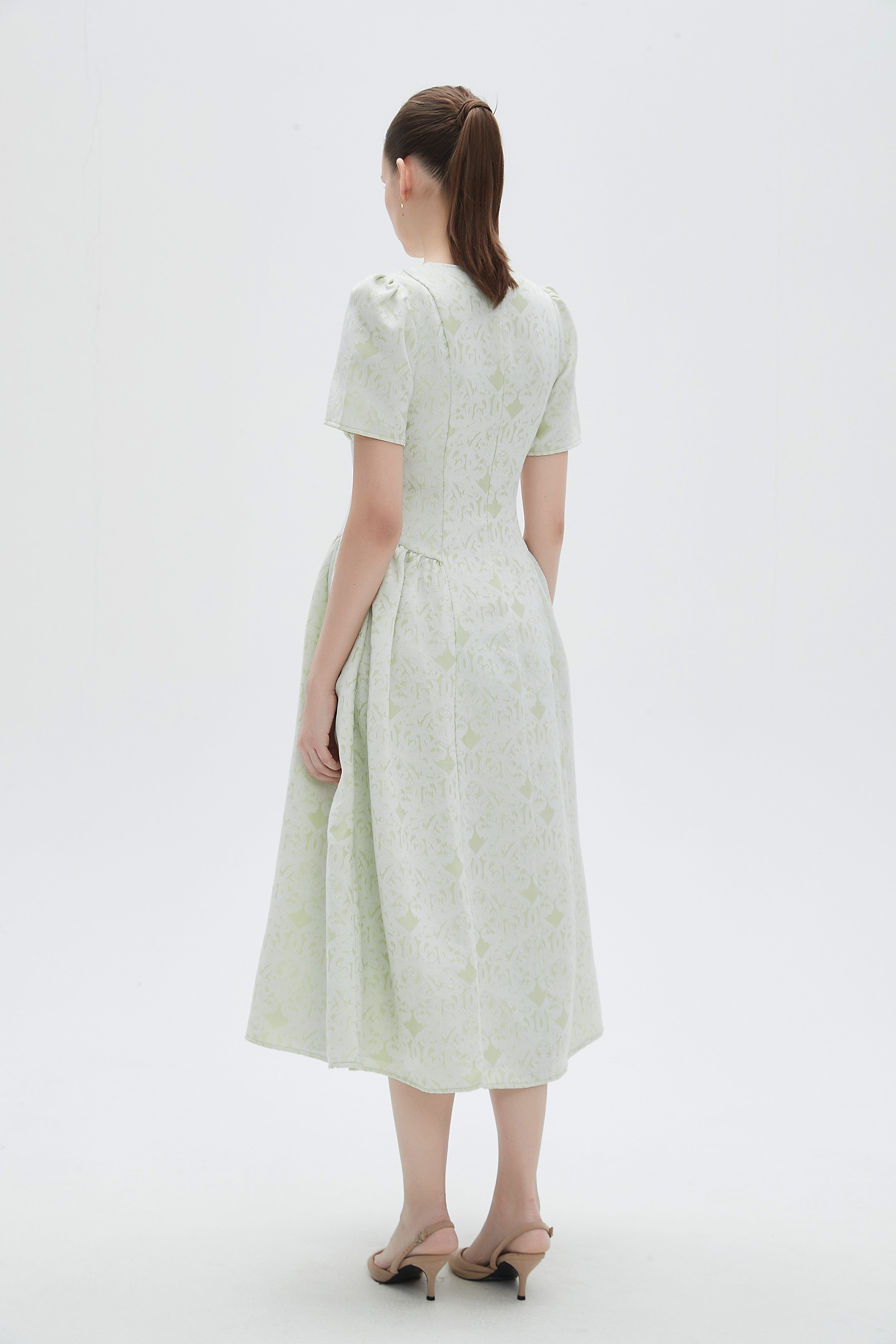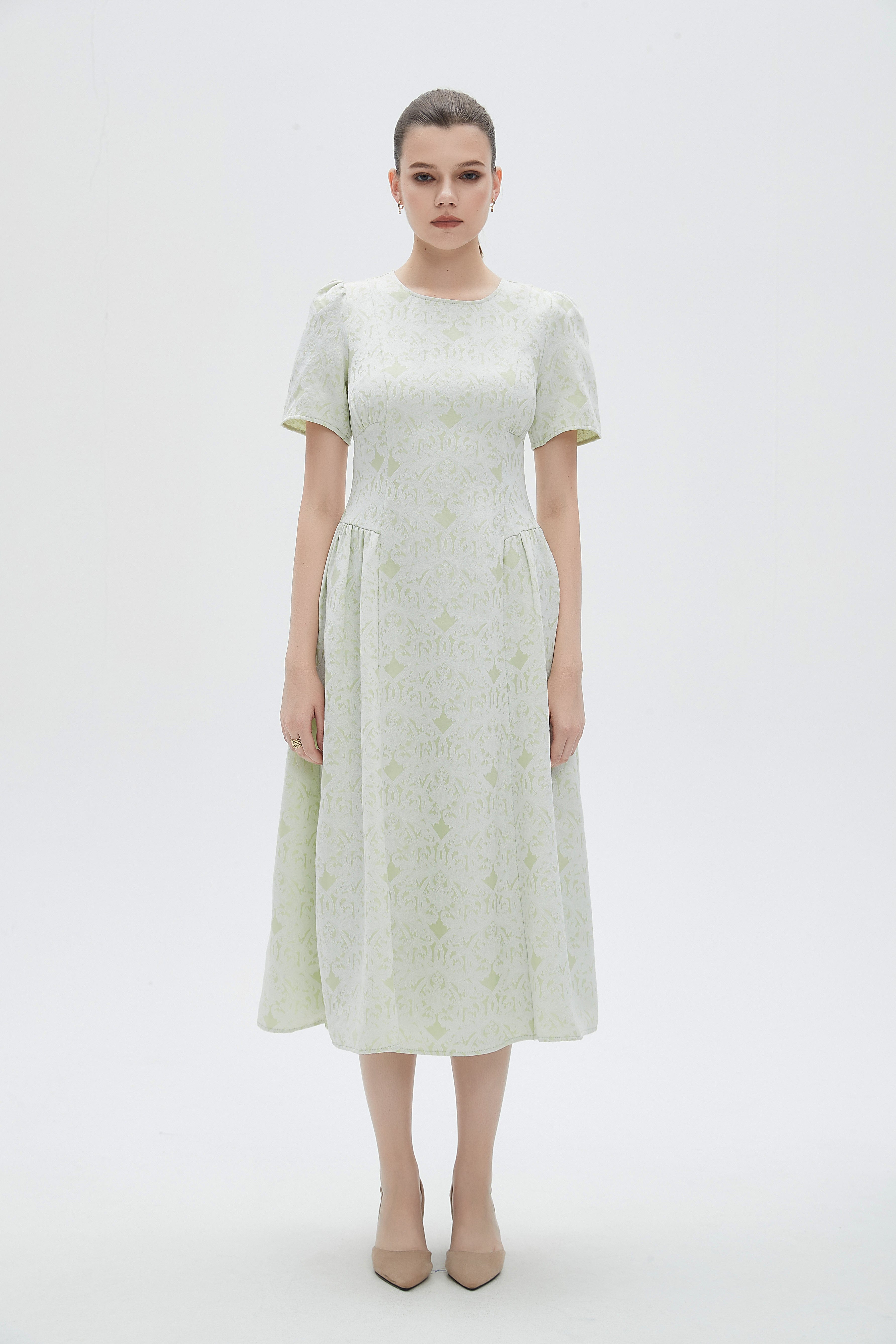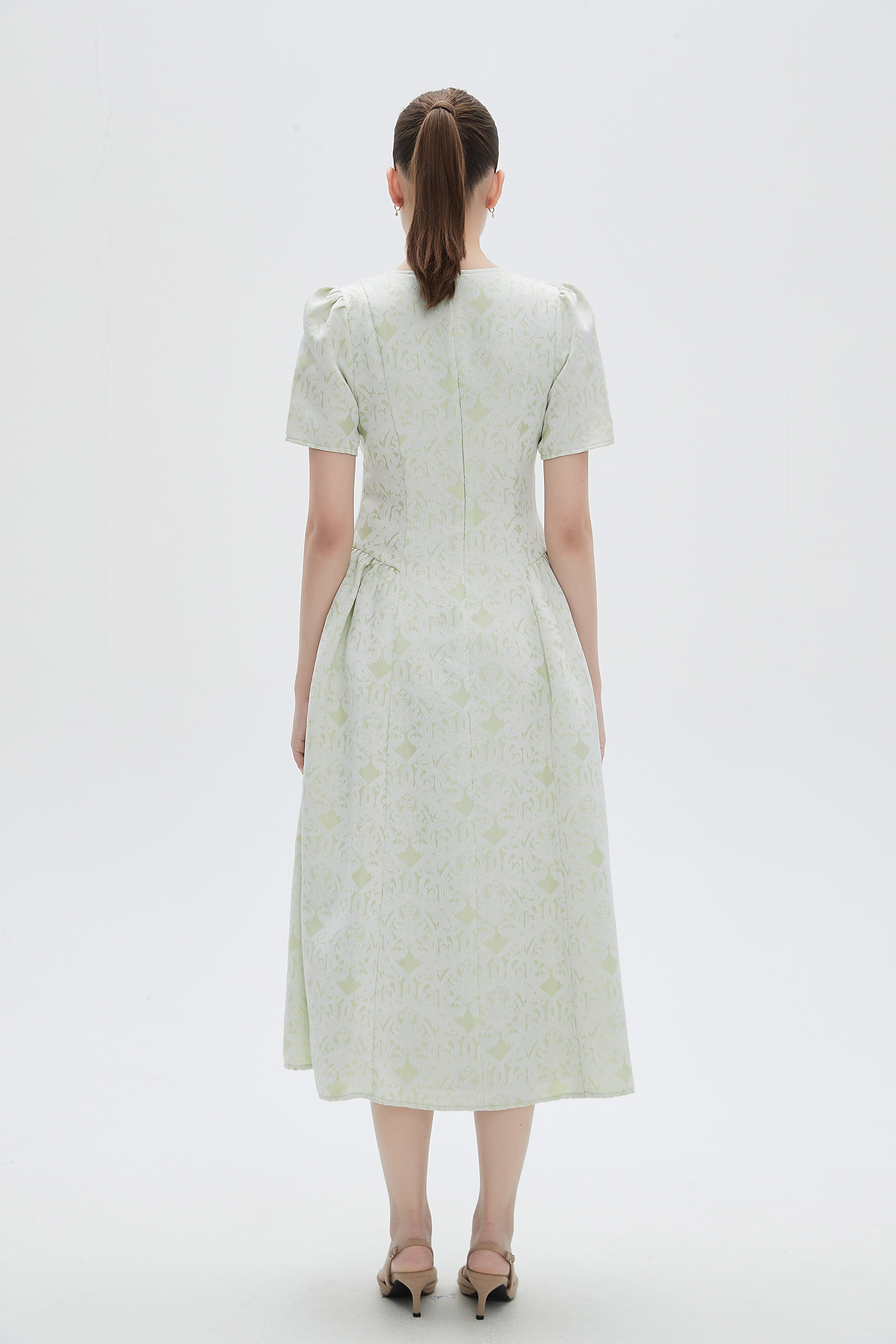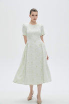 فستان نسائي ميدي كم قصر منقوش مكشكش من الاجناب بفتحة رقبة دائرية