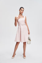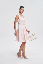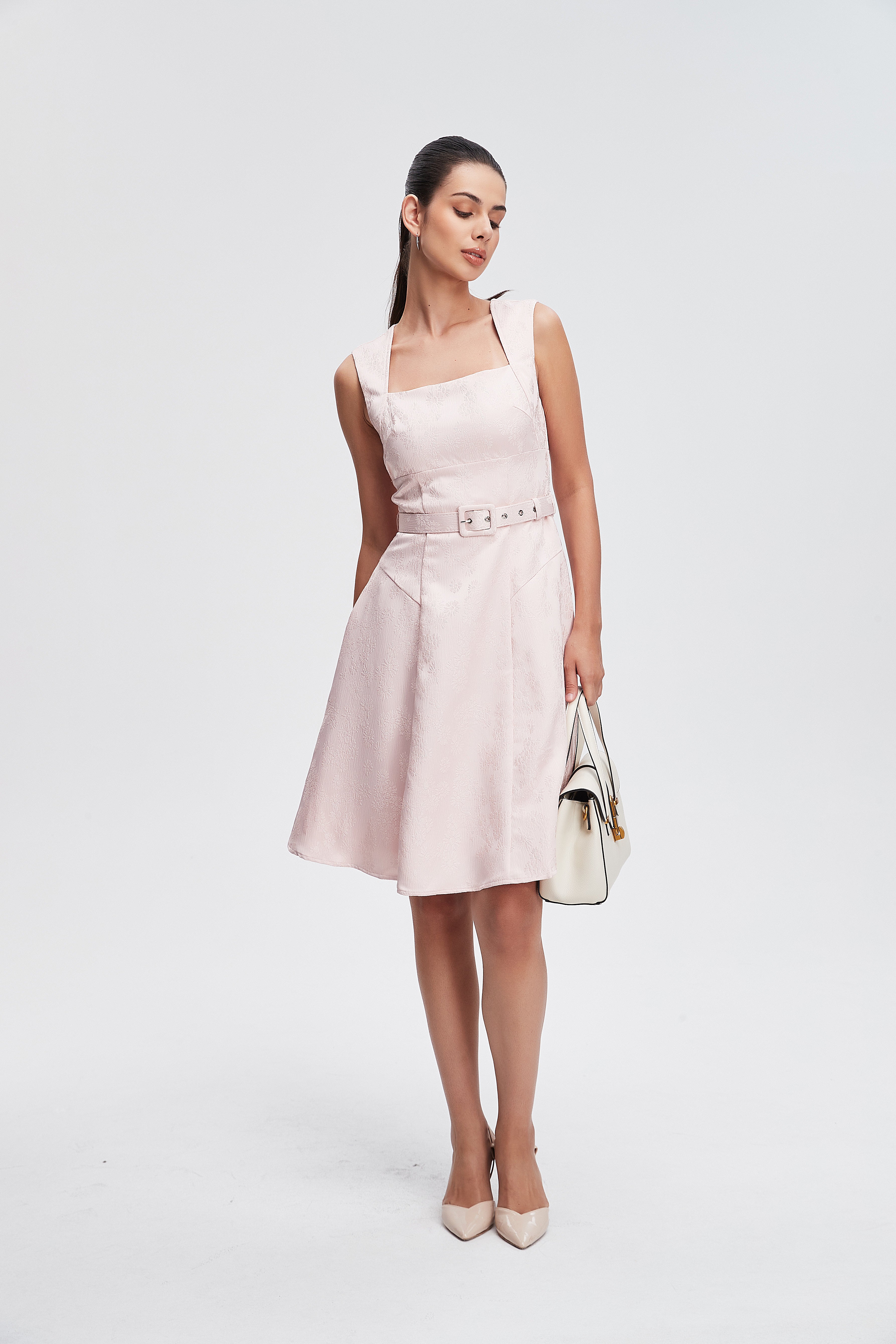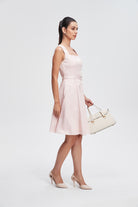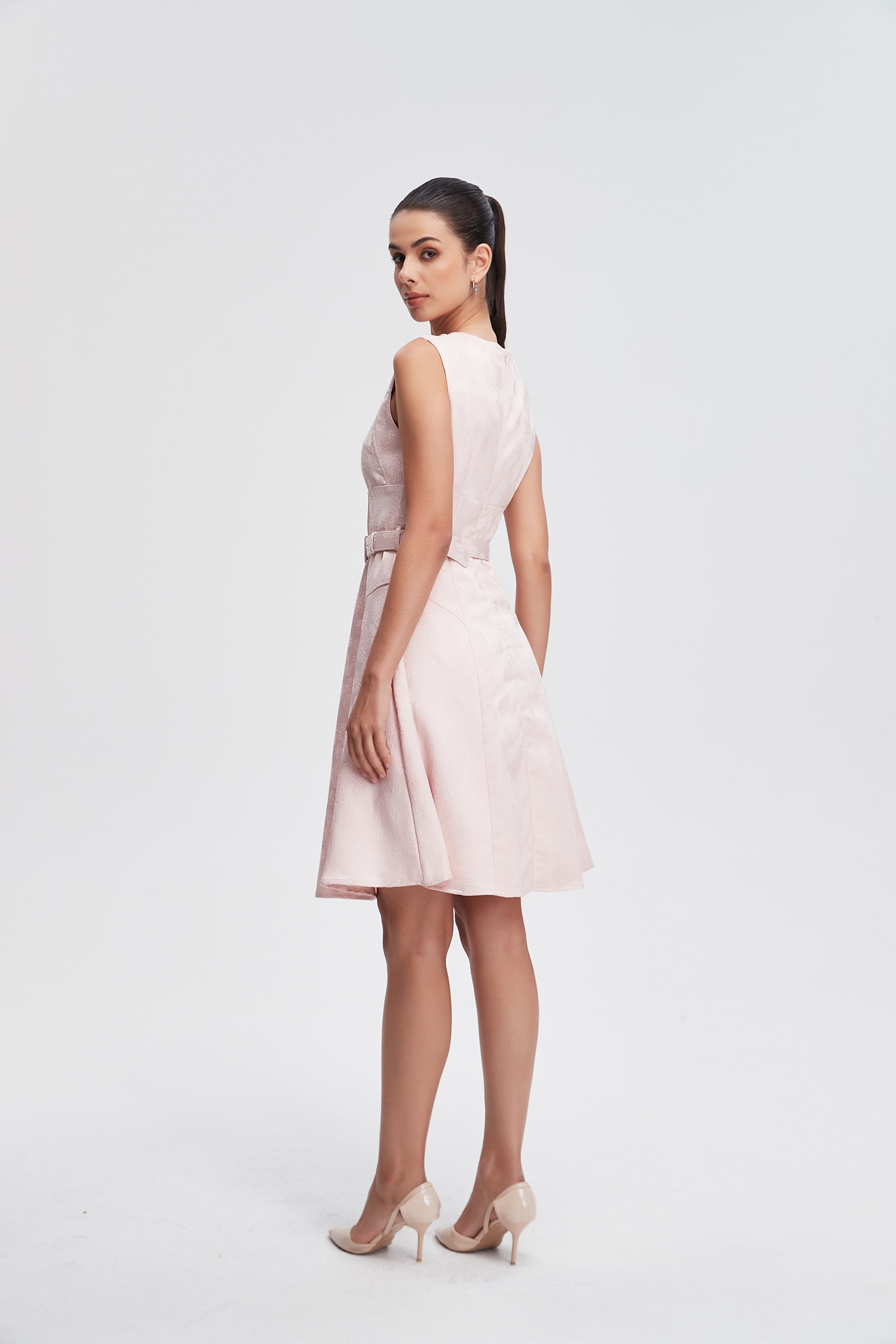 فستان قصير بدون اكمام وفتحة رقبة دائرية بحزام عالخصر