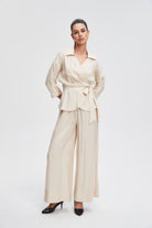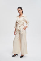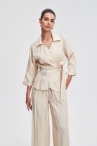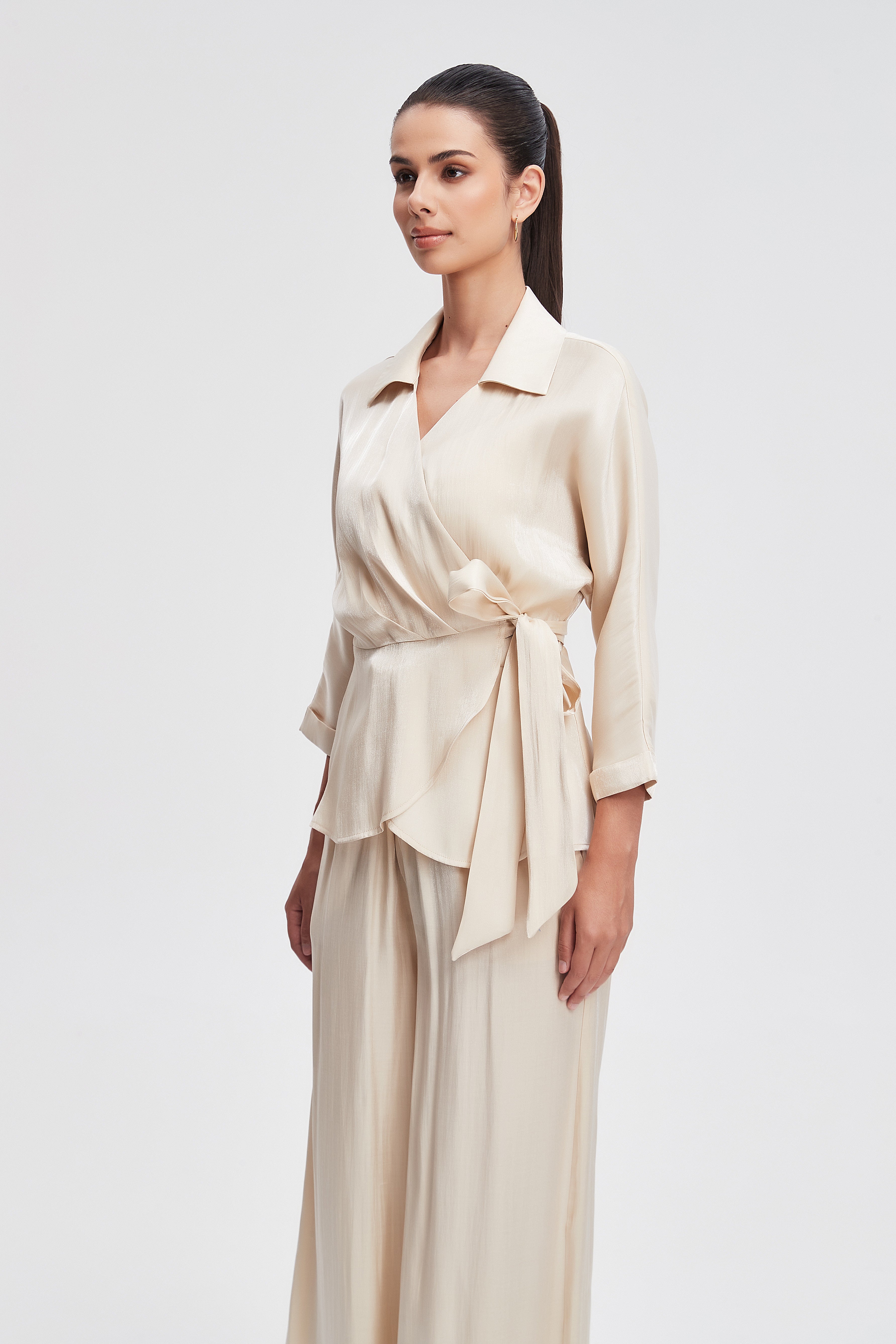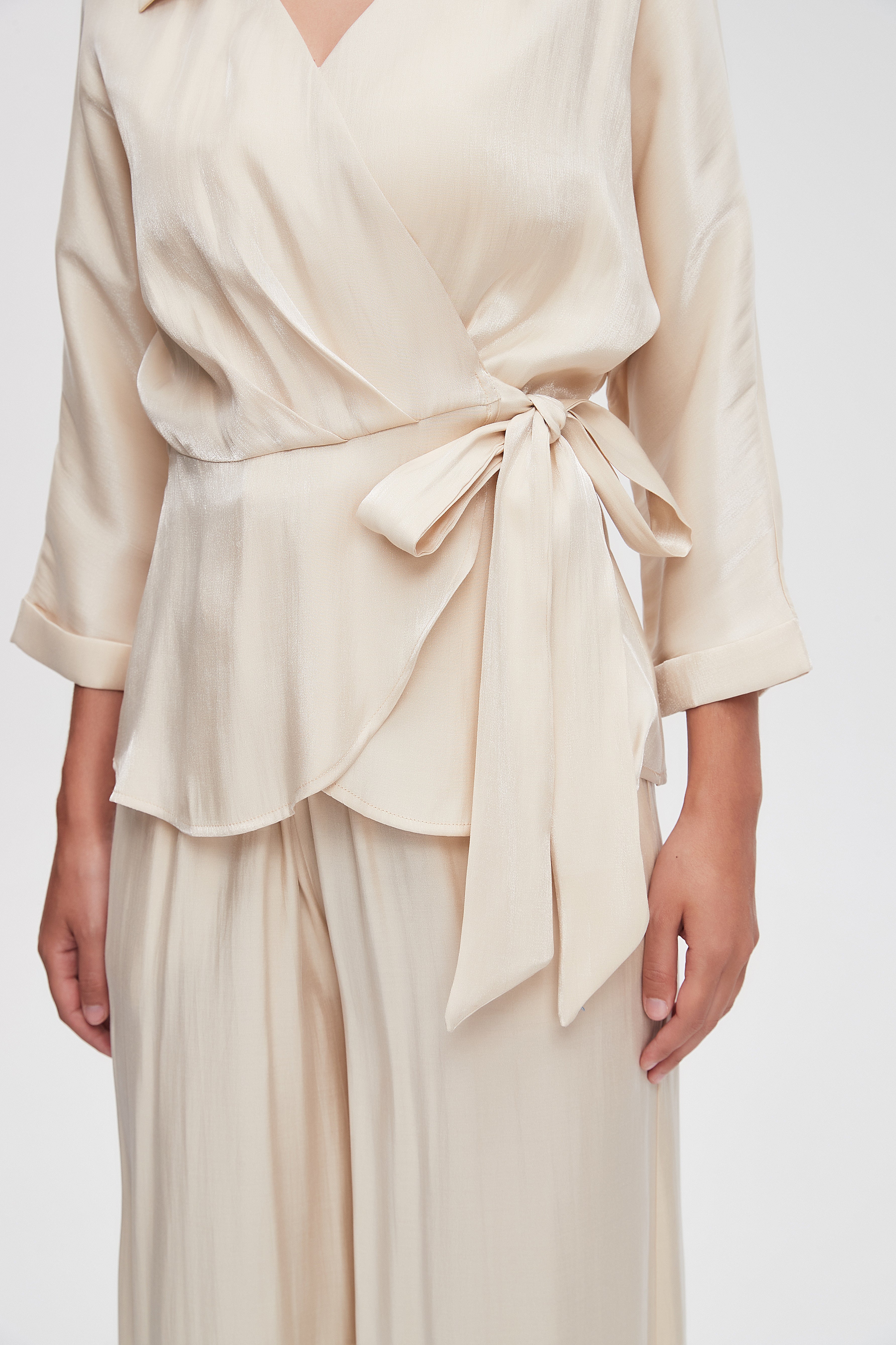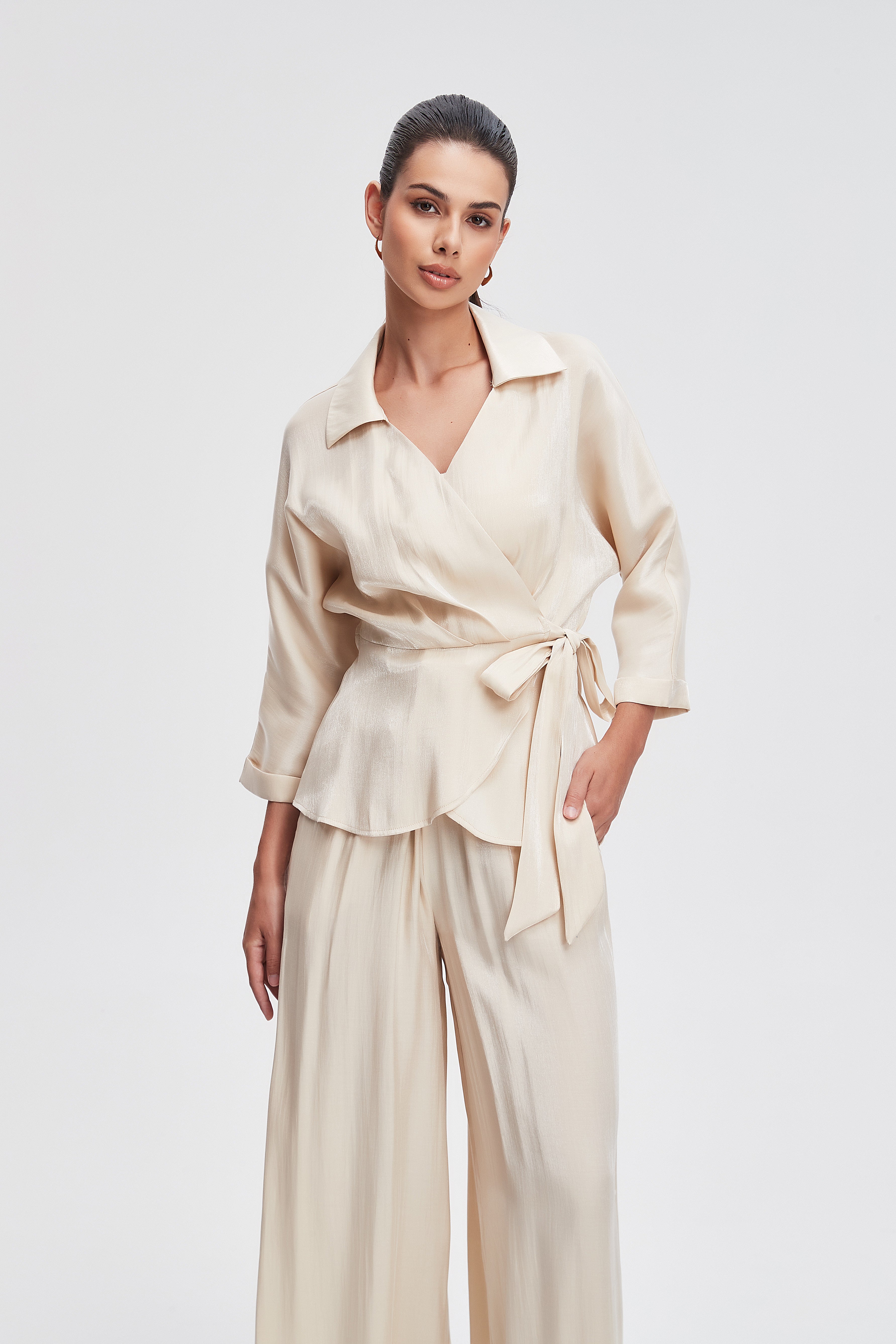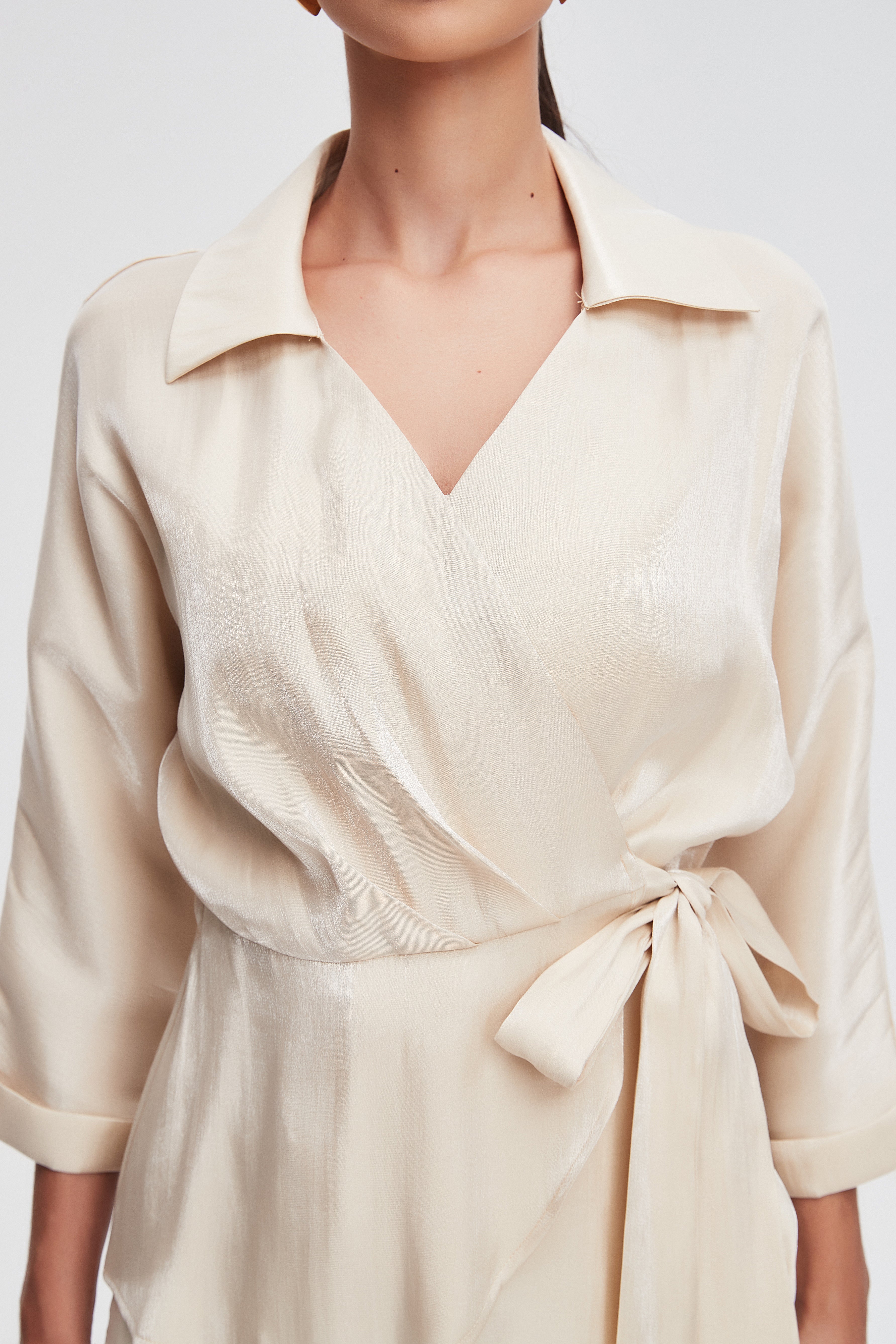 بلوزة نسائية 4\3 كم مكشكشة بياقة قميص