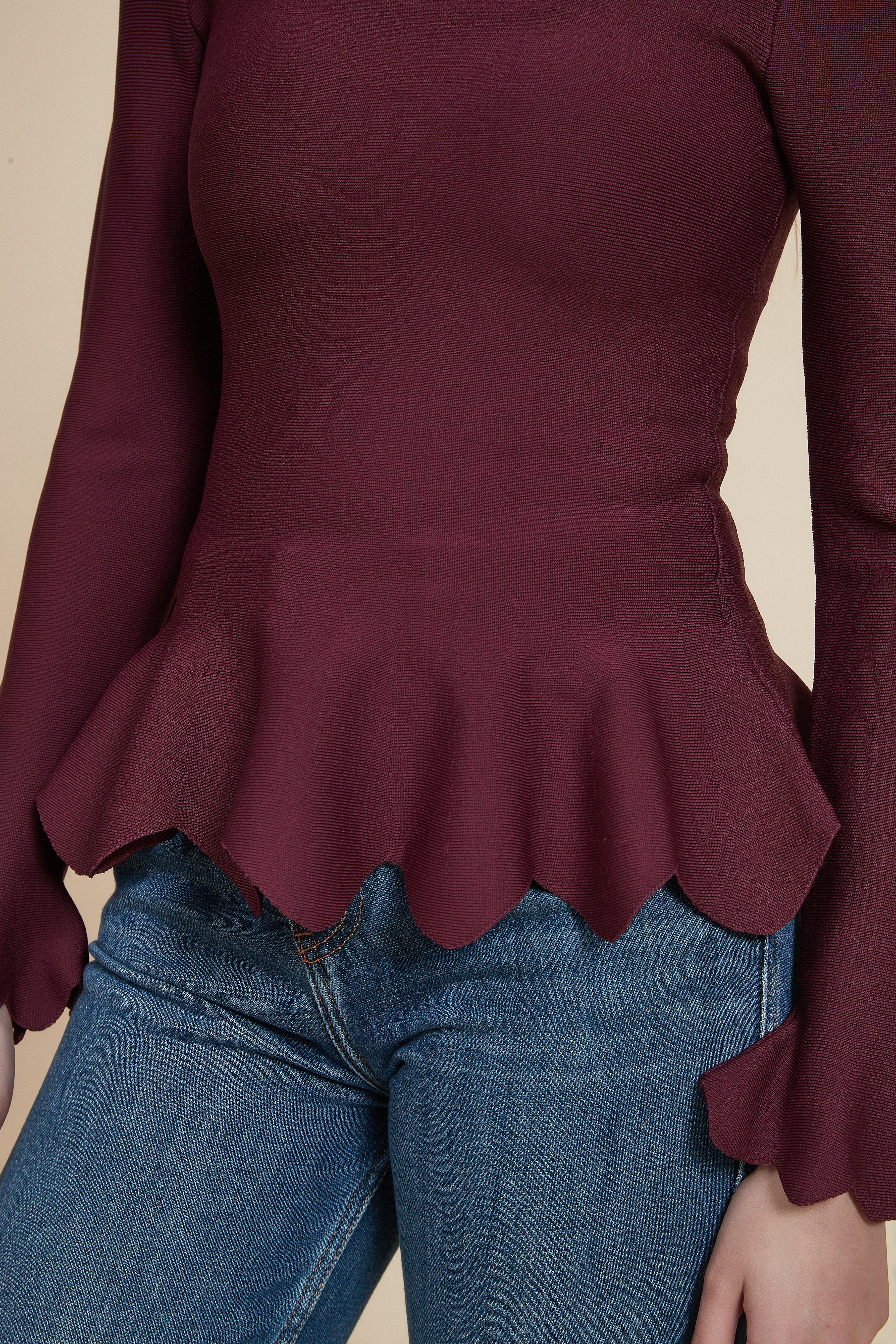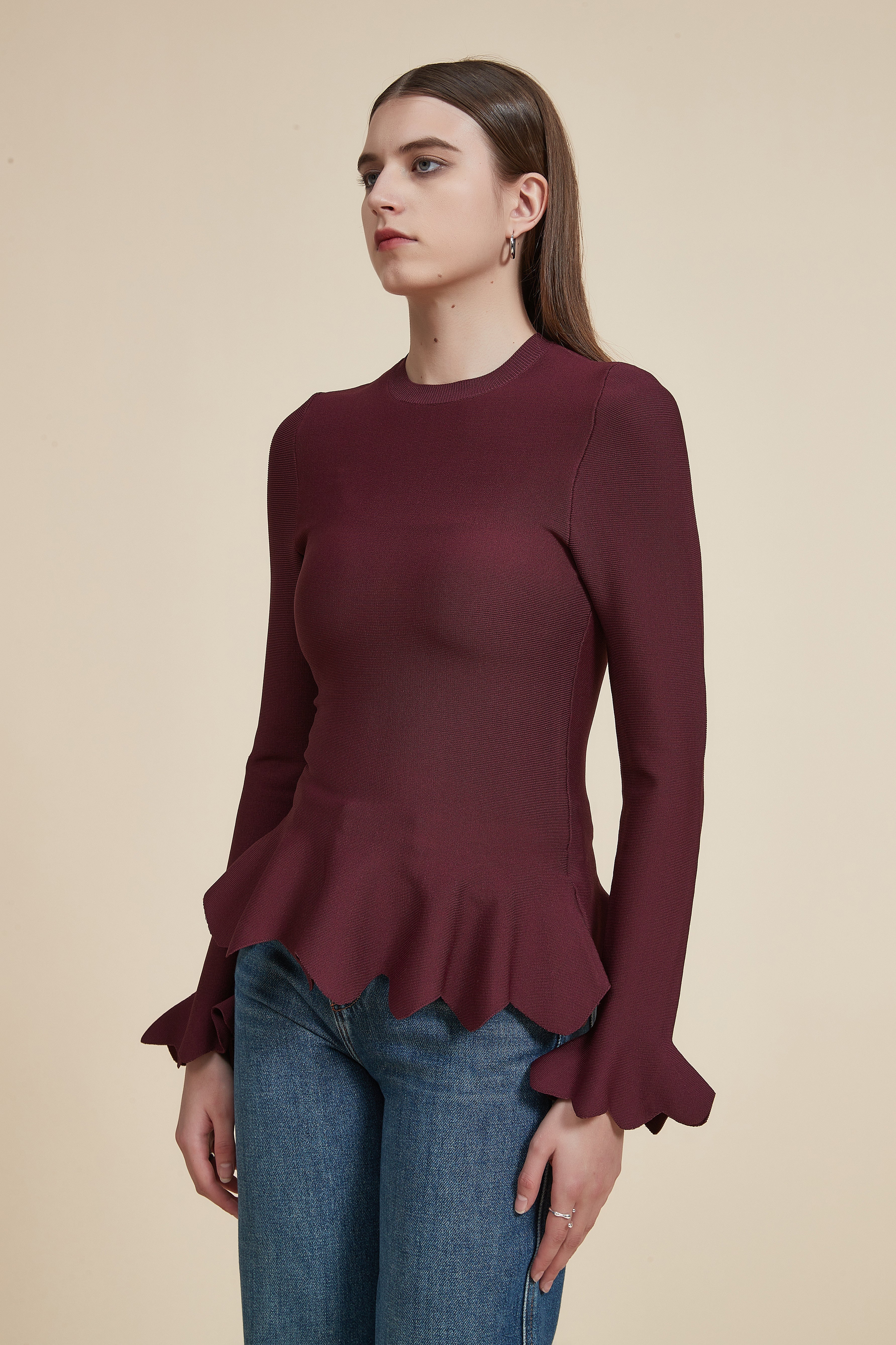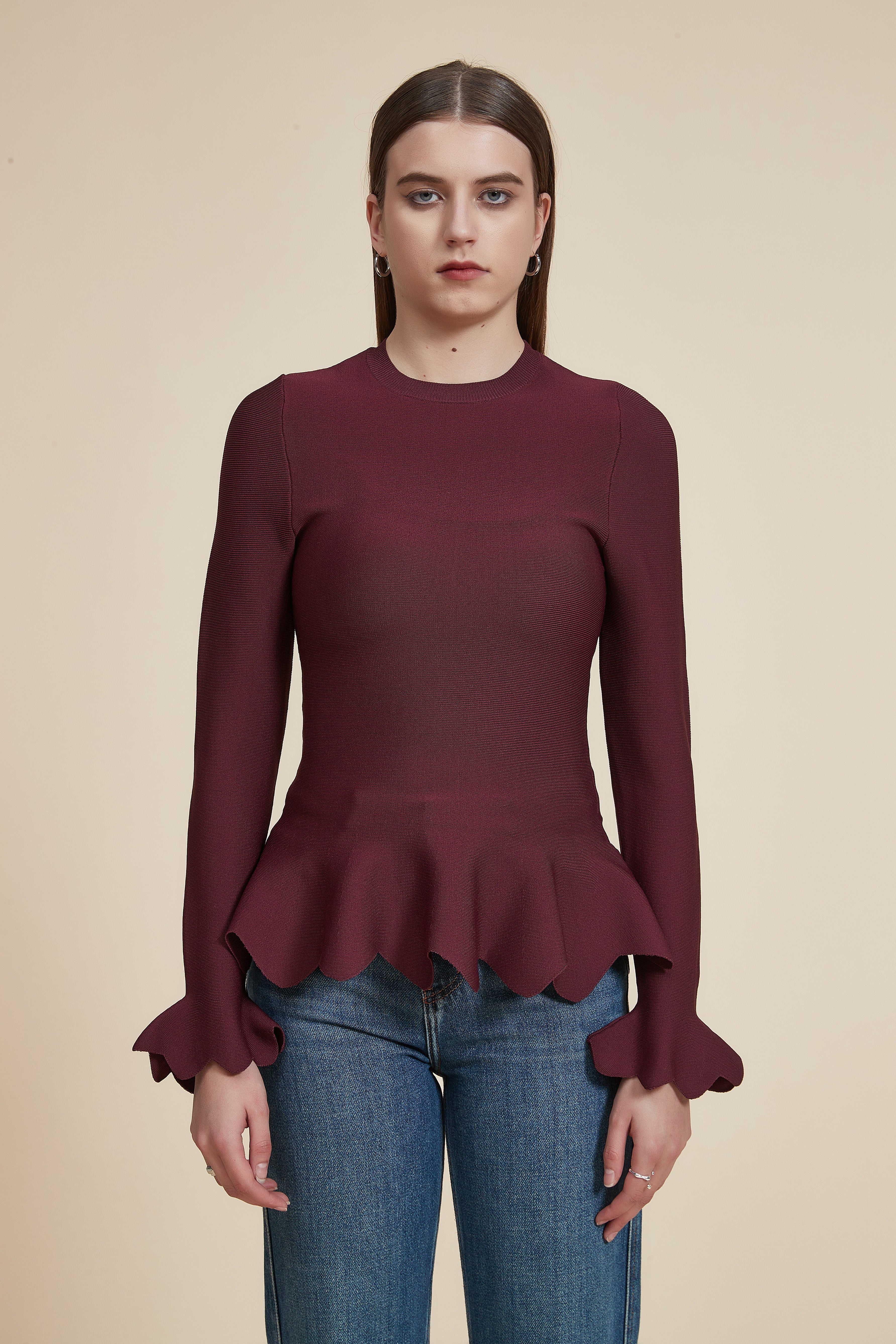 بلوزة طويلة مكشكشة من الاسفل كم طويل وفتحة رقبة دائرية