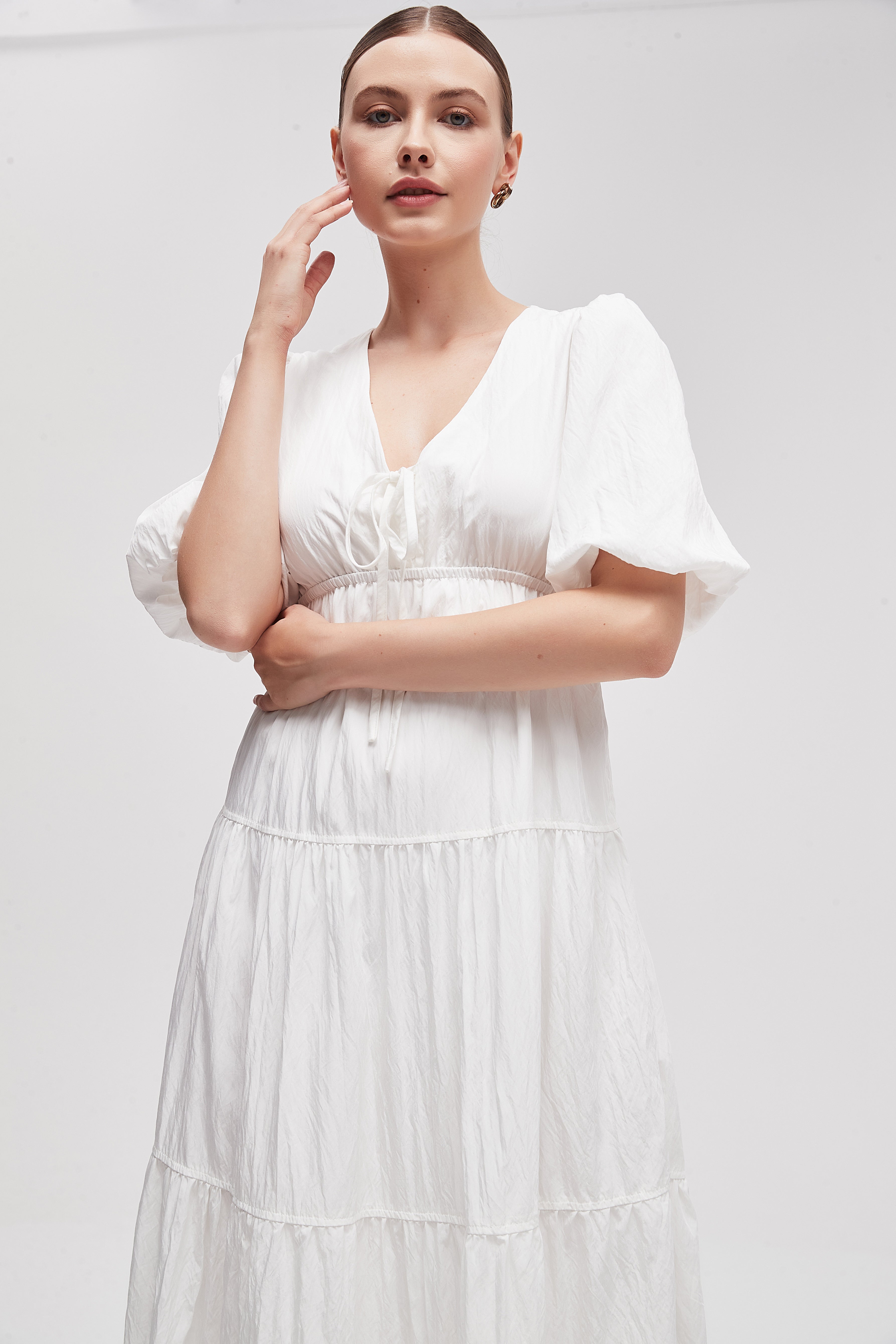فستان نسائي ميدي بكم طويل فراشة وفتحة رقبة على شكل V