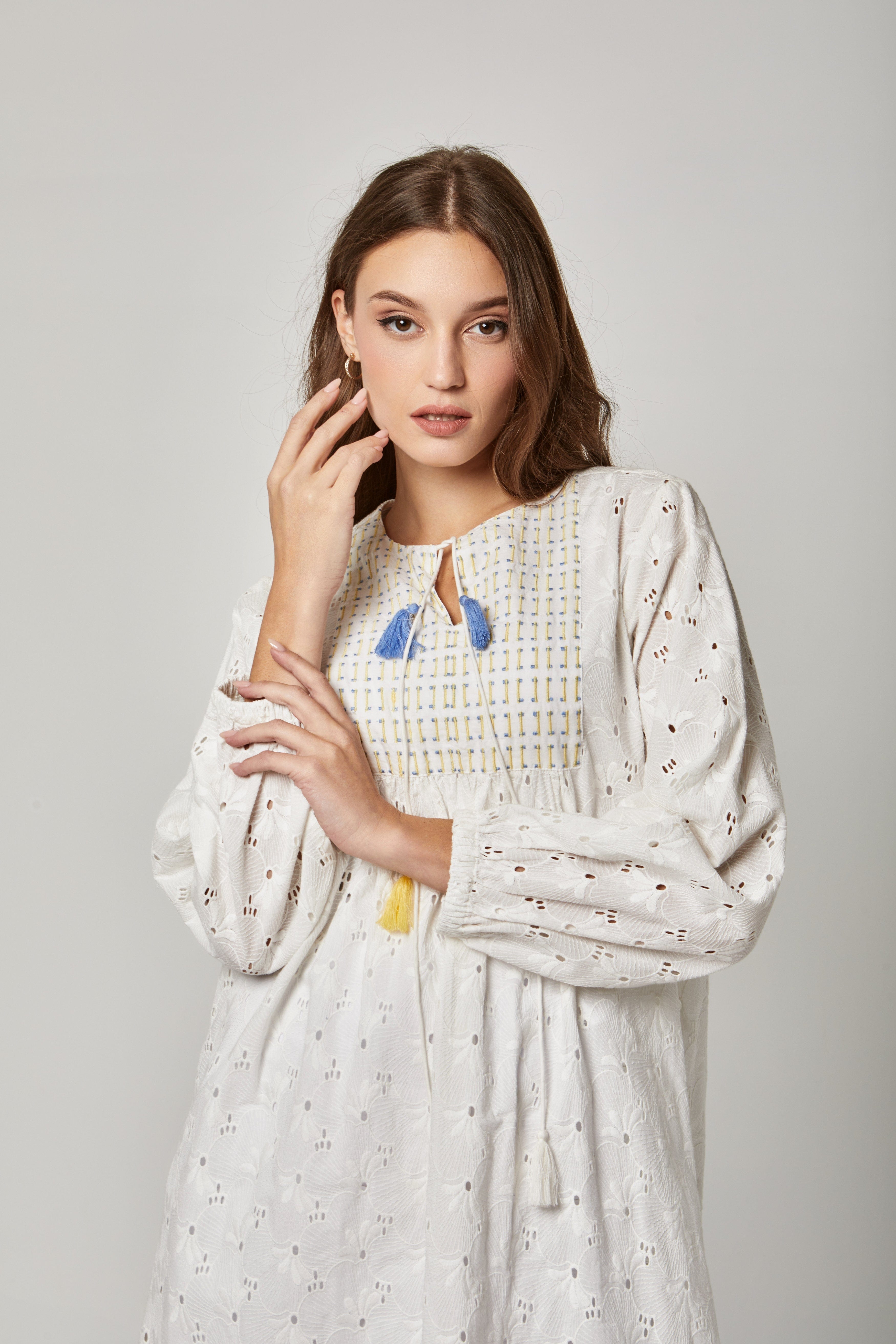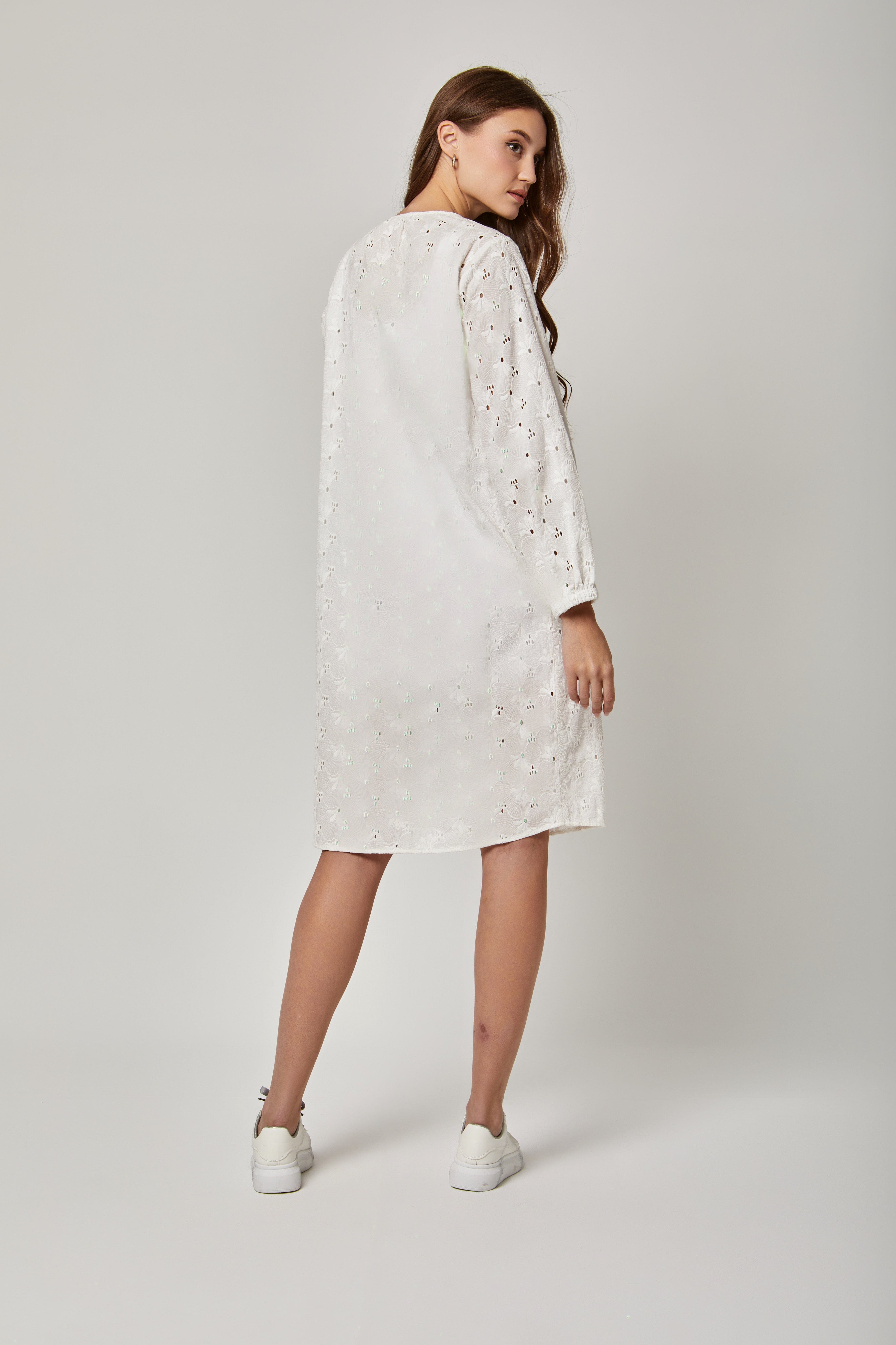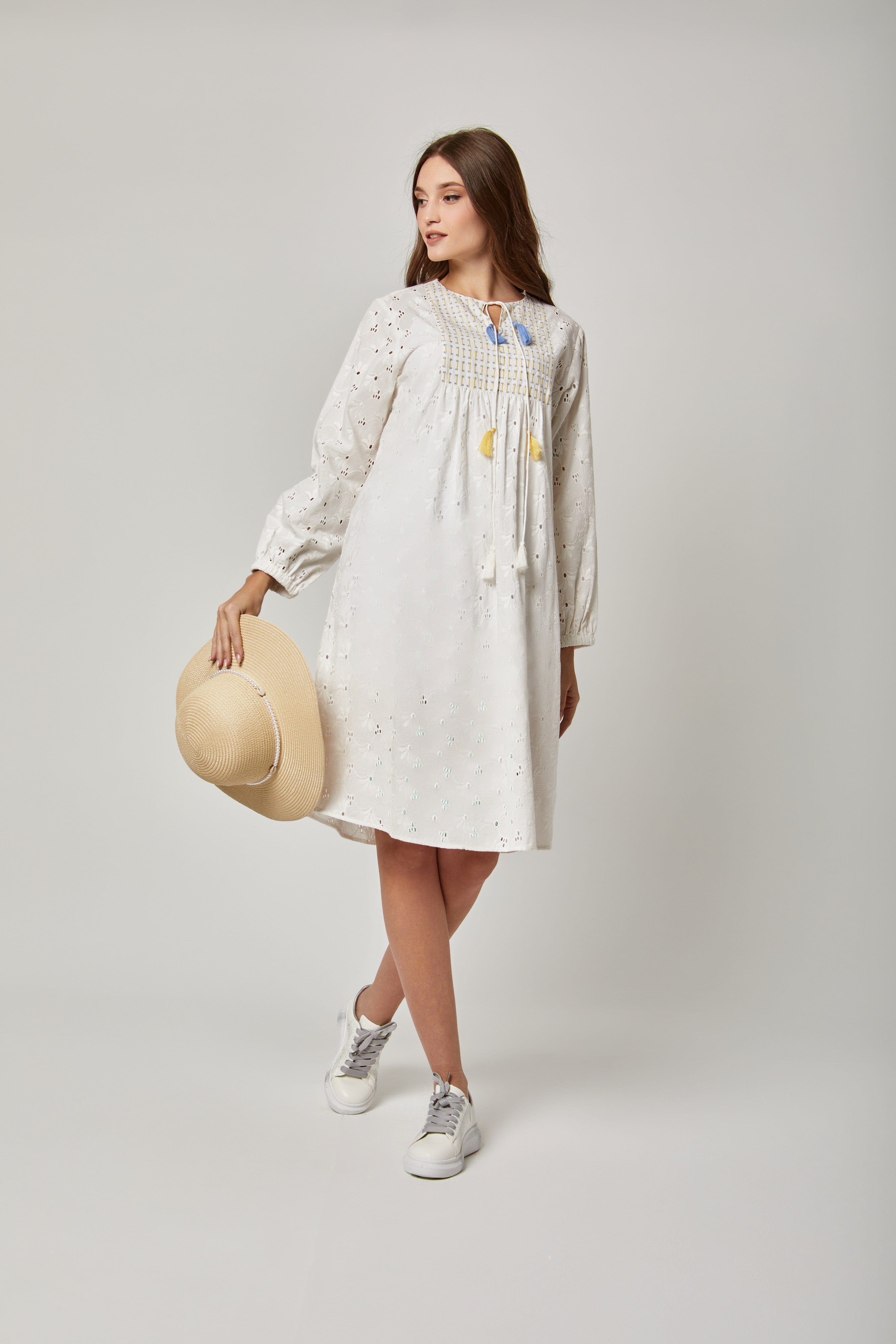 فستان قصير مطرز بفتحة صدر صغيرة كم طويل