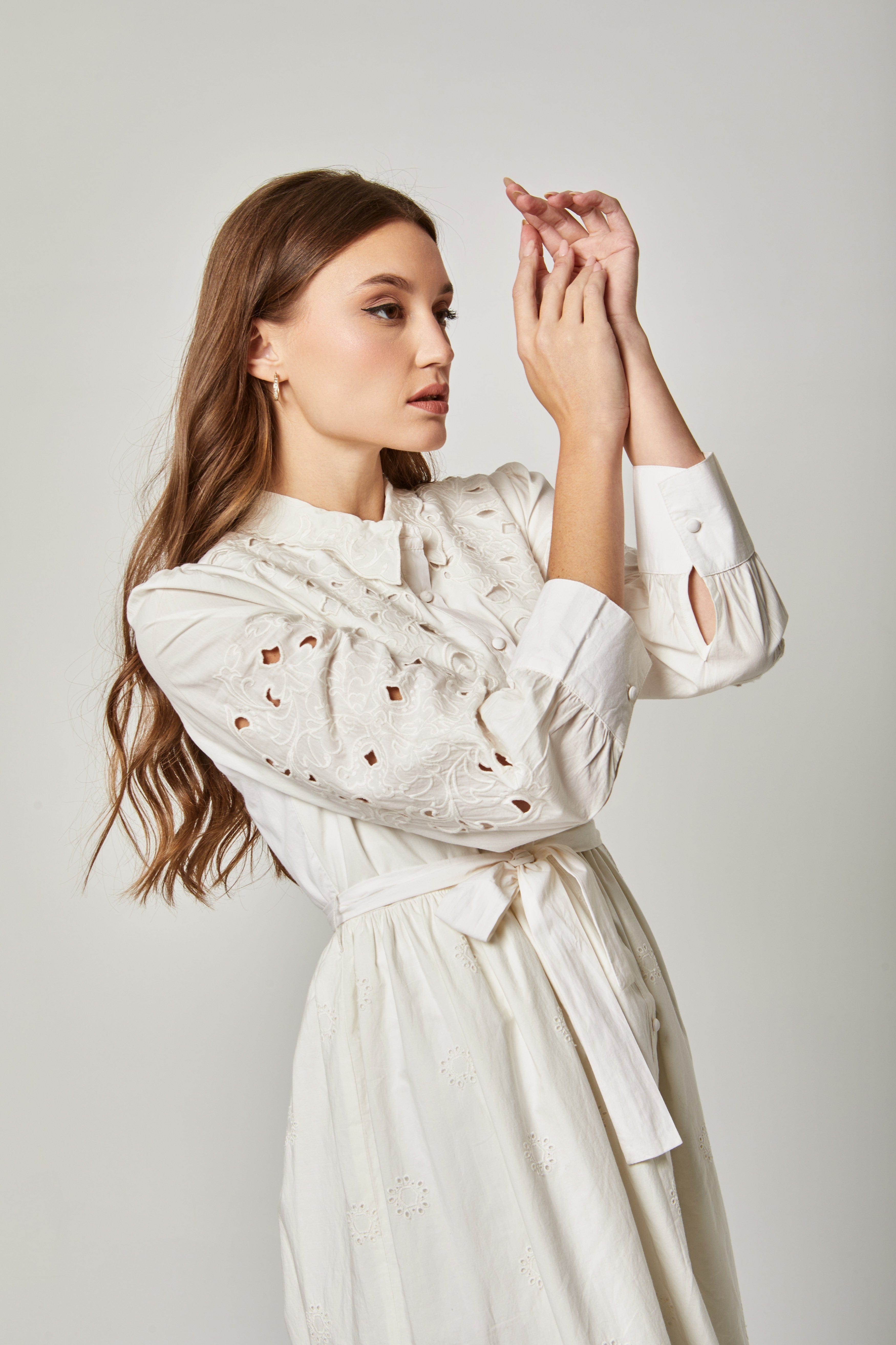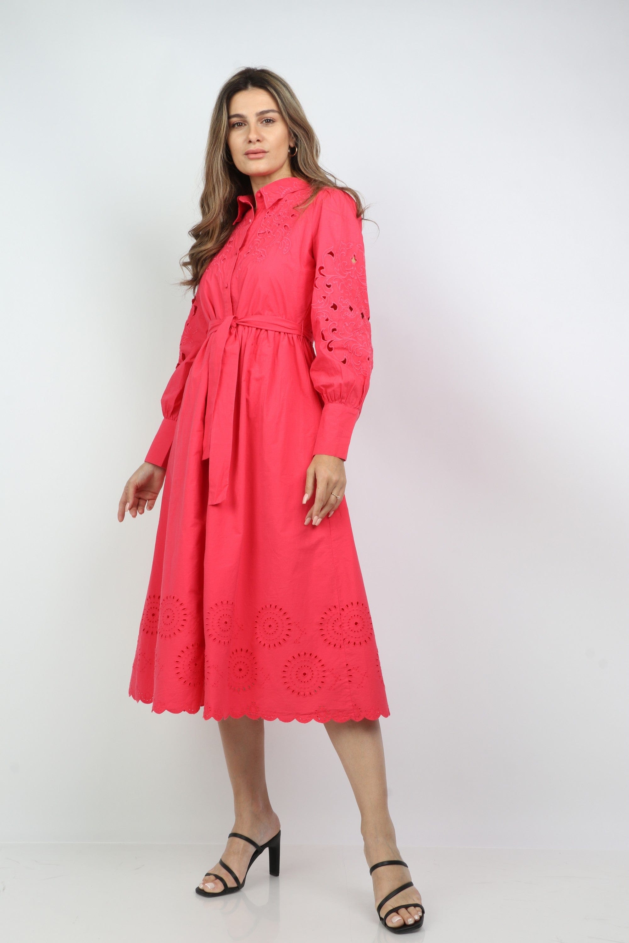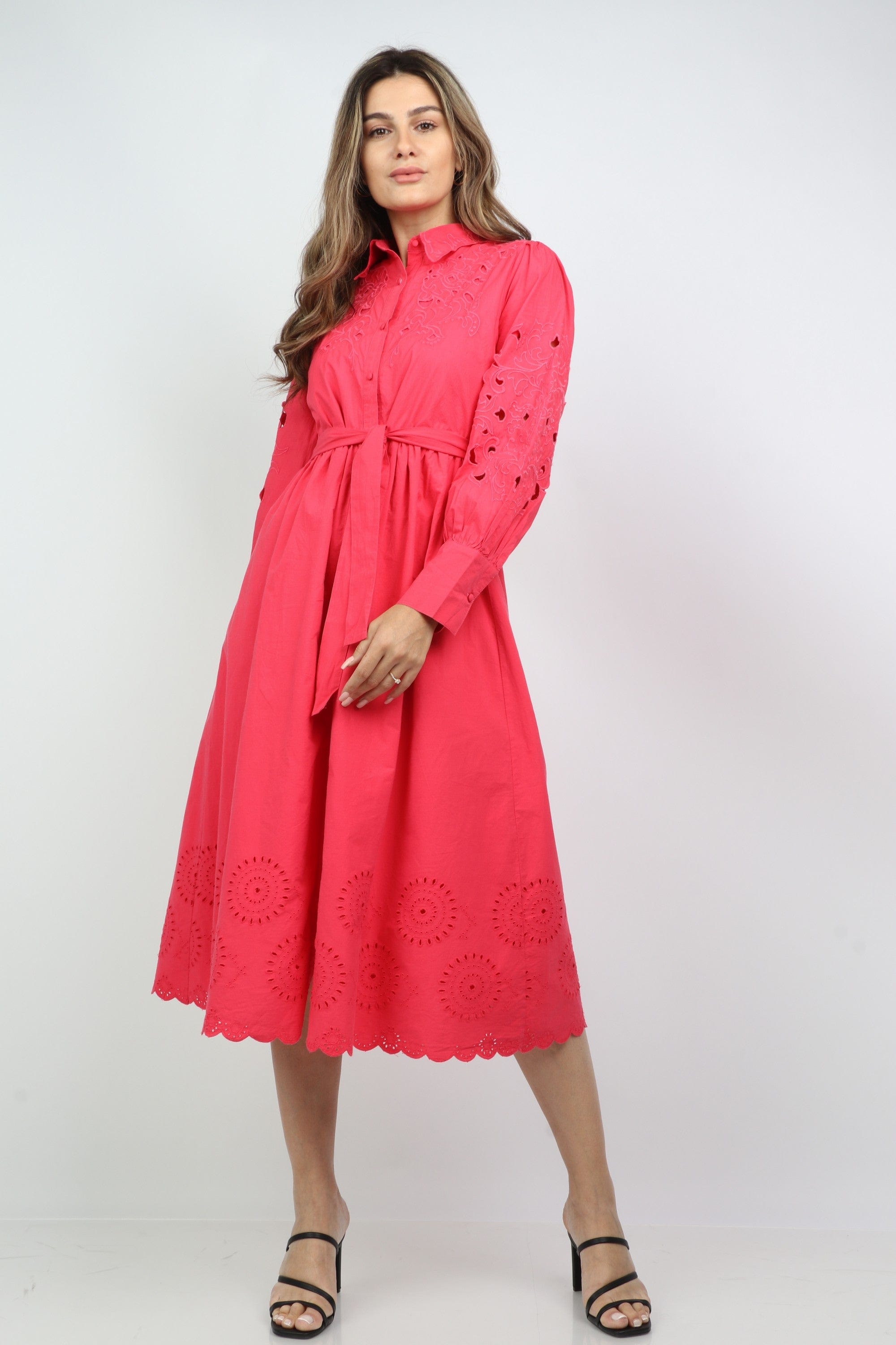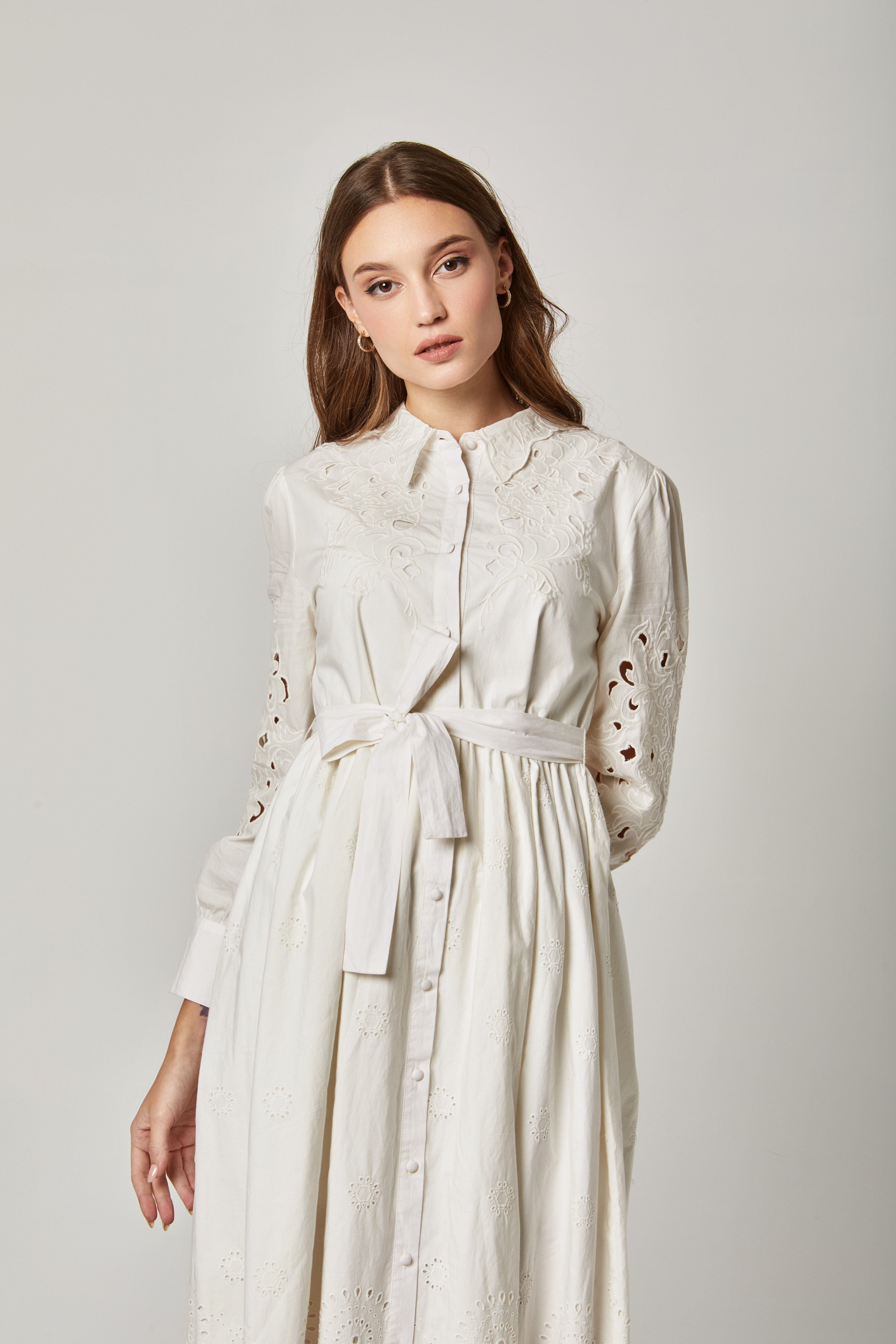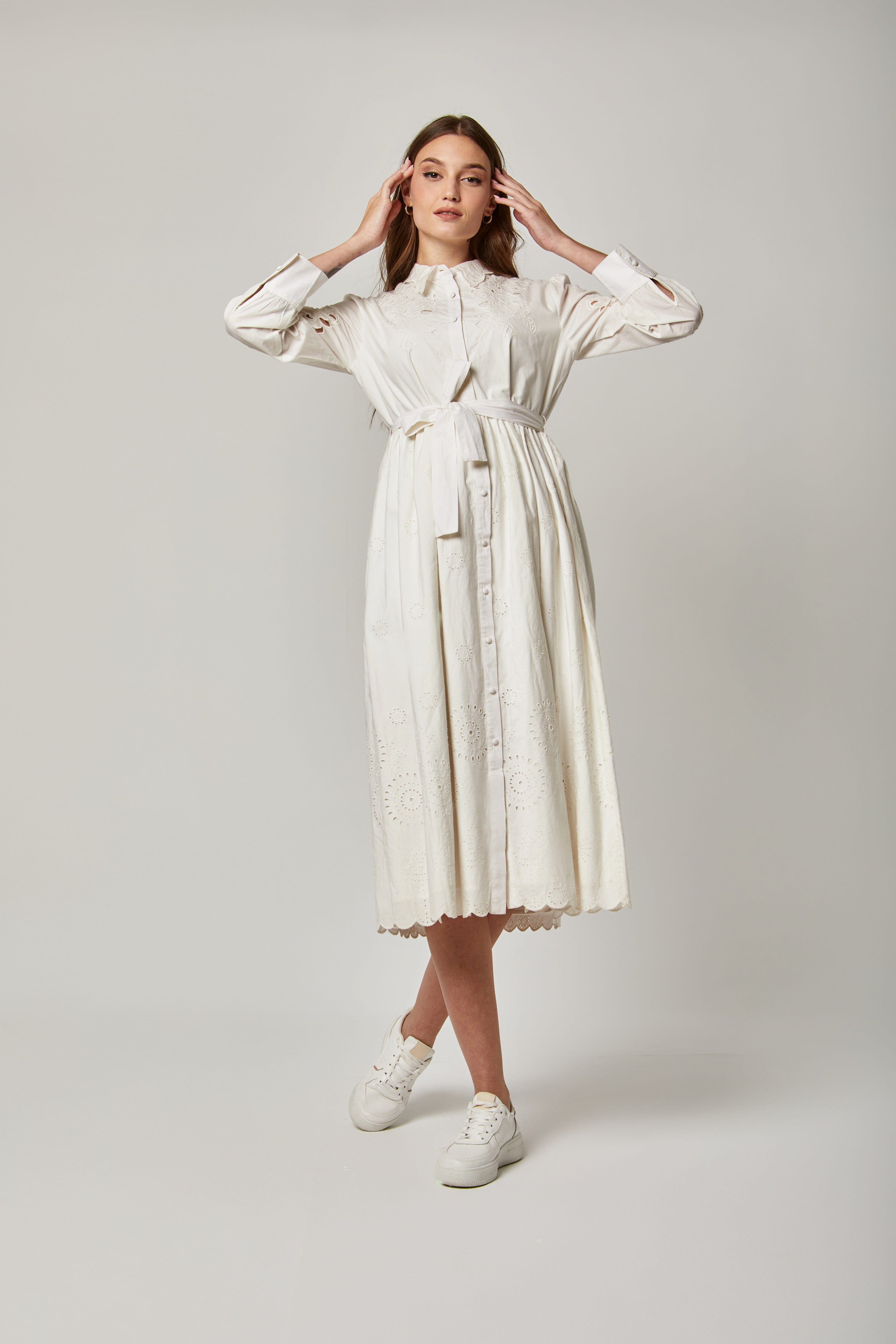 فستان قميص ميدي بحزام خصر وياقة طويلة وأزرار أمامية بكم طويل