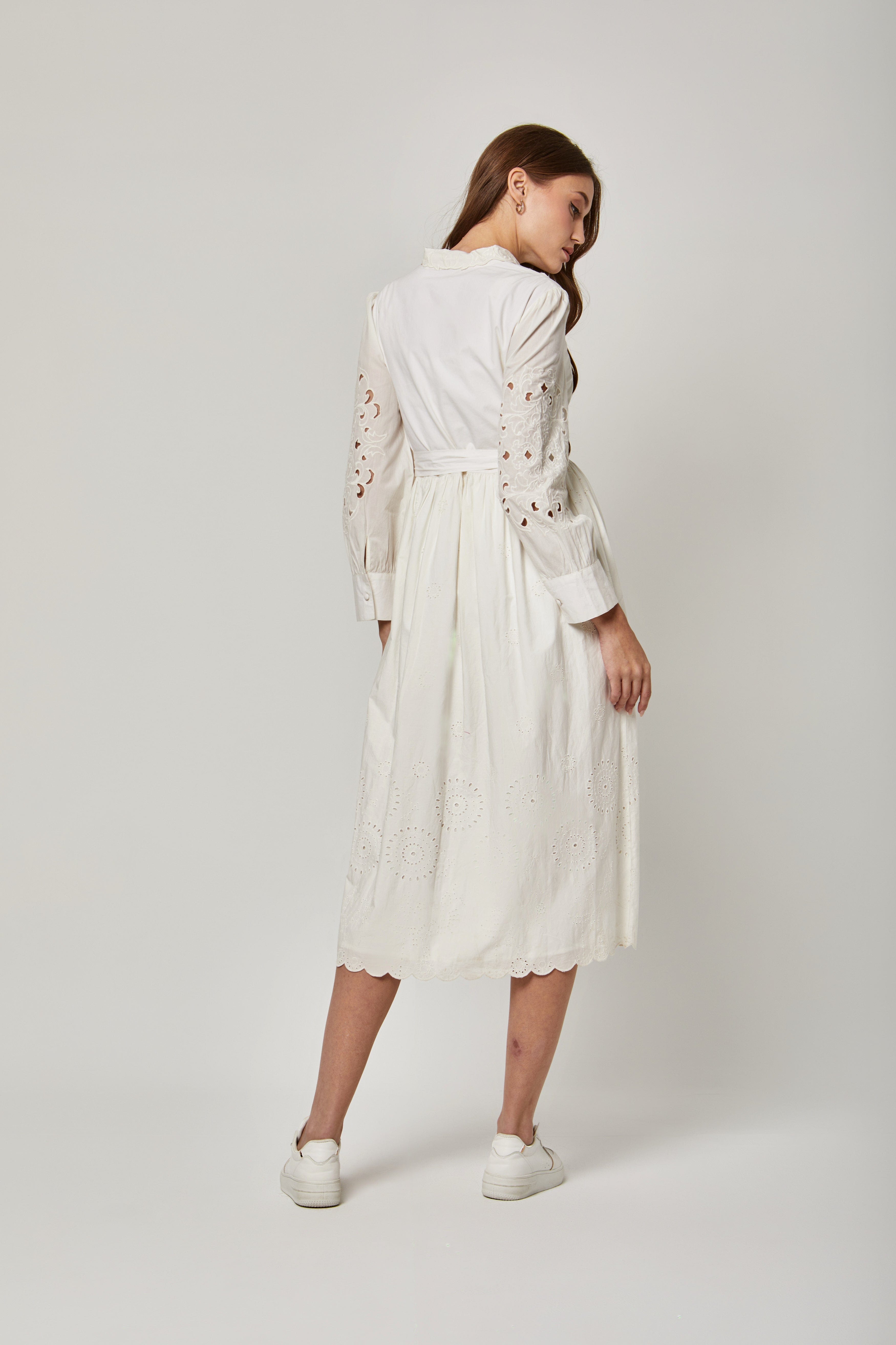 - نقش وردي مطرز بتقنية تطريز منخل يضيف تفاصيل مميزة