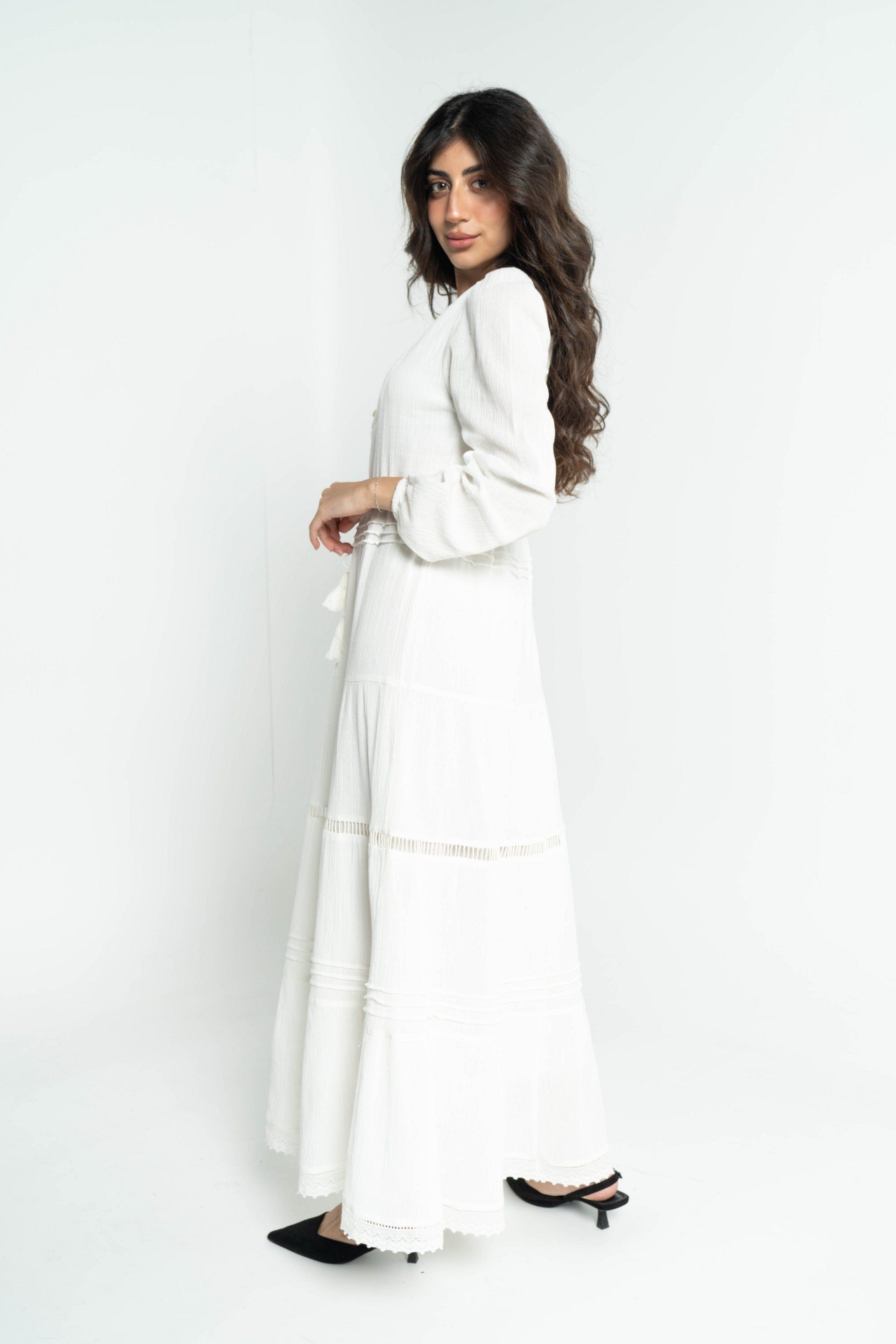 تبحثين عن فستان كاجوال أنيق يناسب خروجات الربيع والخريف؟ هذا الفستان الأبيض بقصة A طول ماكسي سيعطيك إطلالة أنثوية وبسيطة في آن واحد. القماش بسمك متوسط ومزود بتفاصيل دانتيل تضيف لمسة رقيقة دون مبالغة. ياقة مستديرة وأكمام طويلة تمنحك راحة ودفء خفيف في الأجواء المعتدلة، والتصميم سادة يبرز جمال الدانتيل. لا يحتوي على إغلاق مما يجعله سهل الارتداء، ومع الحزام المرفق يمكنك تحديد الخصر بحسب ذوقك. لا يحتوي على جيوب وقصة عادية تناسب النساء البالغات. ستحبين كيف يتحرك معك عند المشي؛ مثالي للخروجات الرومانسية أو لقاءات القهوة مع الصديقات. قطعة عملية تدخل بسهولة في خزانة ربيعك وخريفك وتمنحك طلة ناعمة وكاجوال في آنٍ واحد. اعثري على مقاسك في فاشن السعودية وأضيفي هذه القطعة المتنوعة إلى خزانة ملابسك اليوم.