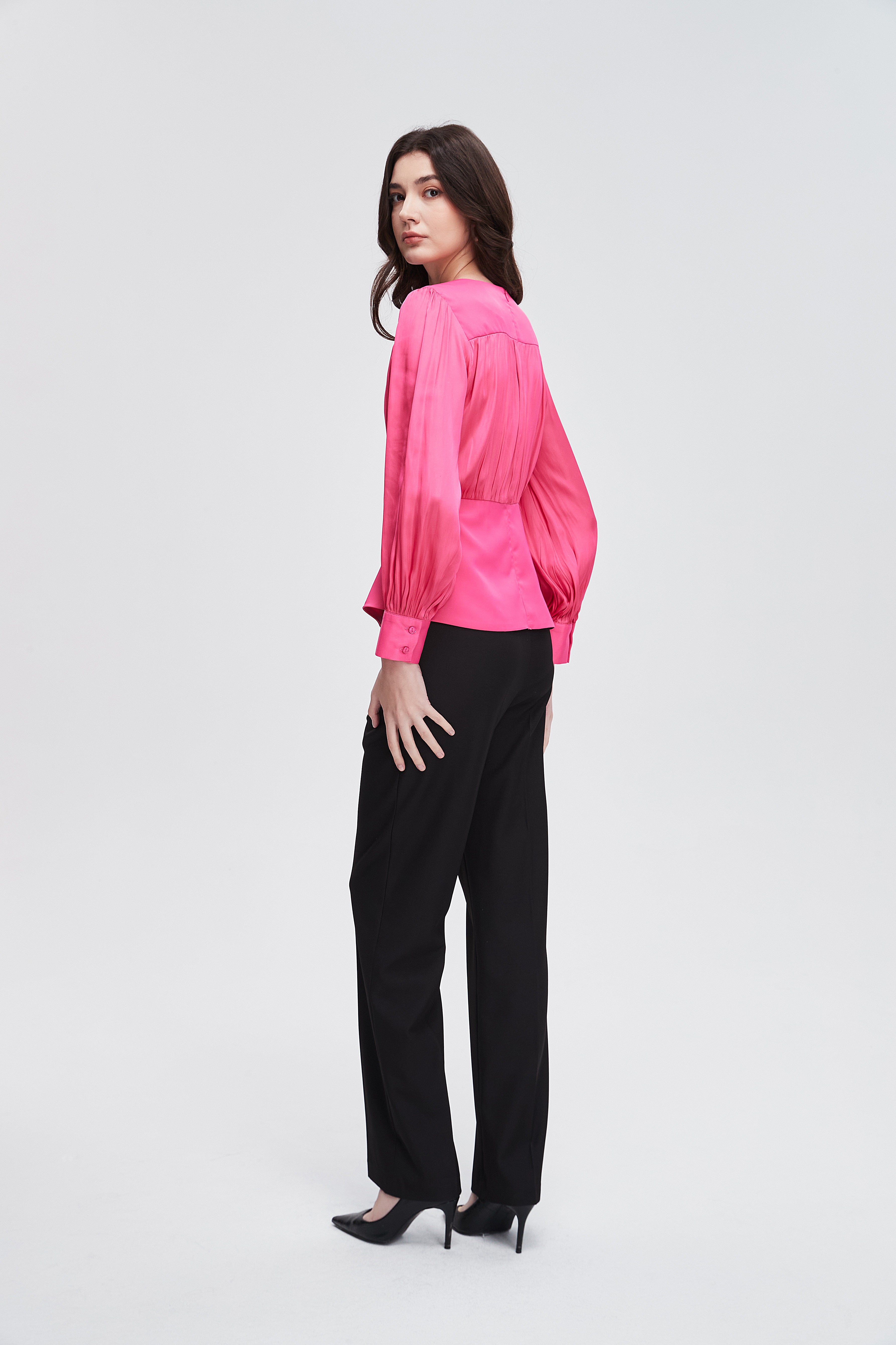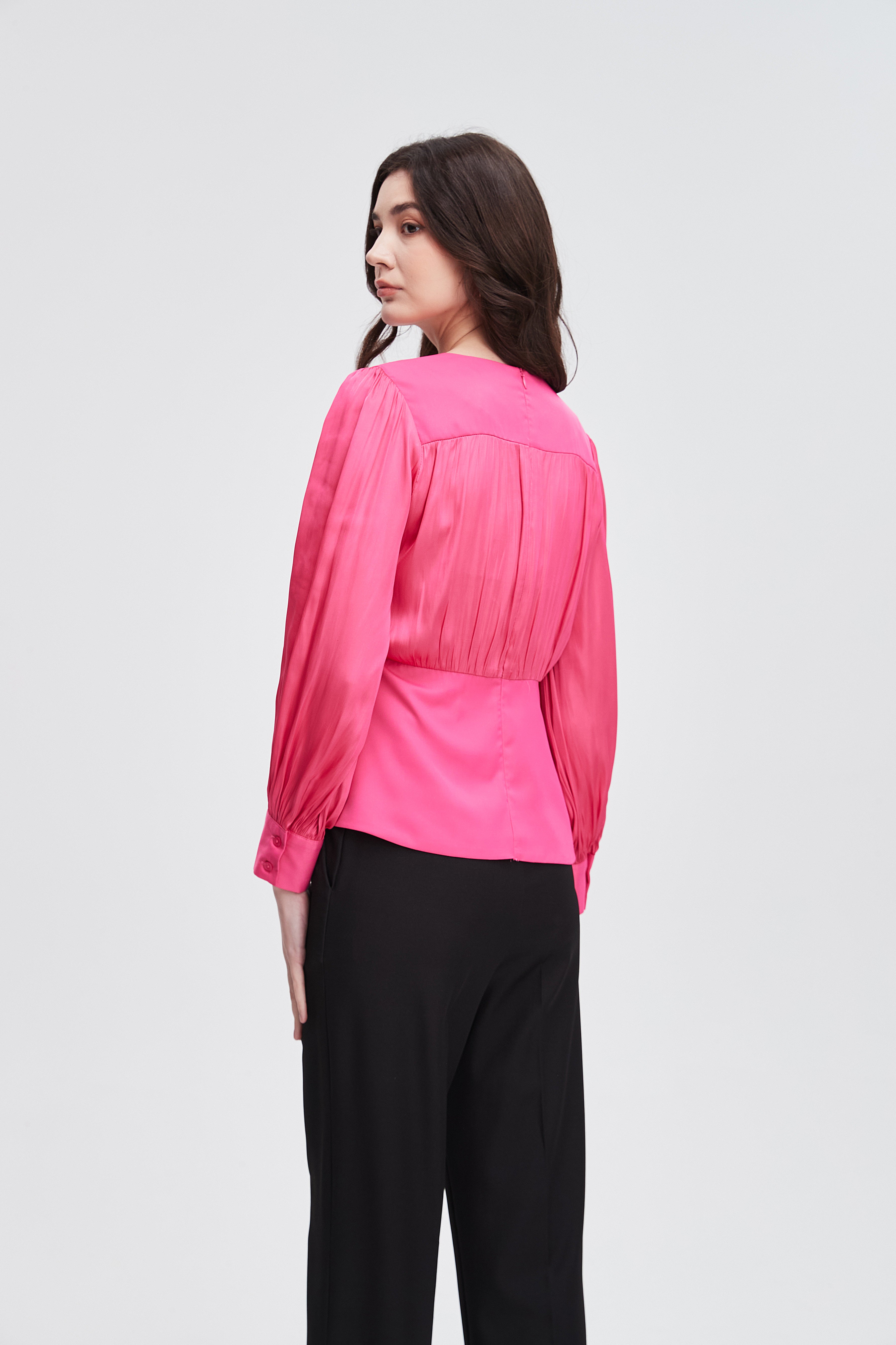 بلوزة موردة بياقة قميص وكم طويل بلوزة بطول الخصر