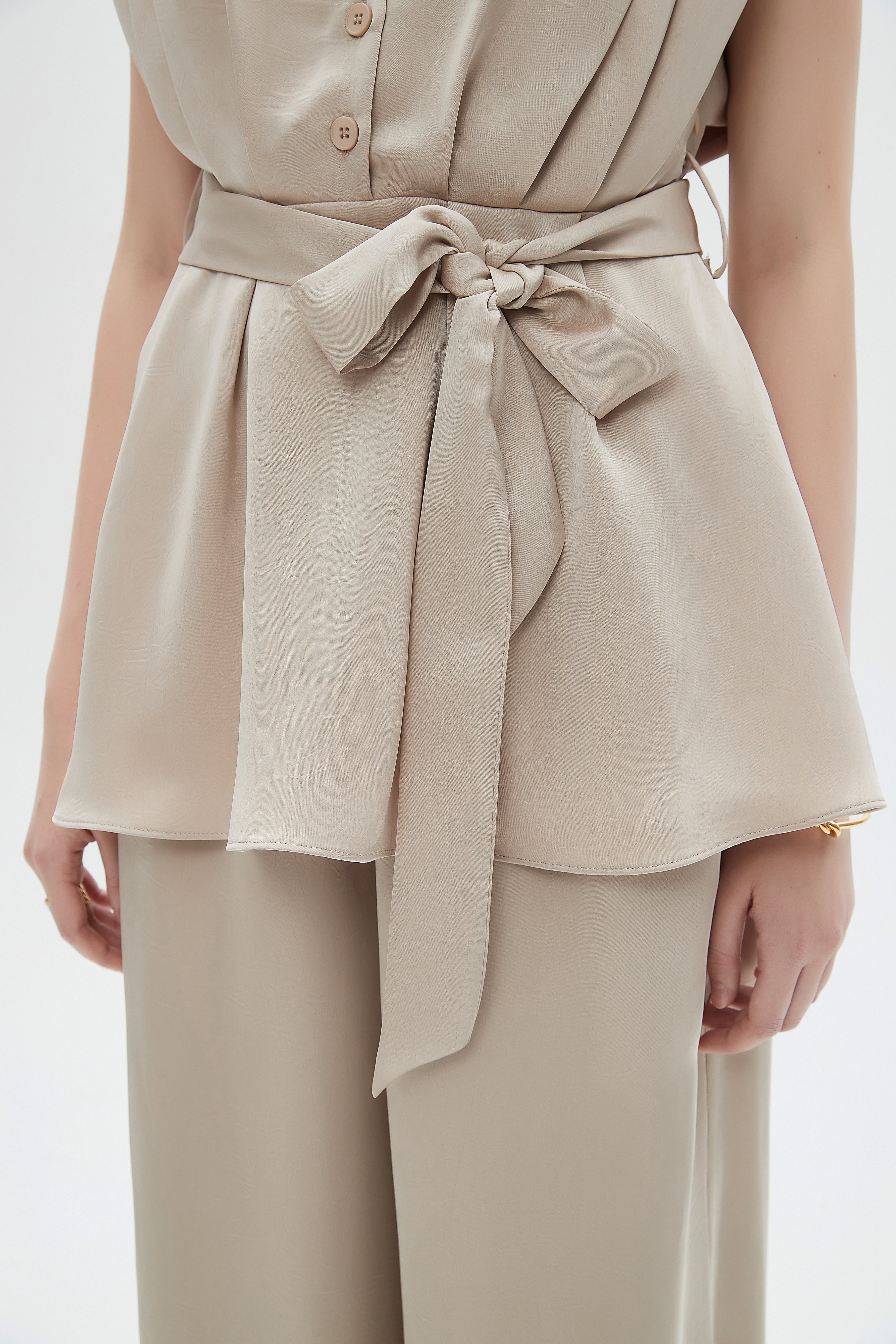 بلوزة نسائية بحزام بفتحة ياقة V بدون أكمام