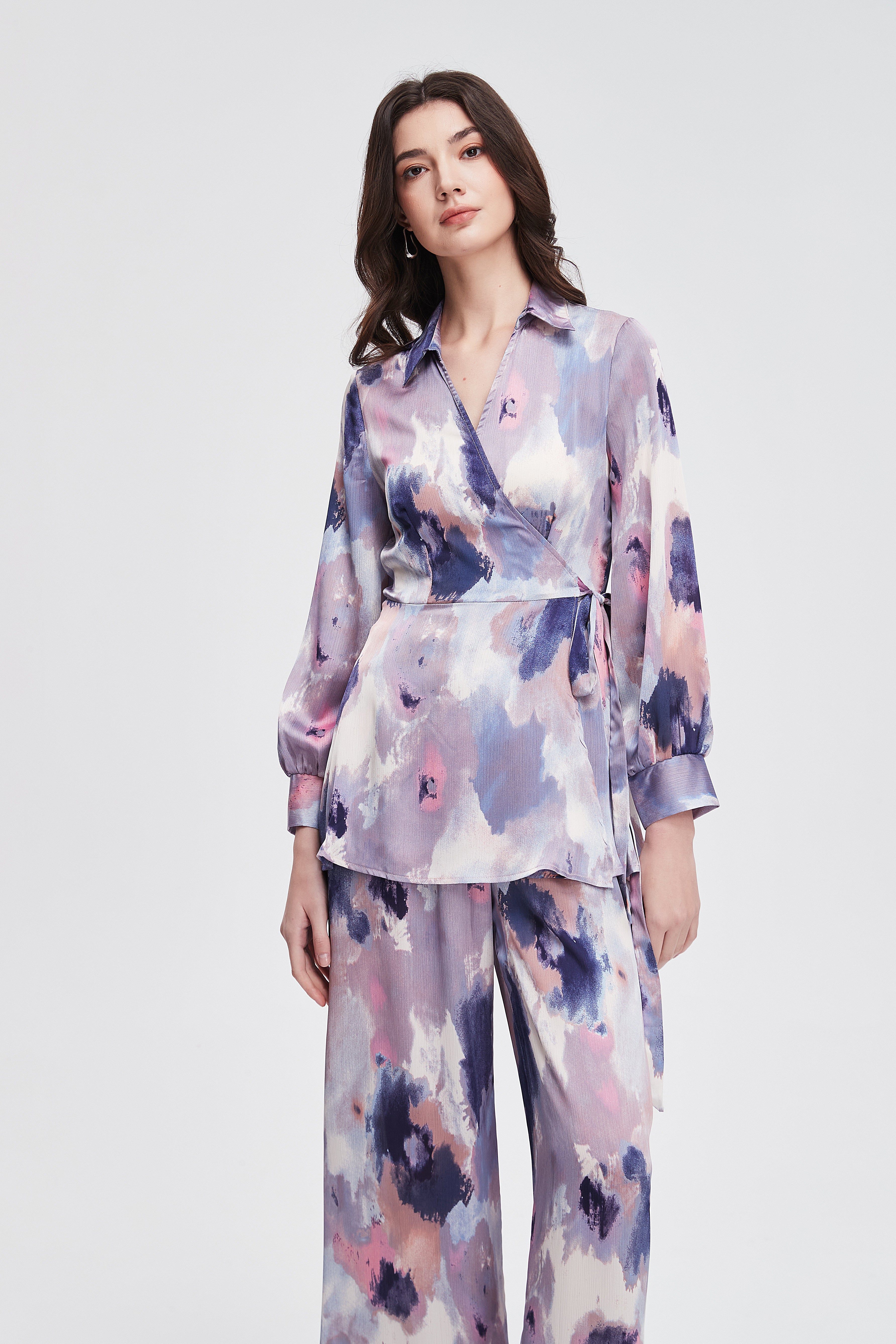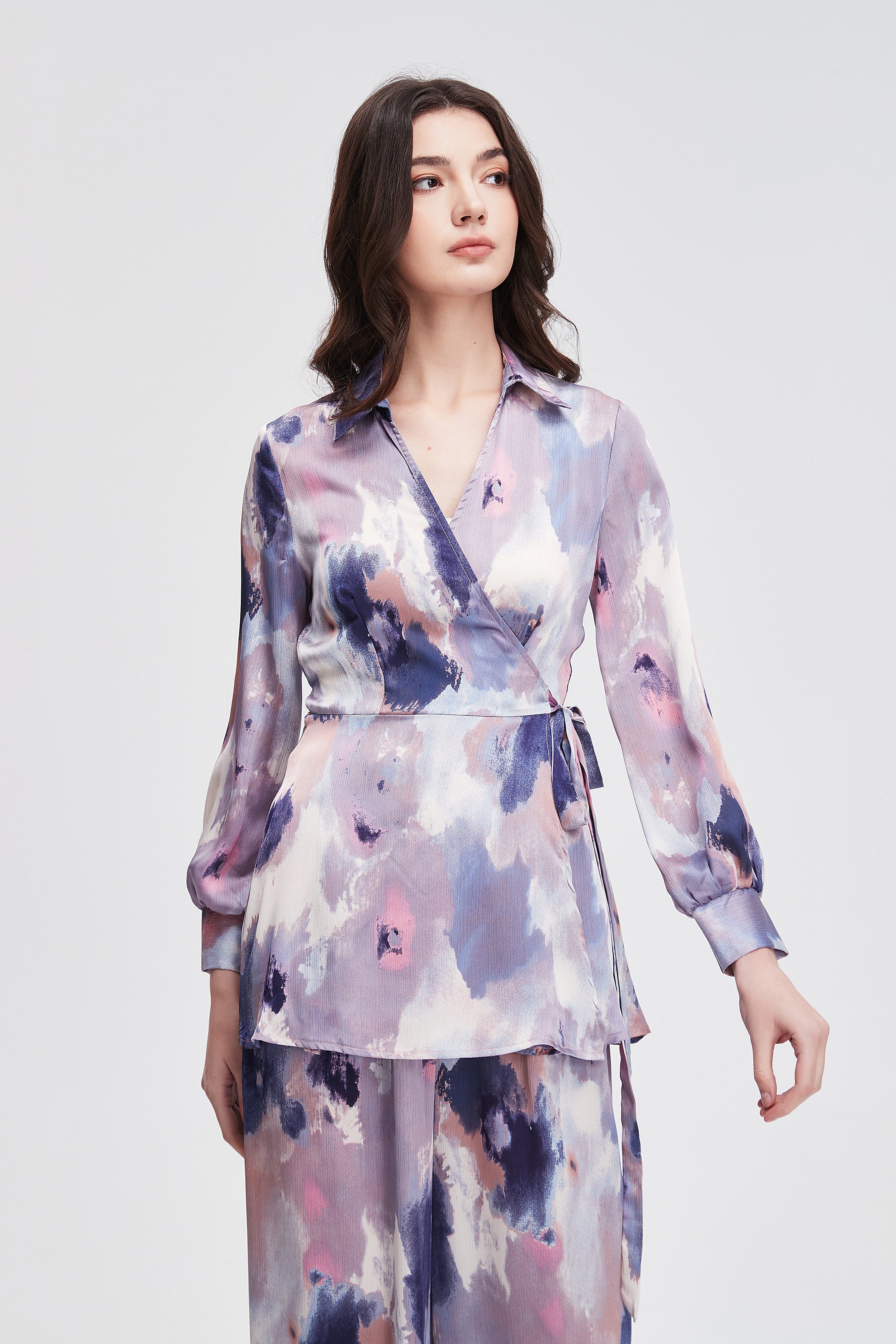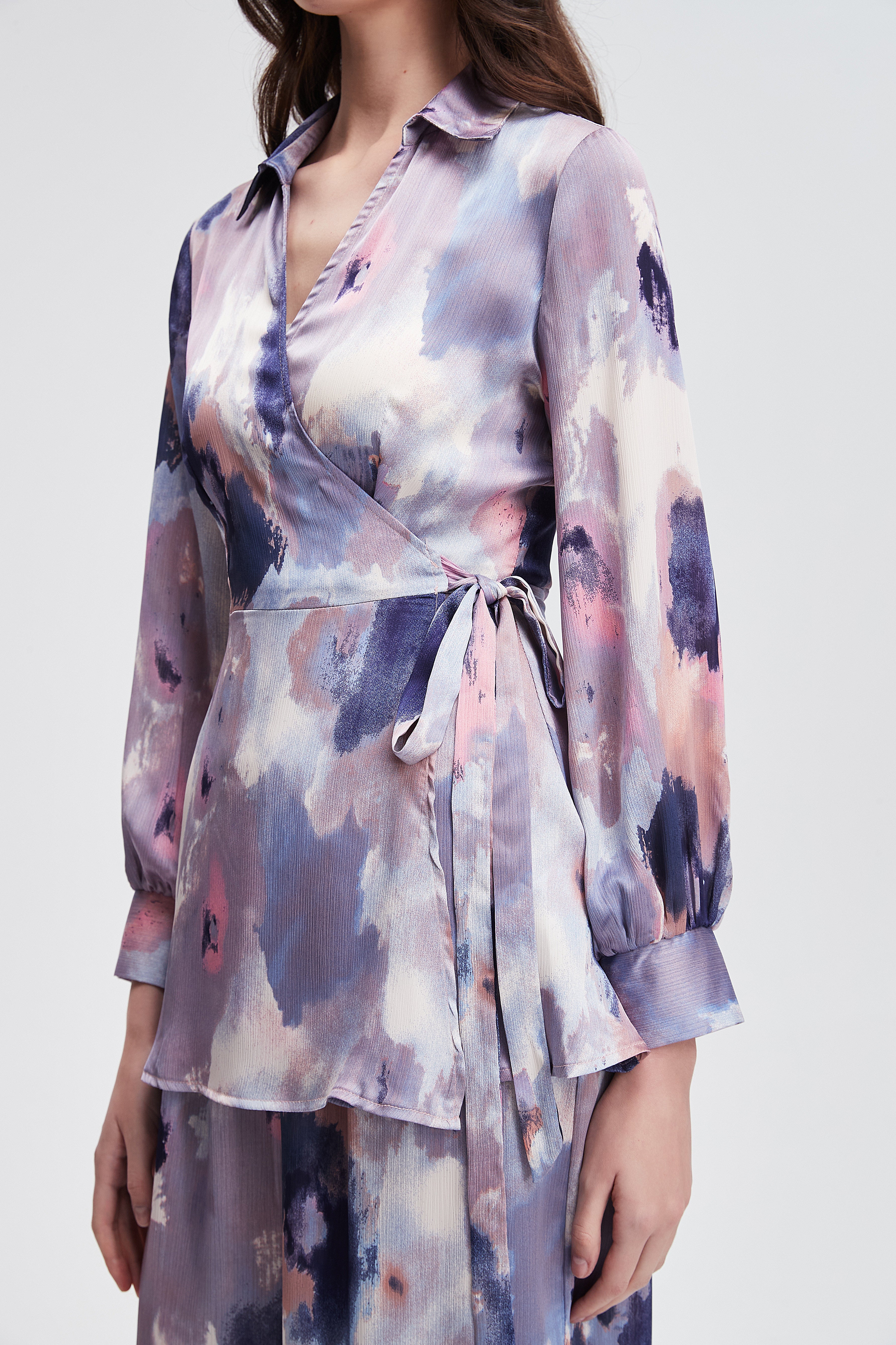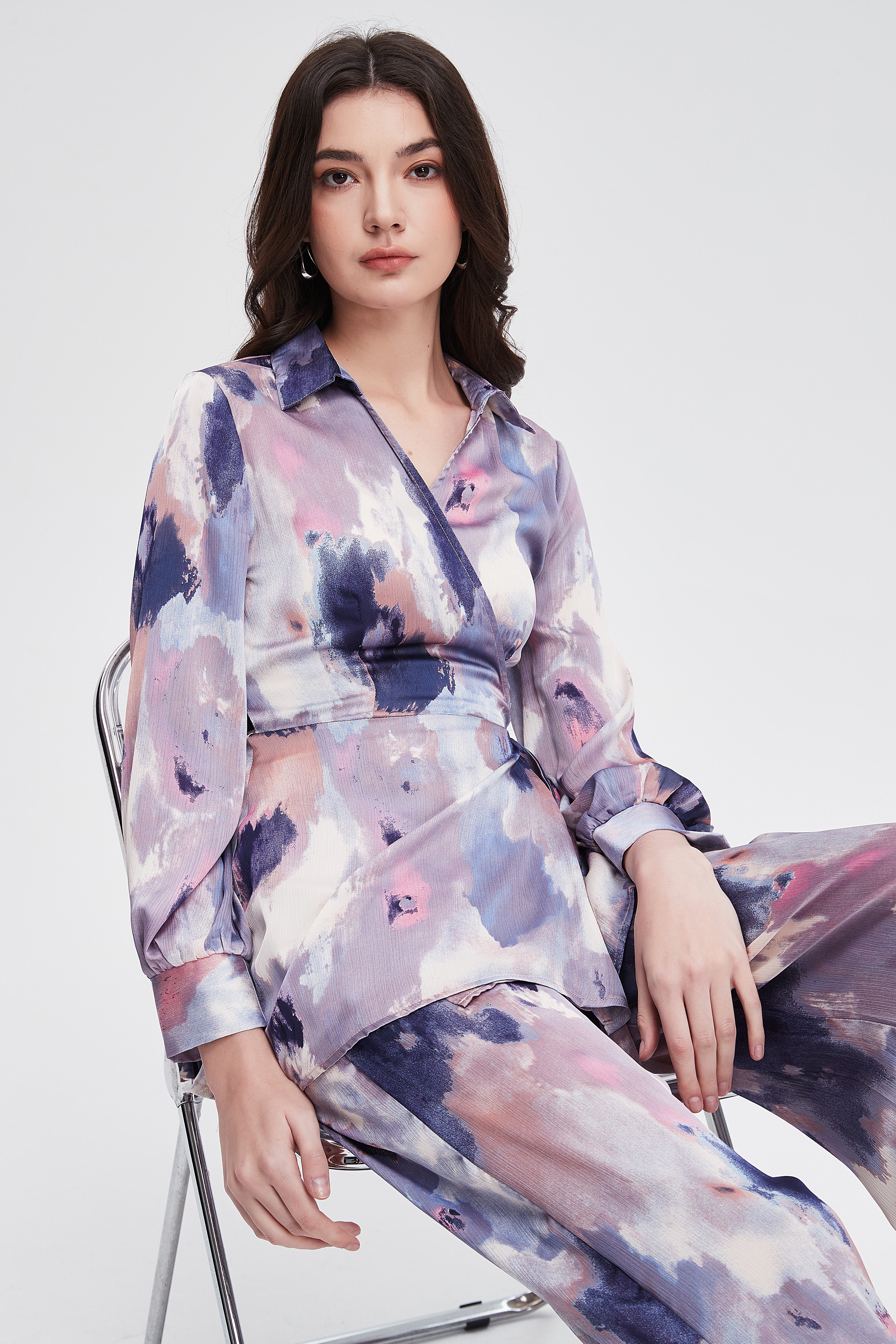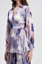 بلوزة نسائية بطول الركبة مطبوع بياقة قميص وكم طويل