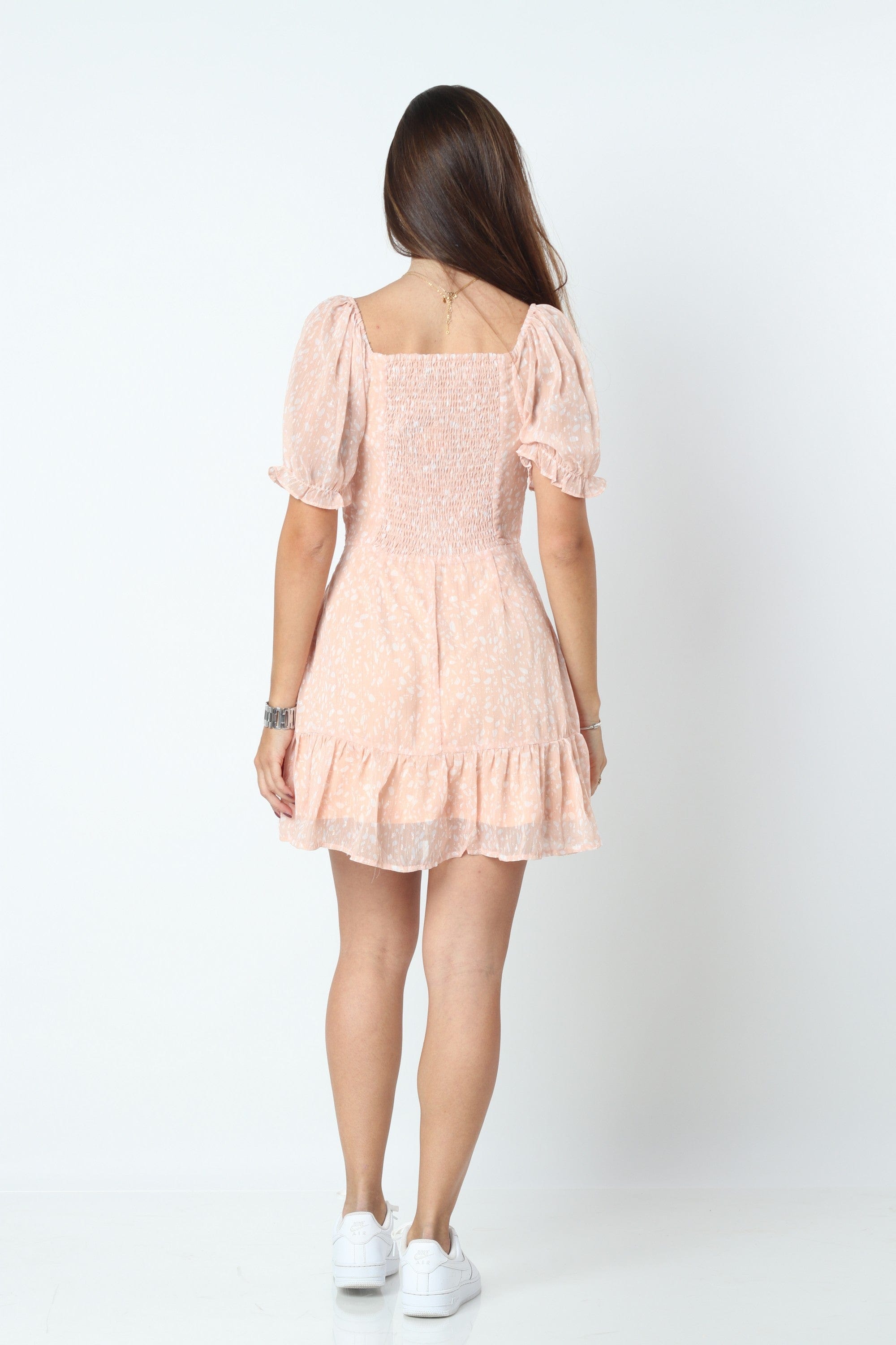 فستان شيفون قصير بفتحة صدر عميقة وأكمام نص كم منفوخة