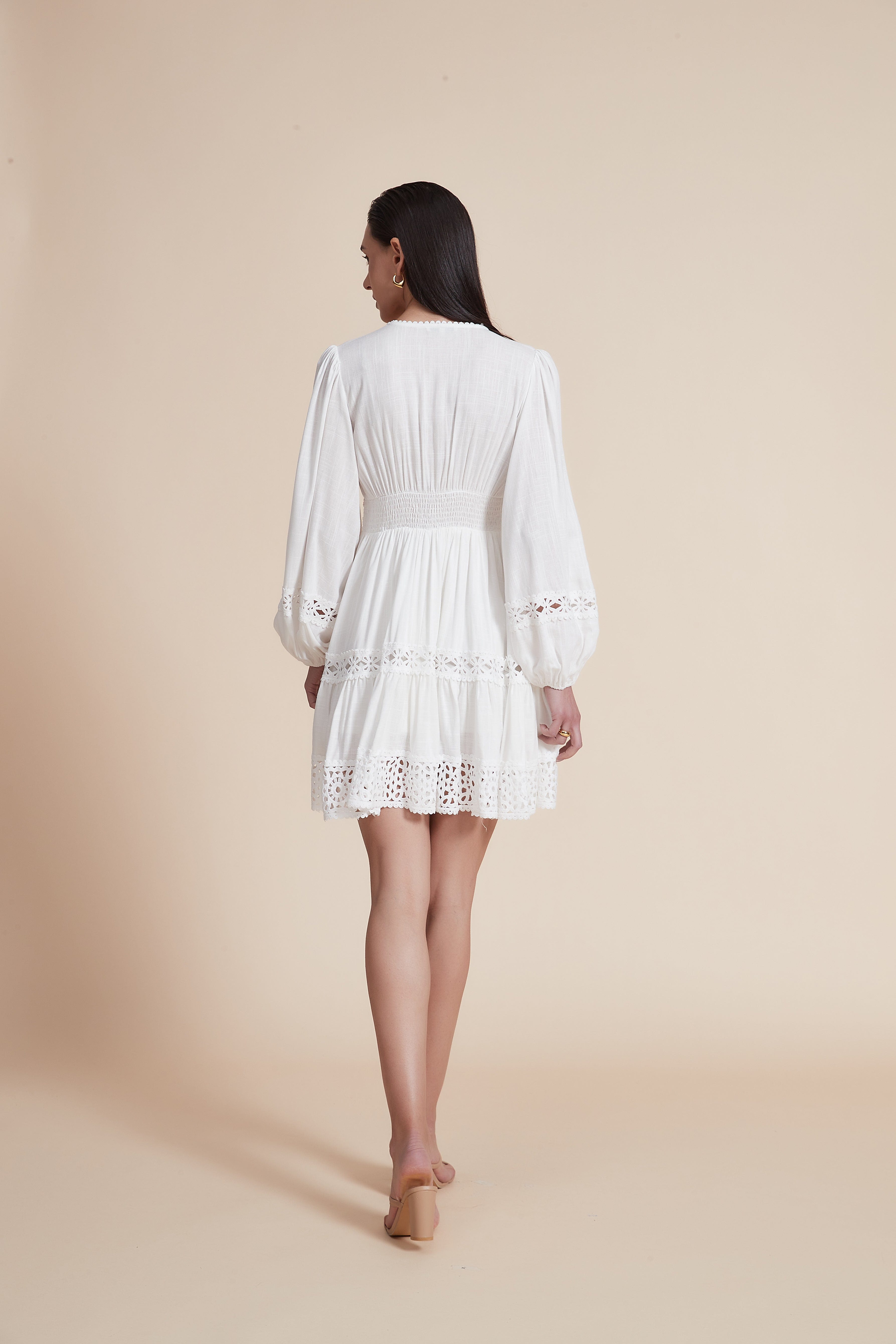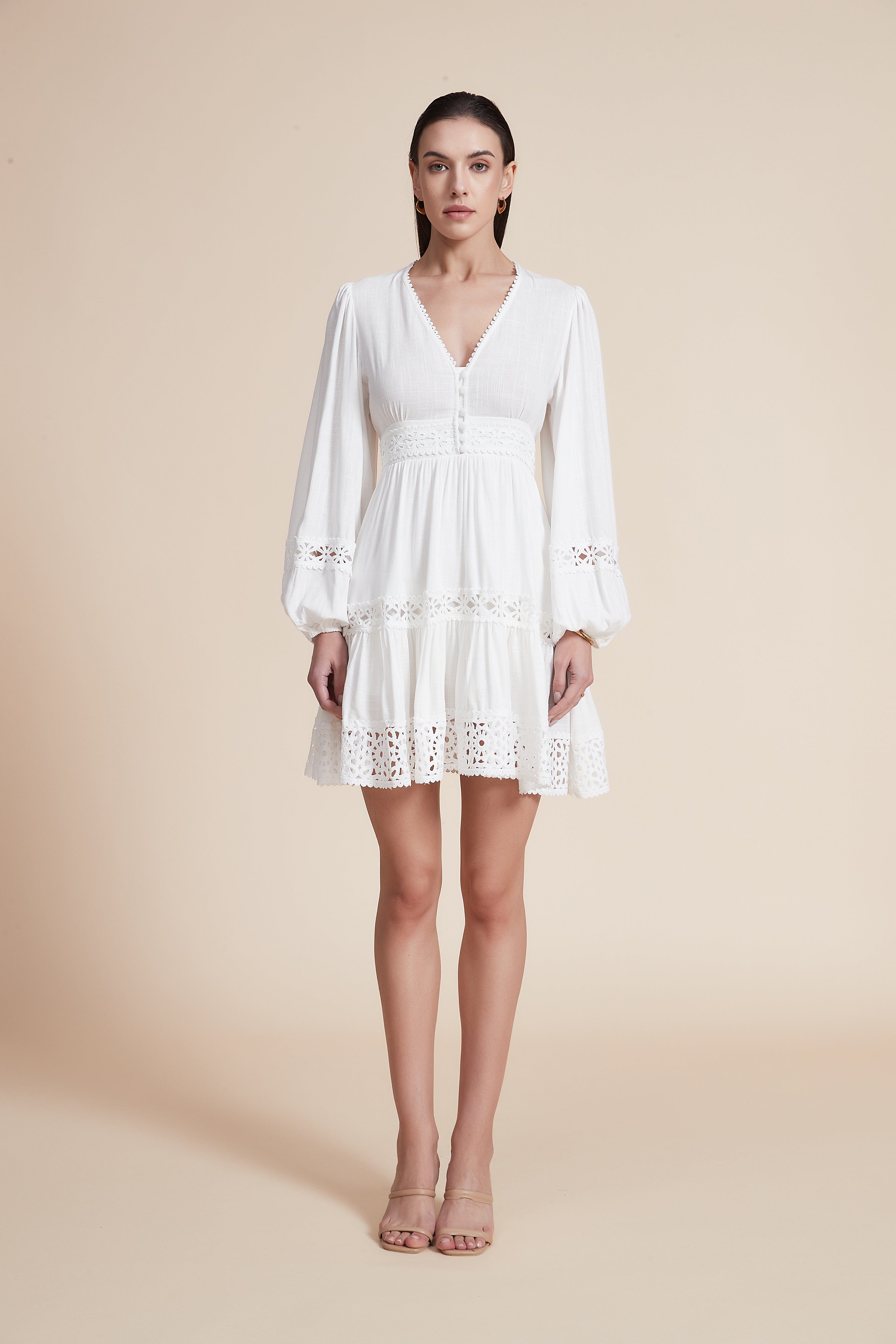 فستان قصير مخرم سادة بكم طويل ورقبة V