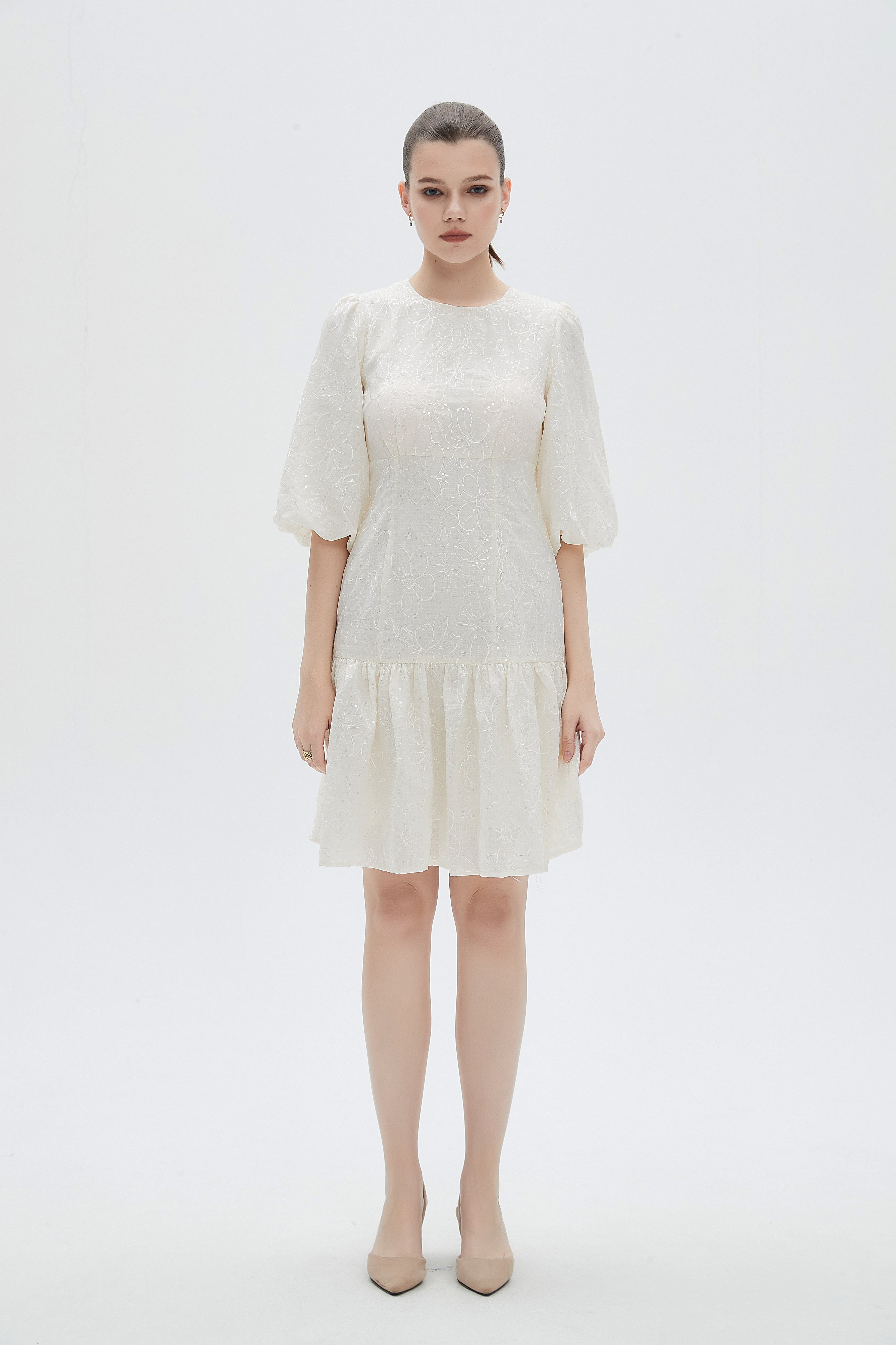 فستان نسائي بطول الركبة مكشكش نصف كم بف وزقبة مستديرة