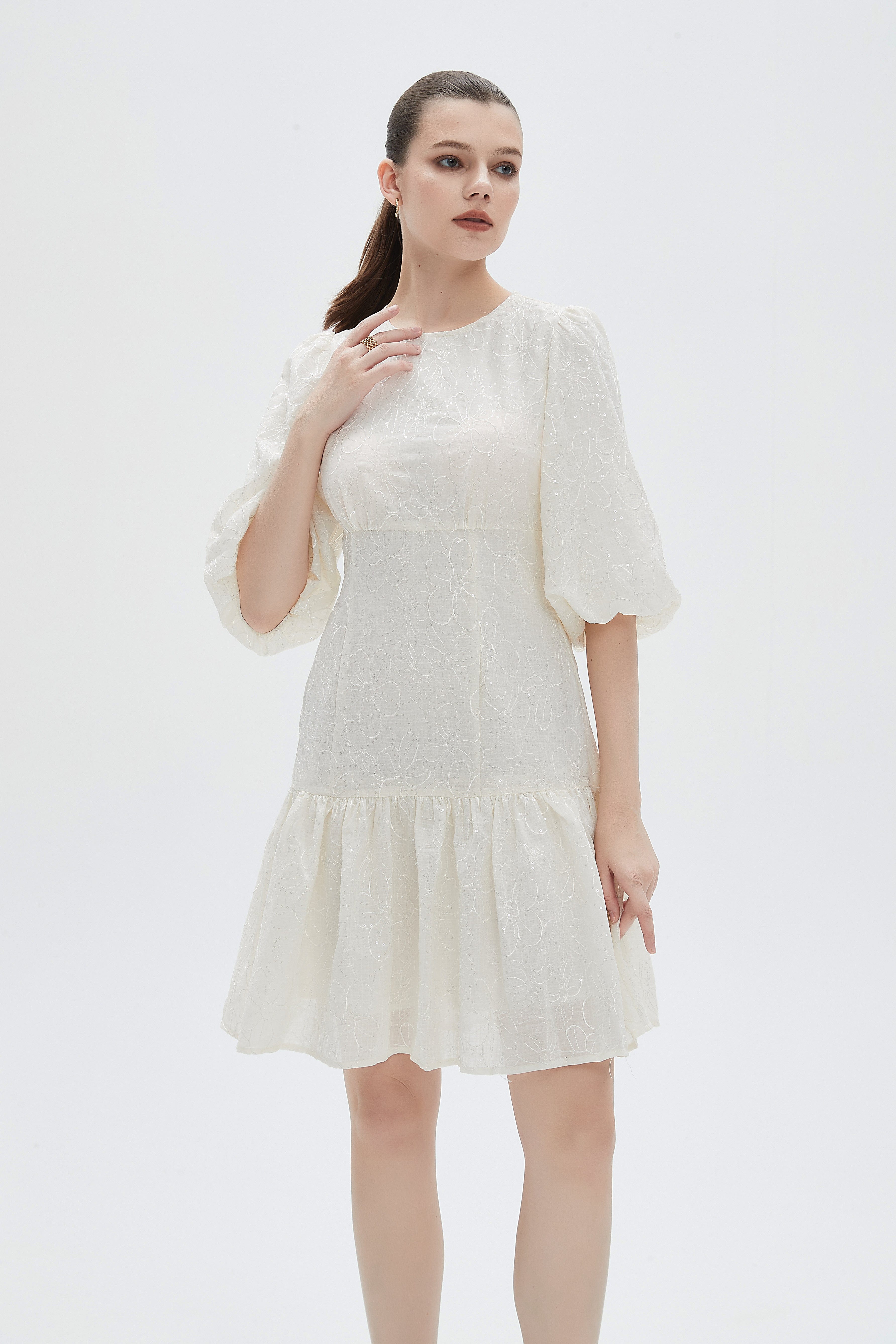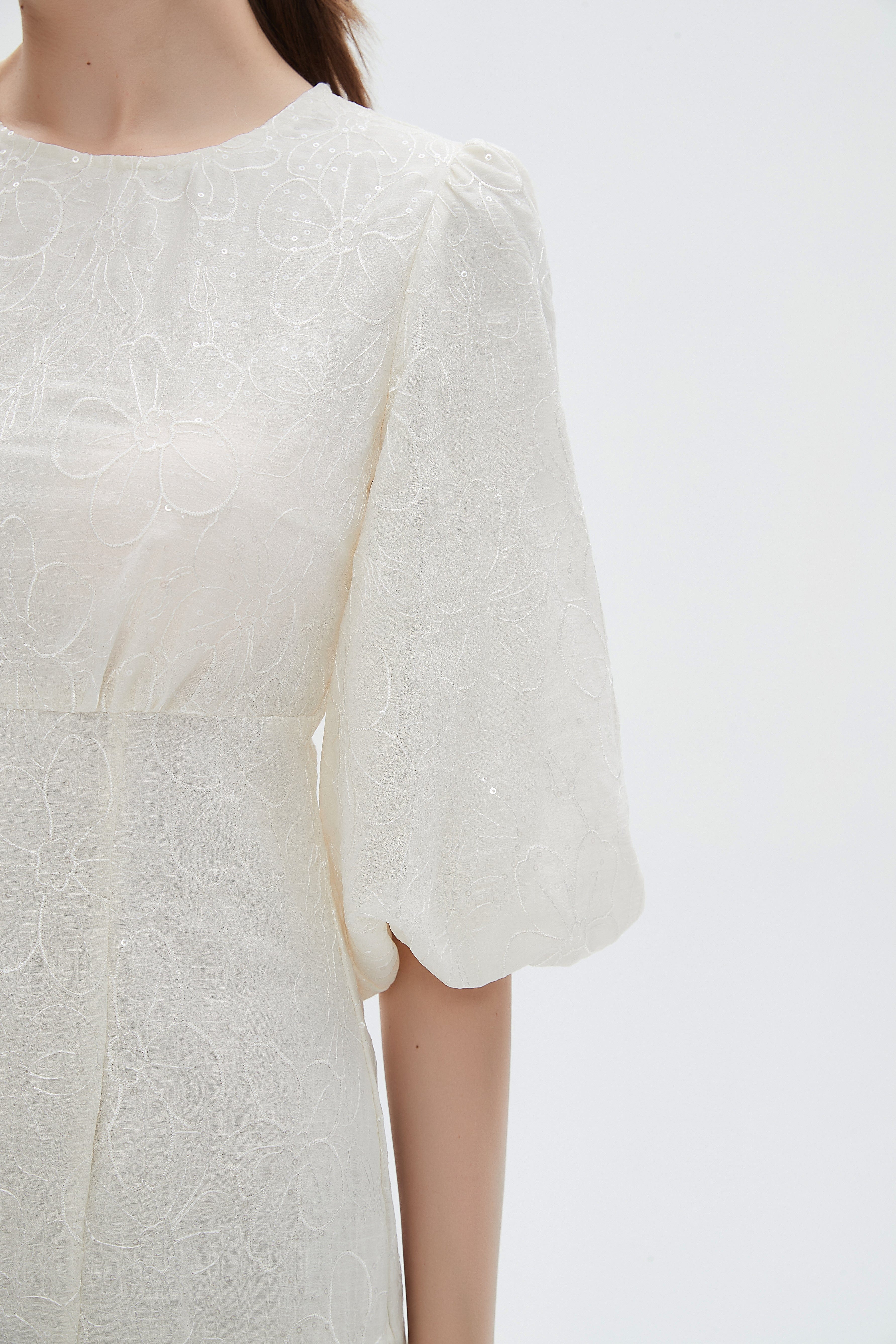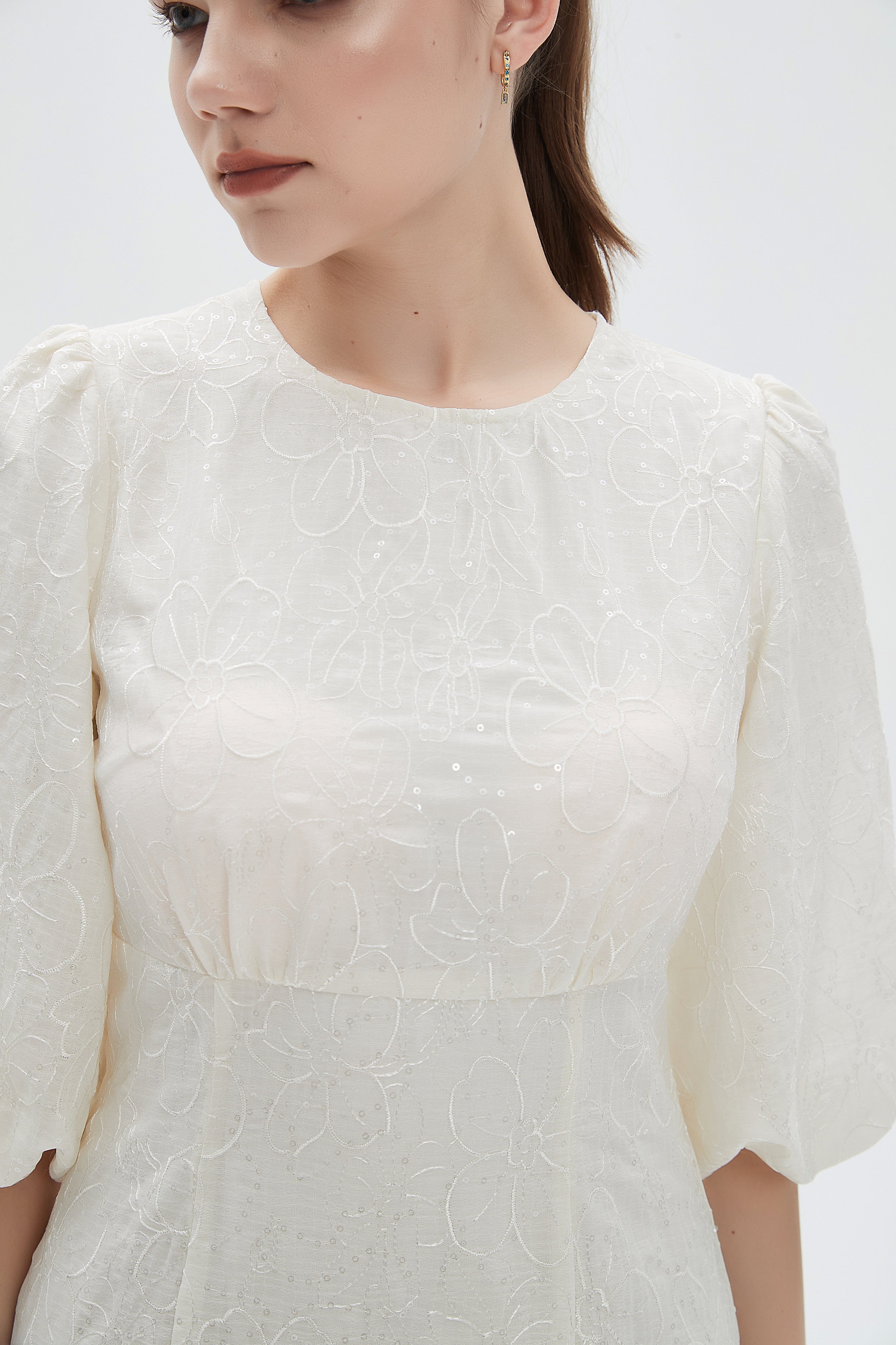 - ياقة مستديرة وأكمام منفوشة بطول ثلاثة أرباع