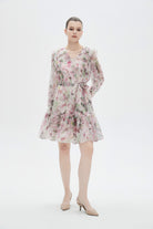فستان مورد مكشكش بطول الركبة مع فتحة رقبة على شكل V وأكمام طويلة واسعة