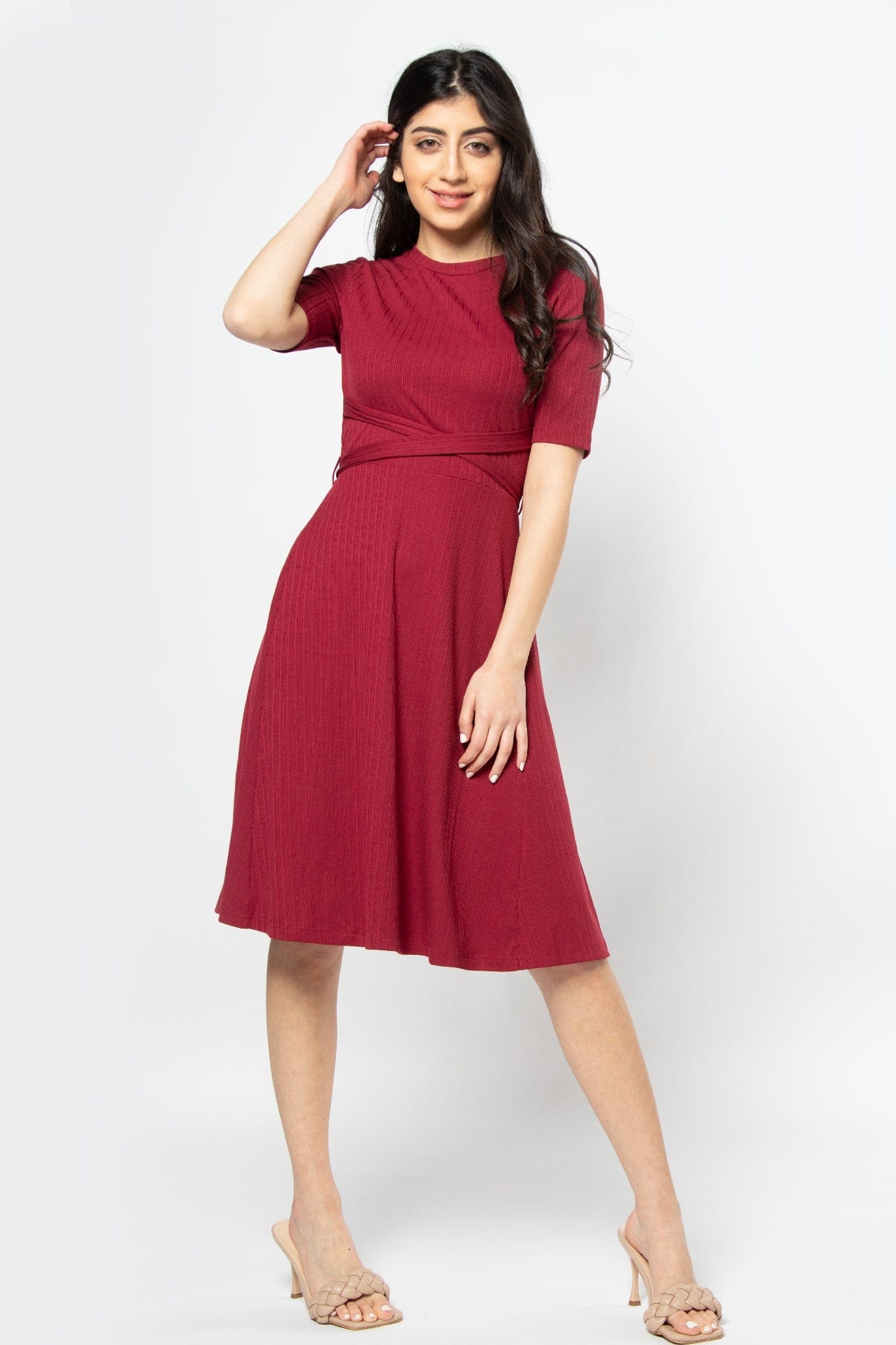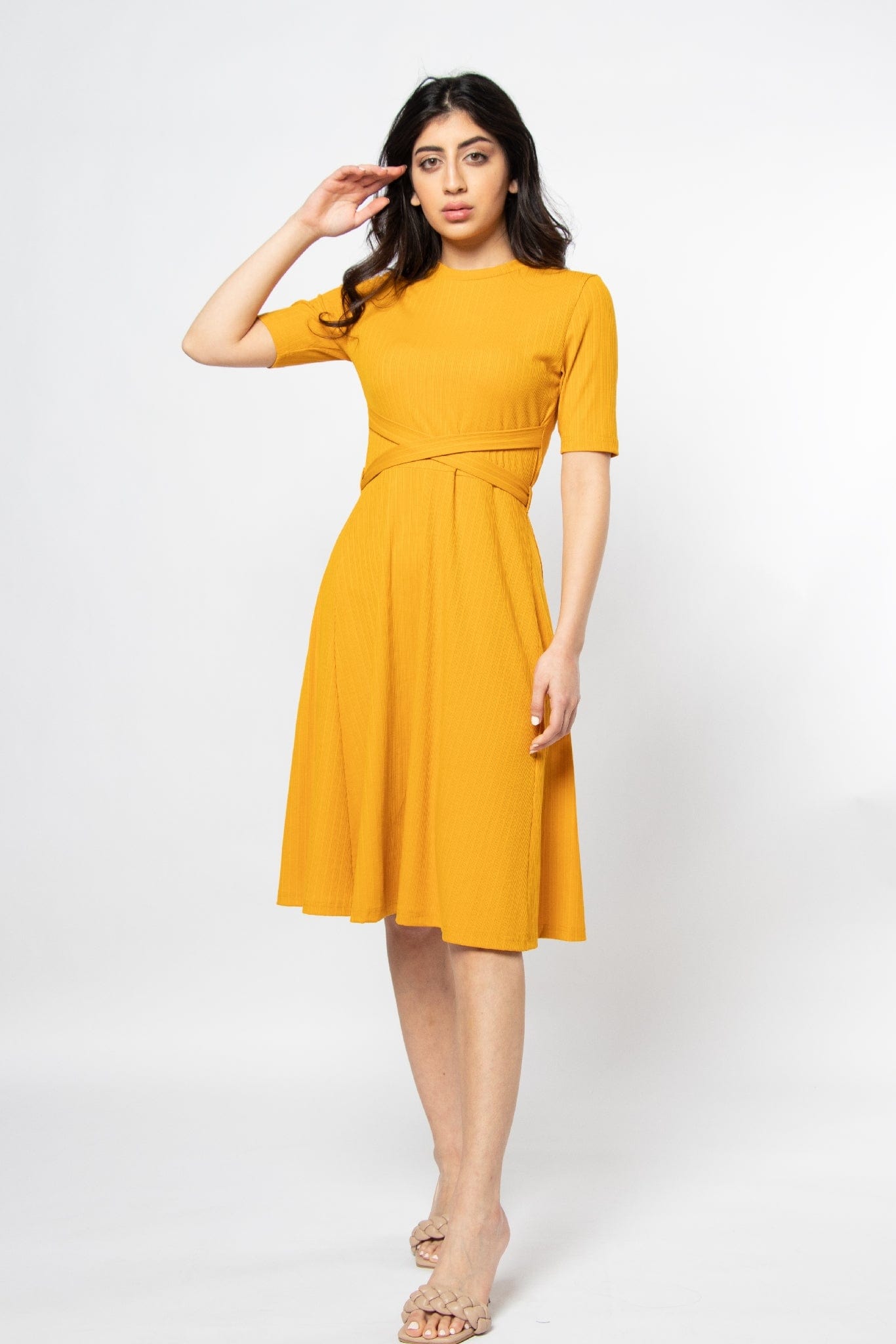 فستان ميدي أكمام قصير مزموم بياقة دائرية