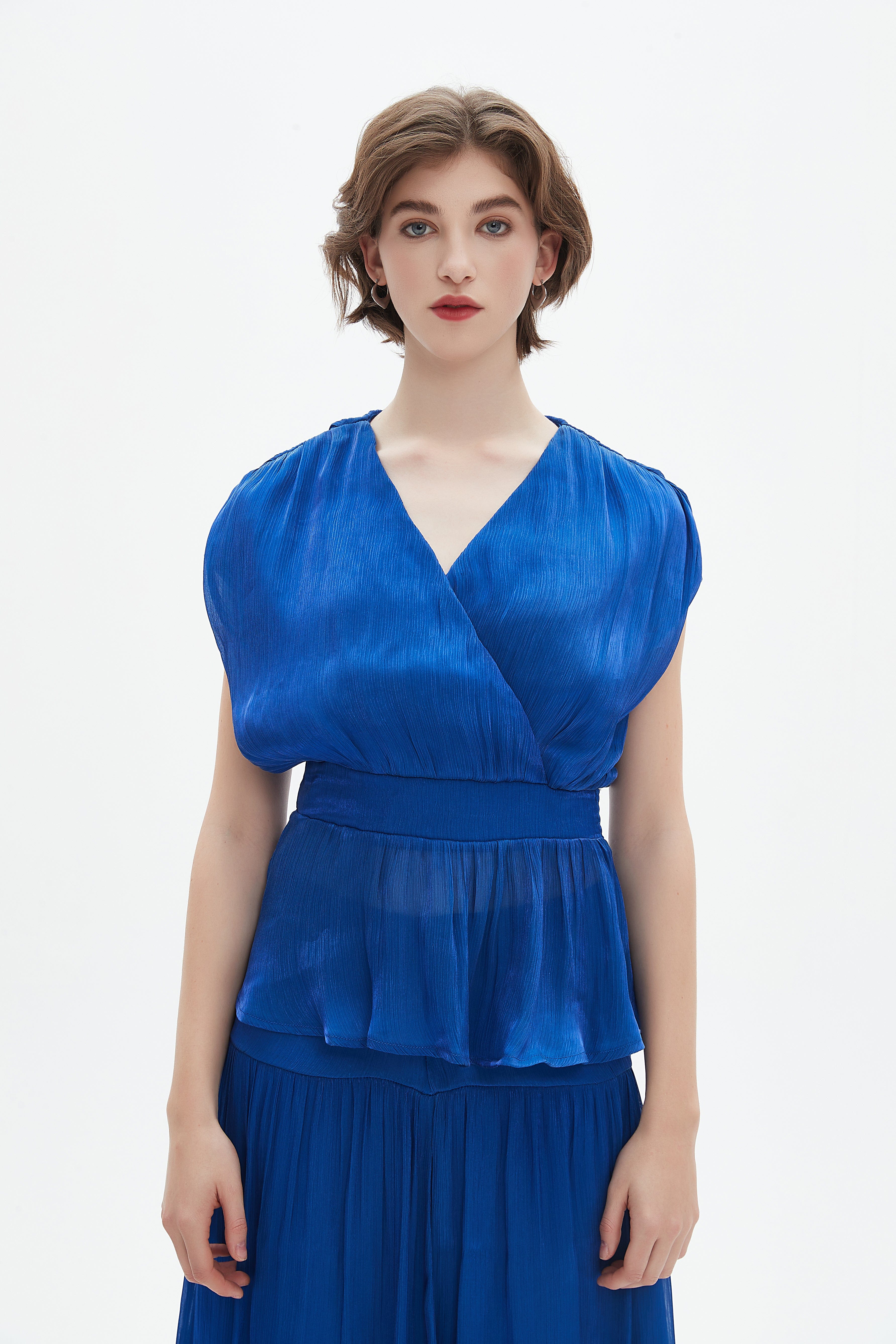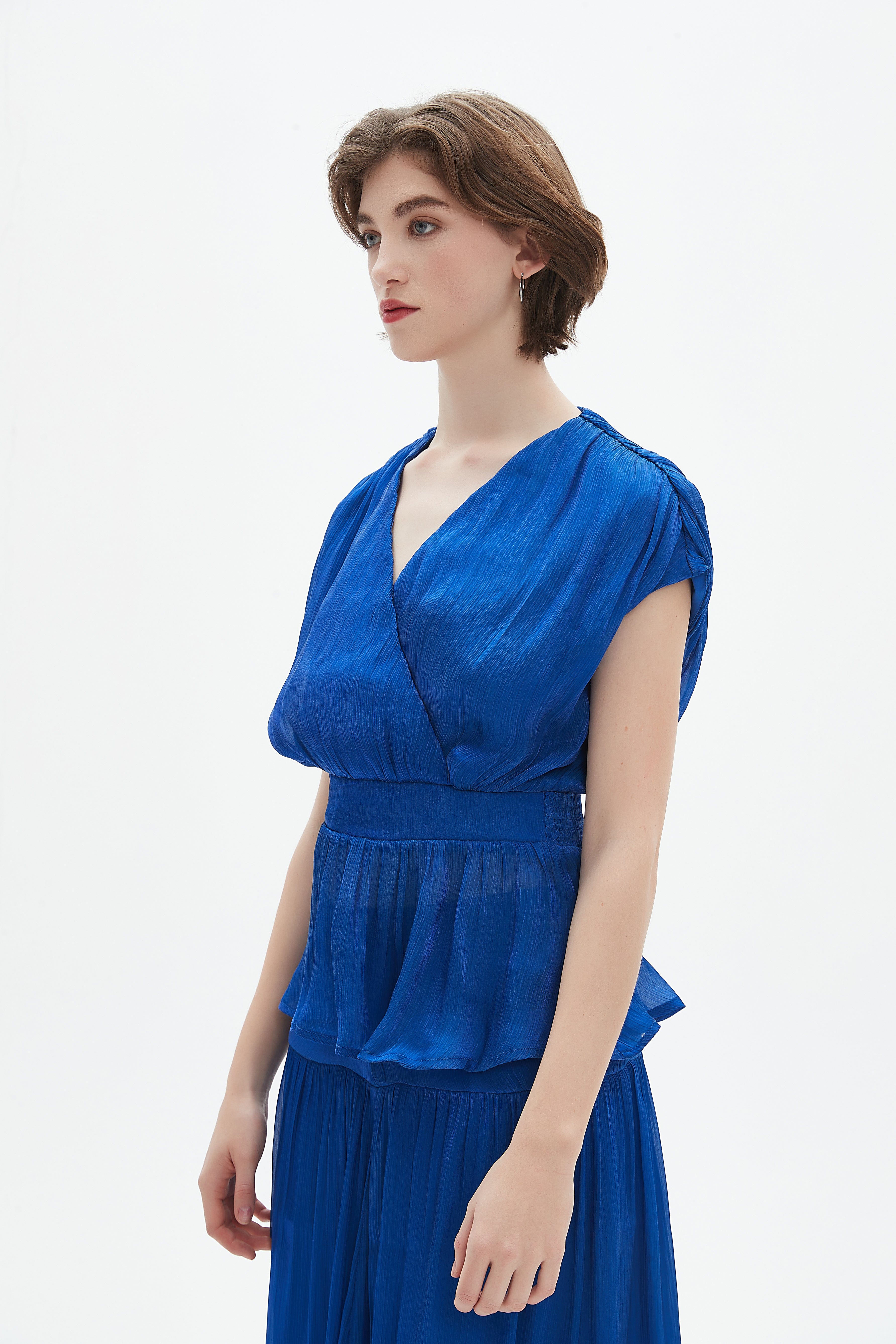 بلوزة نسائية بطول الخصر كم قصير وفتحة رقبة على شكل V