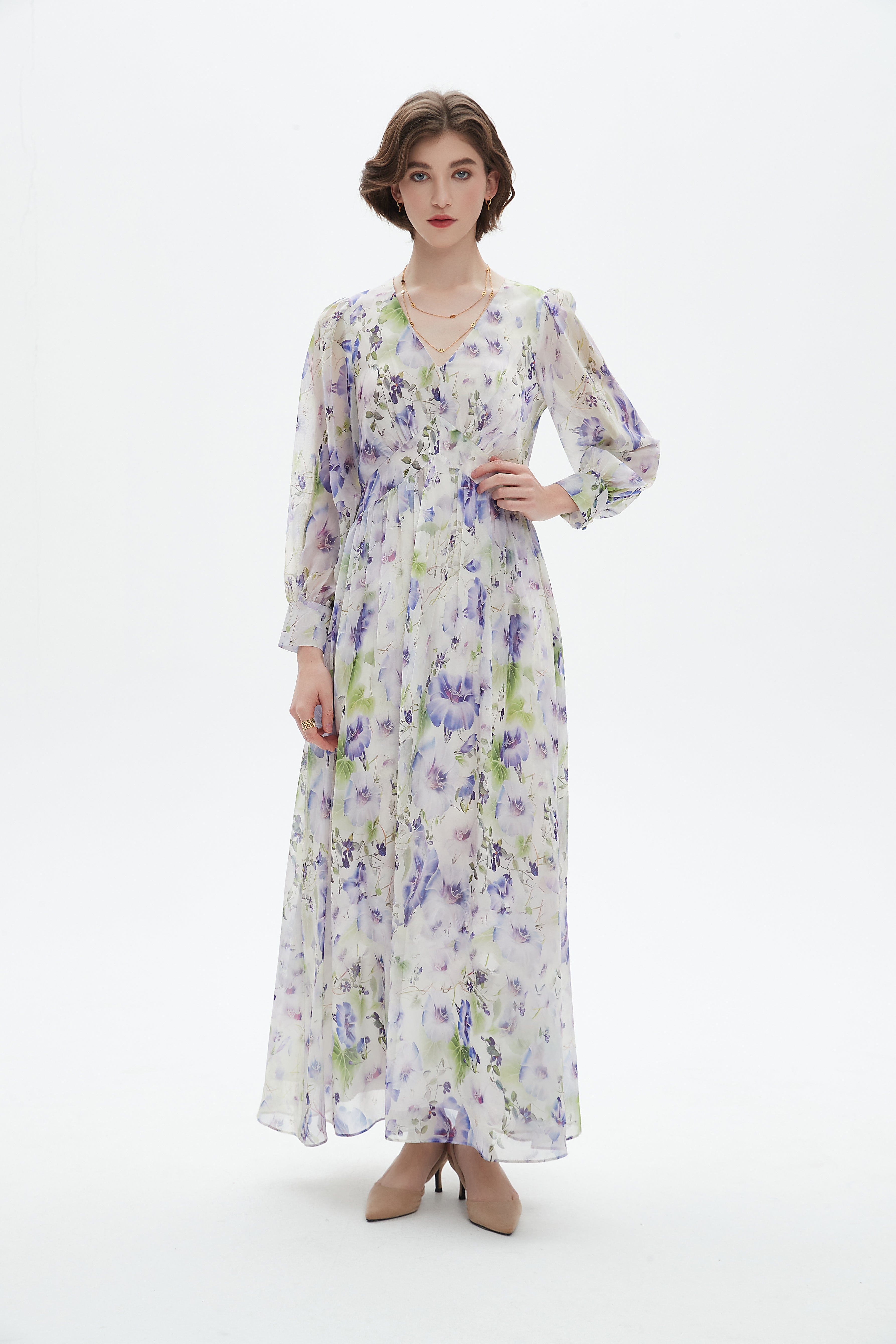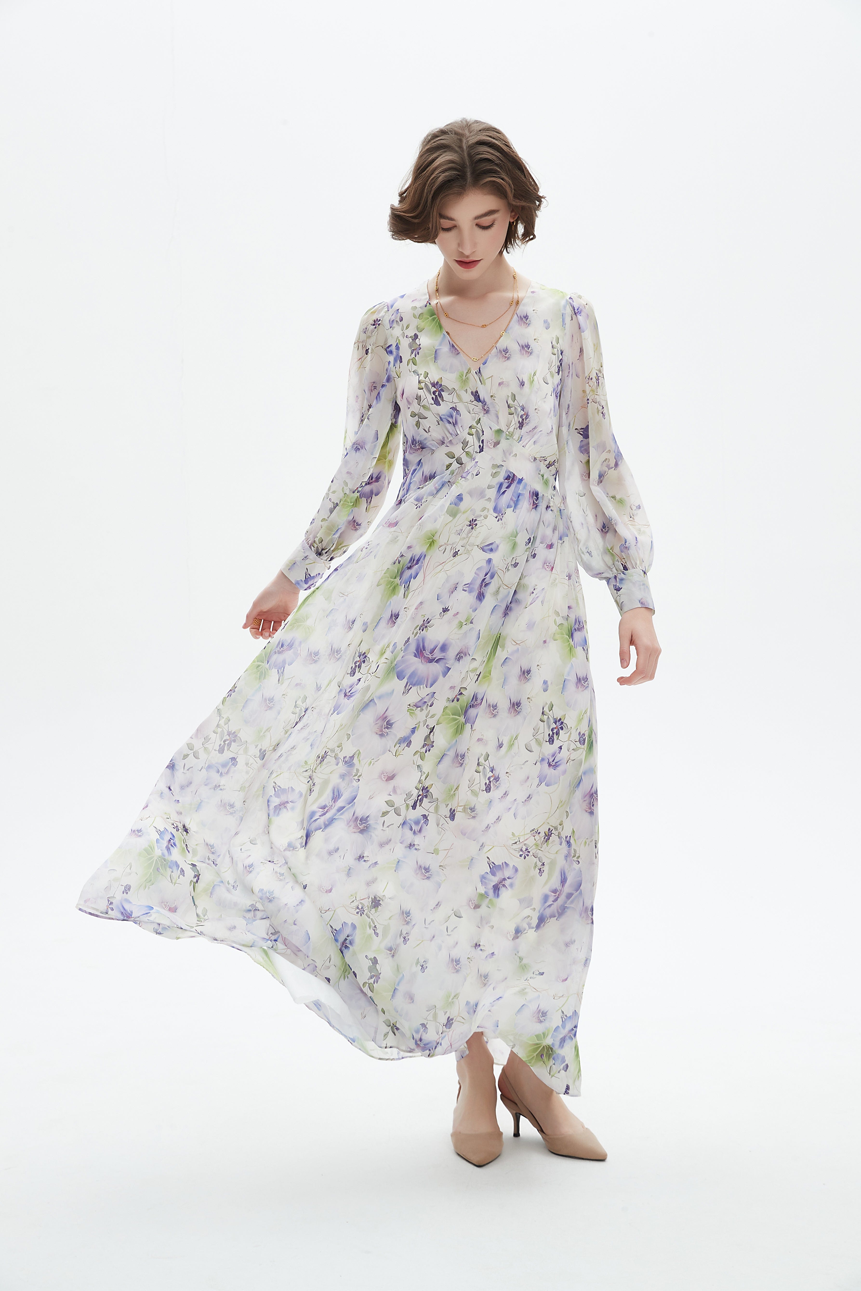 فستان نسائي طويل مورد برقبة على شكل v بقصة واسعة