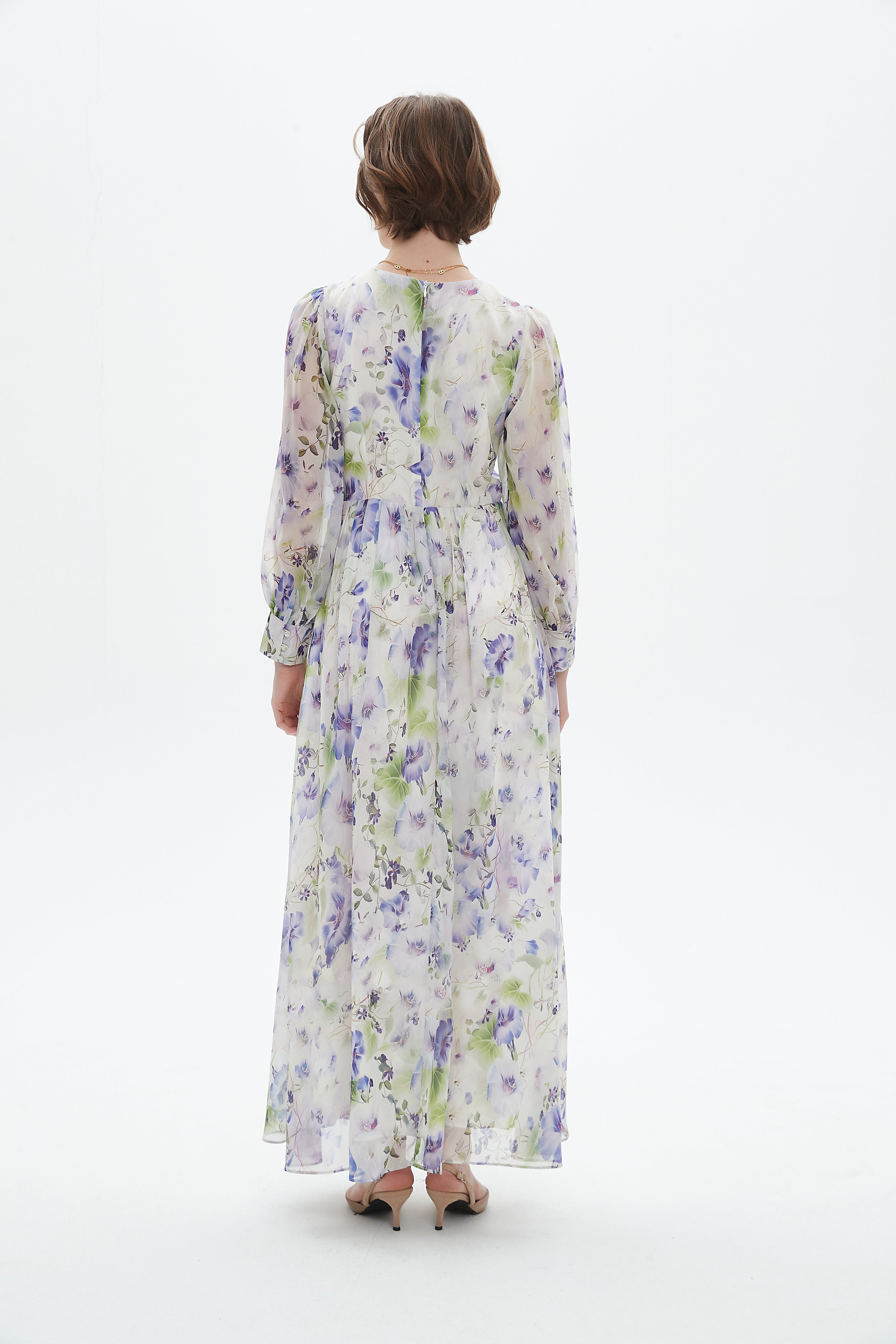 فستان طويل نصف كم مكشكش وفتحة رقبة مستديرة مشجر