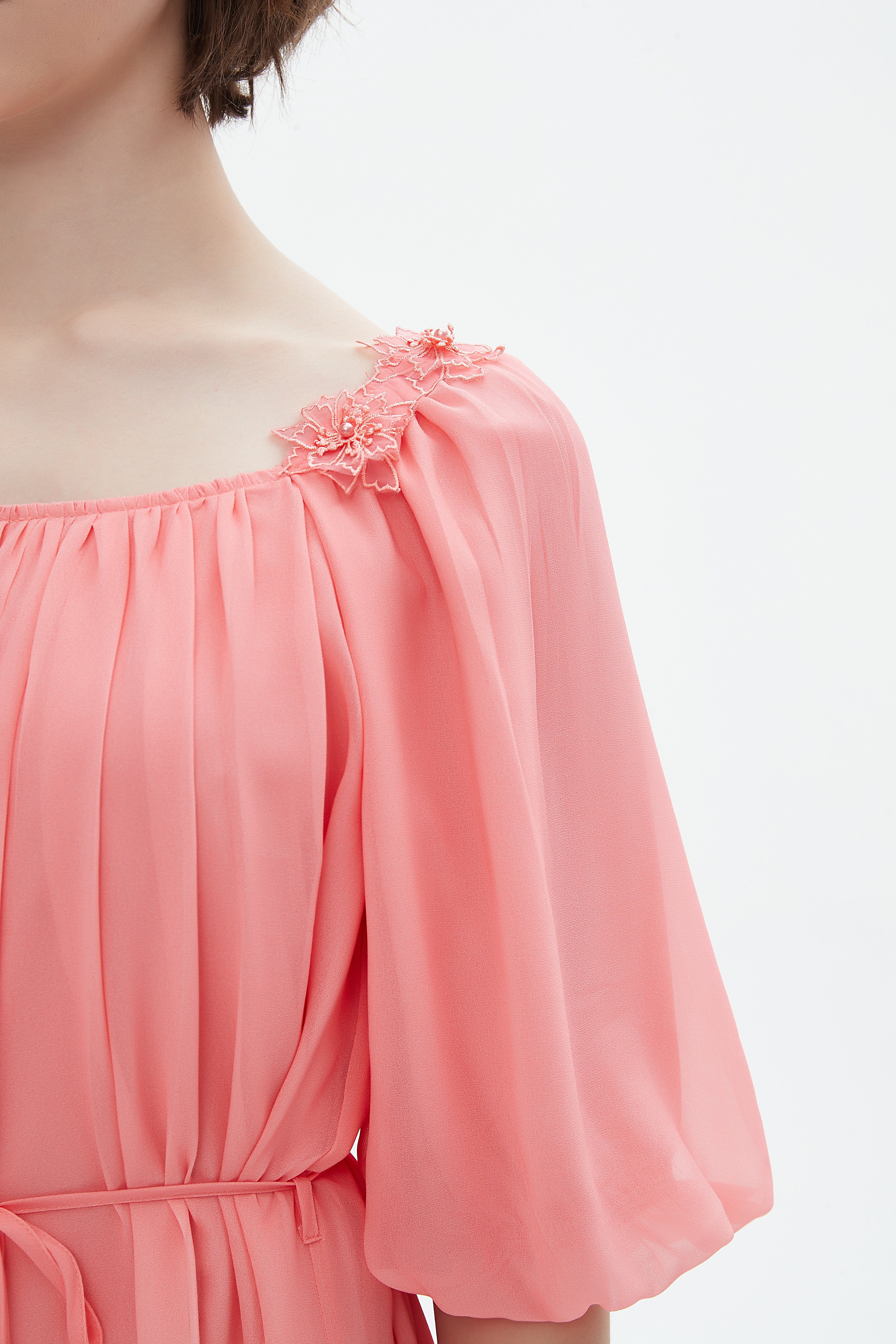 فستان قصير كم قصير مكشكش افتحة رقبة دائرية مورد