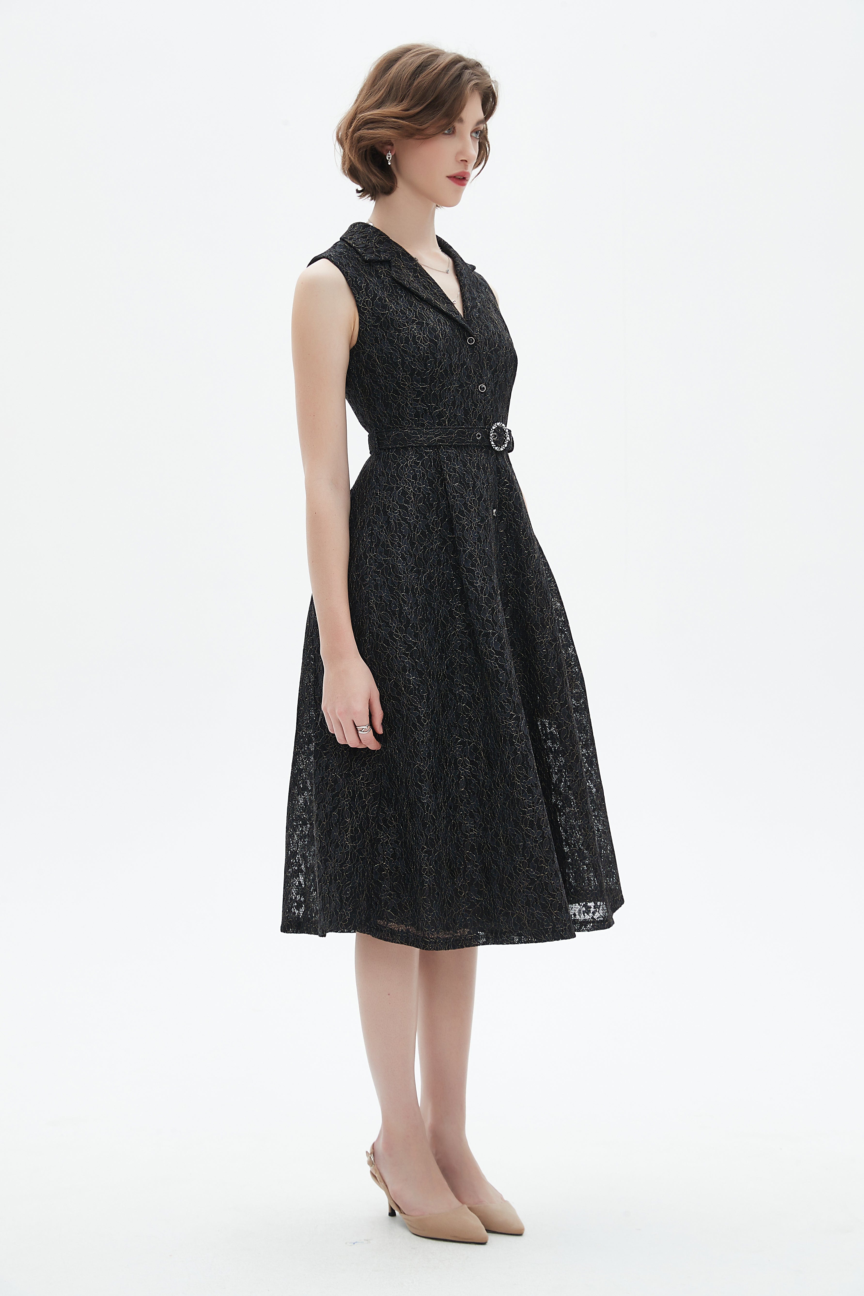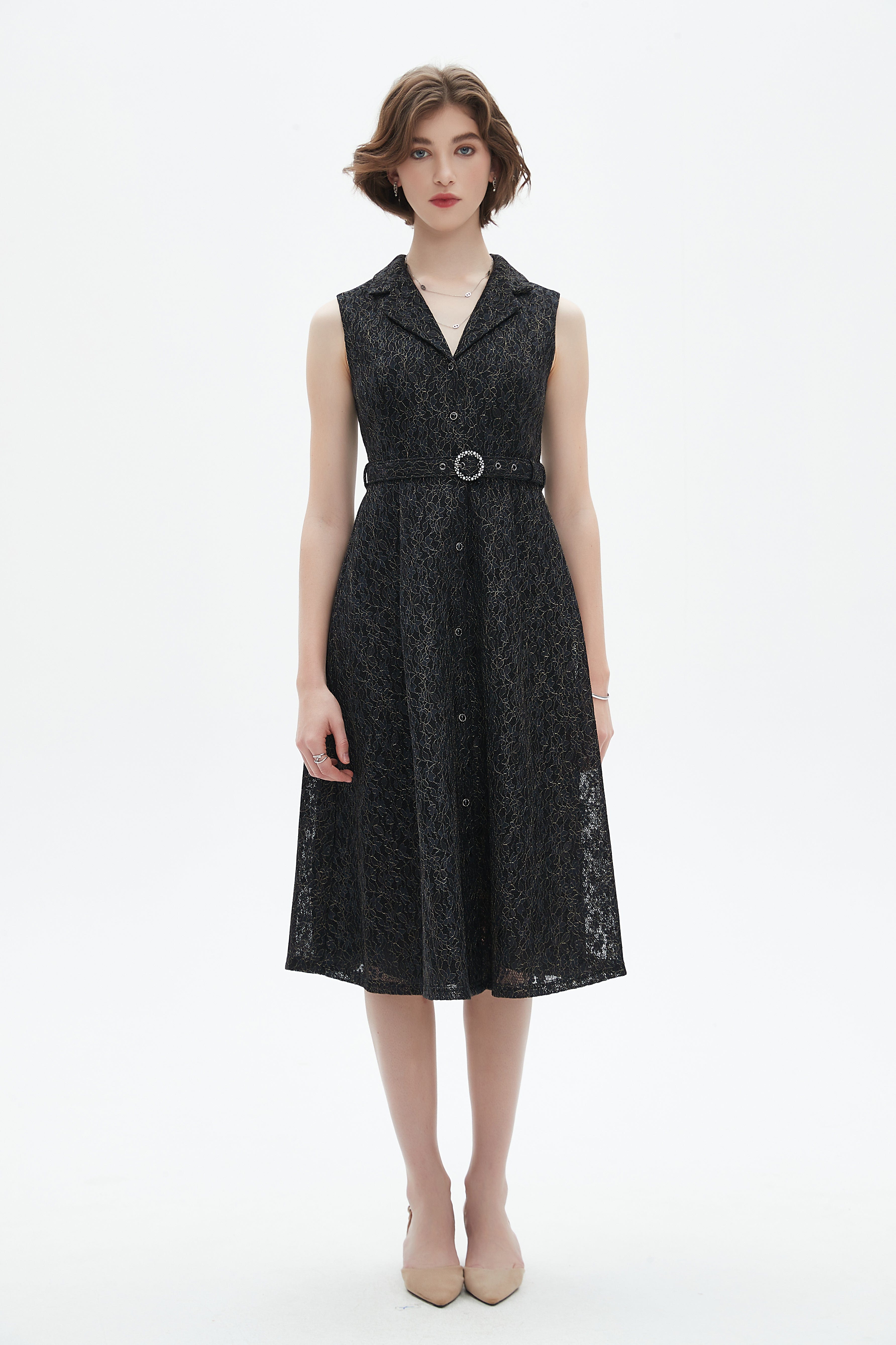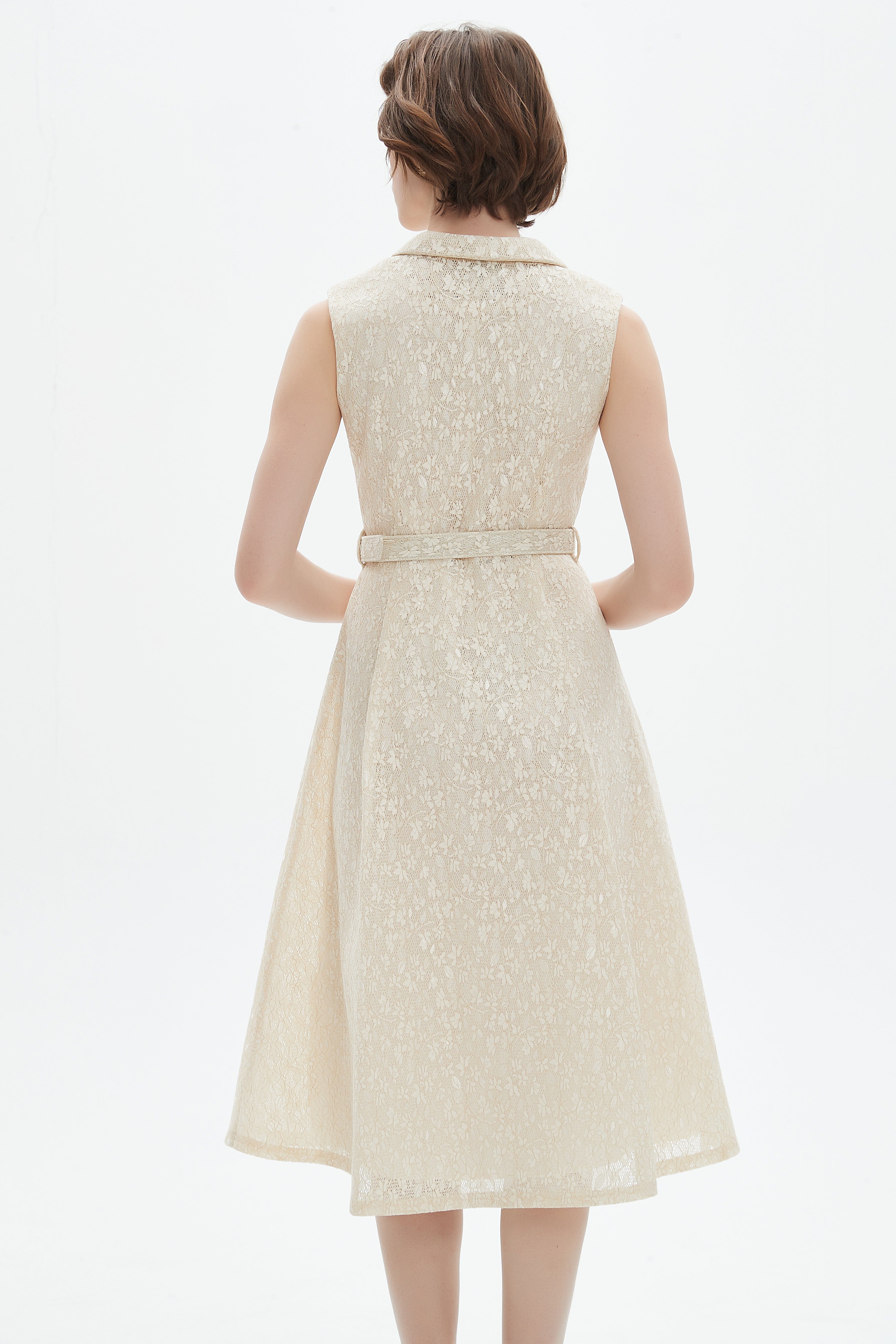 فستان قصير بدون أكمام بفتحة رقبة دائرية وتفاصيل دانتيل