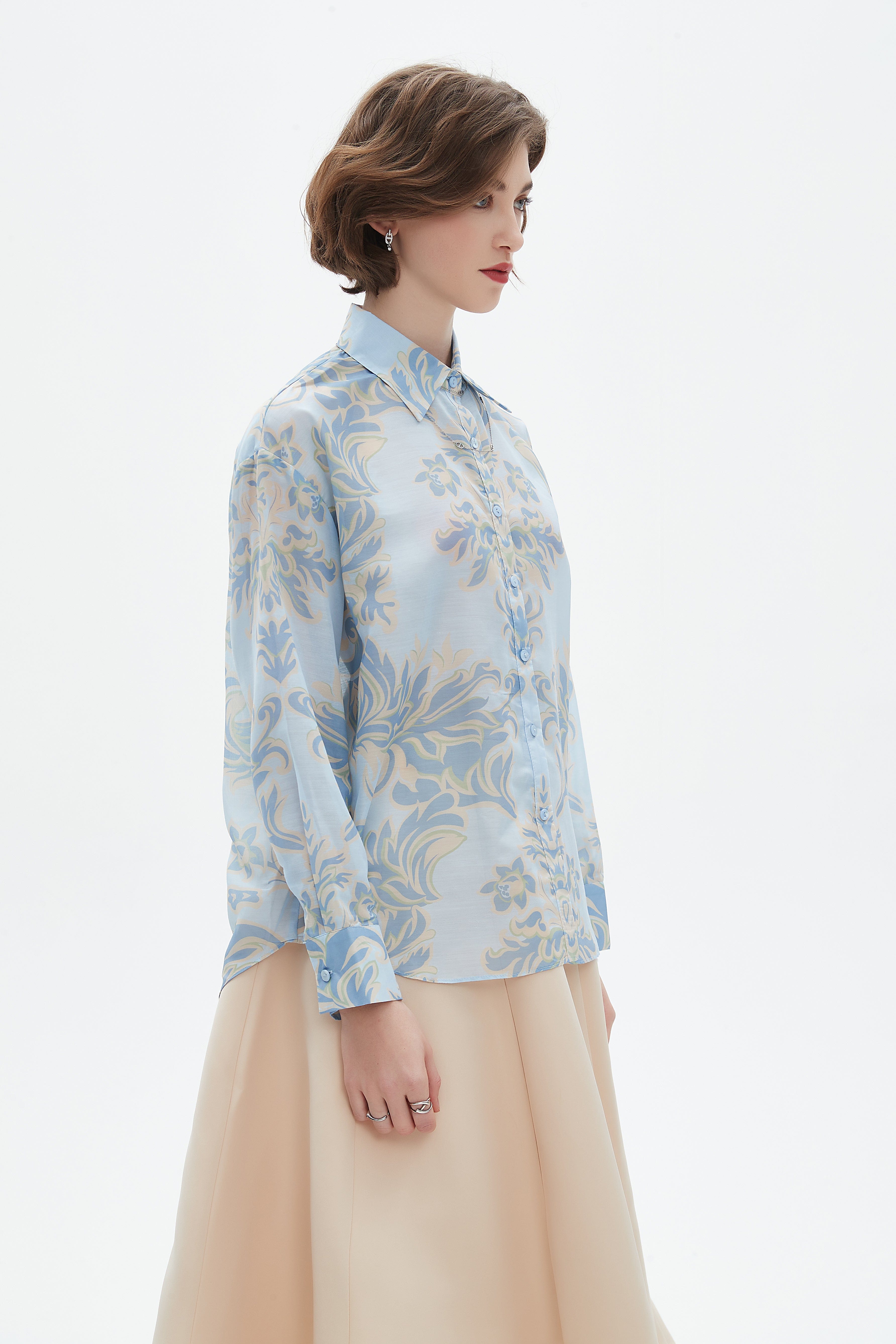 قميص نسائي بكم طويل مطرز بورود وياقة قميص