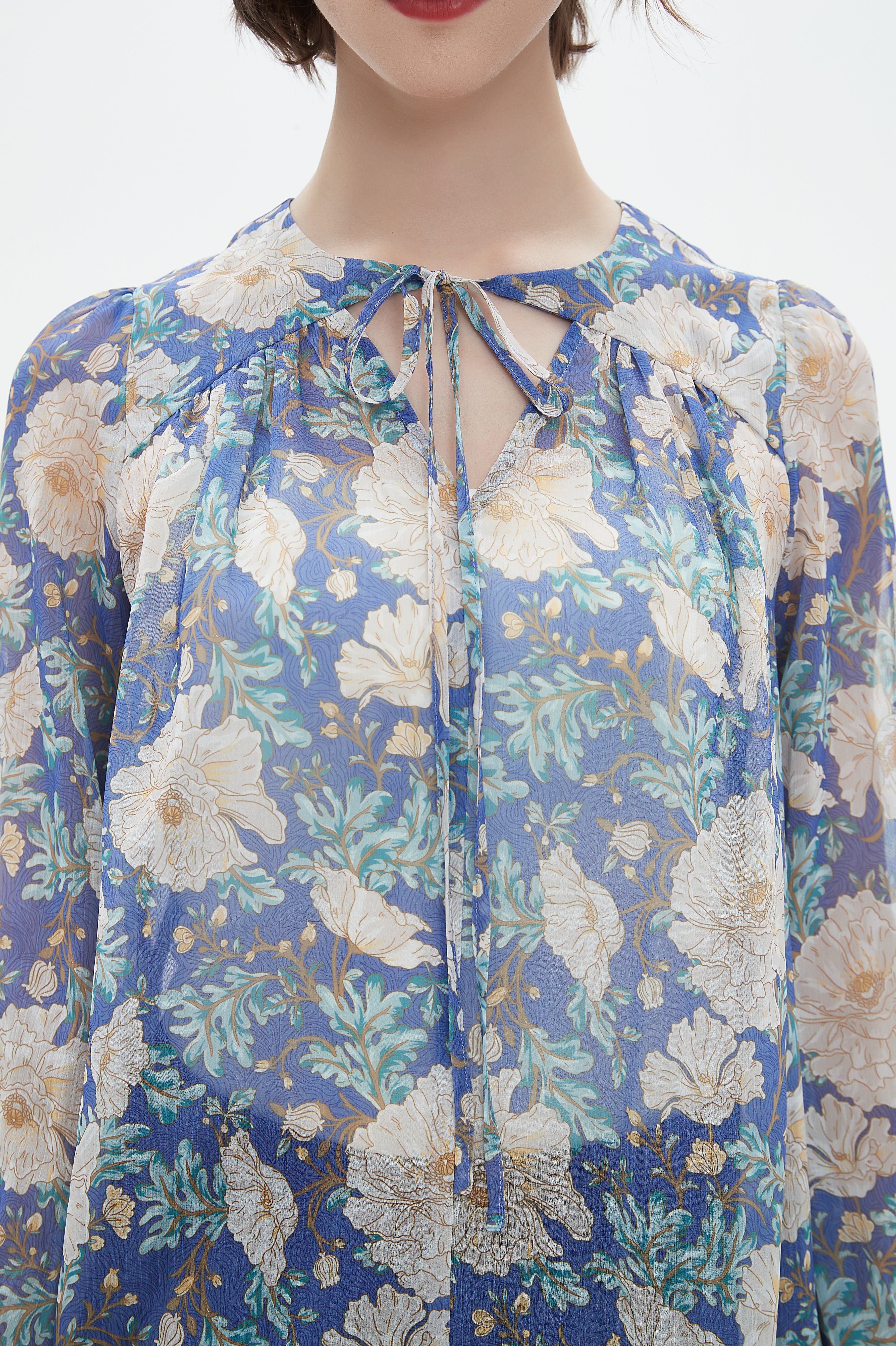 بلوزة نسائية كم طويل بلوزة بطول الخصر مشجرة بتفاصيل شيفون وفتحة رقبة دائرية