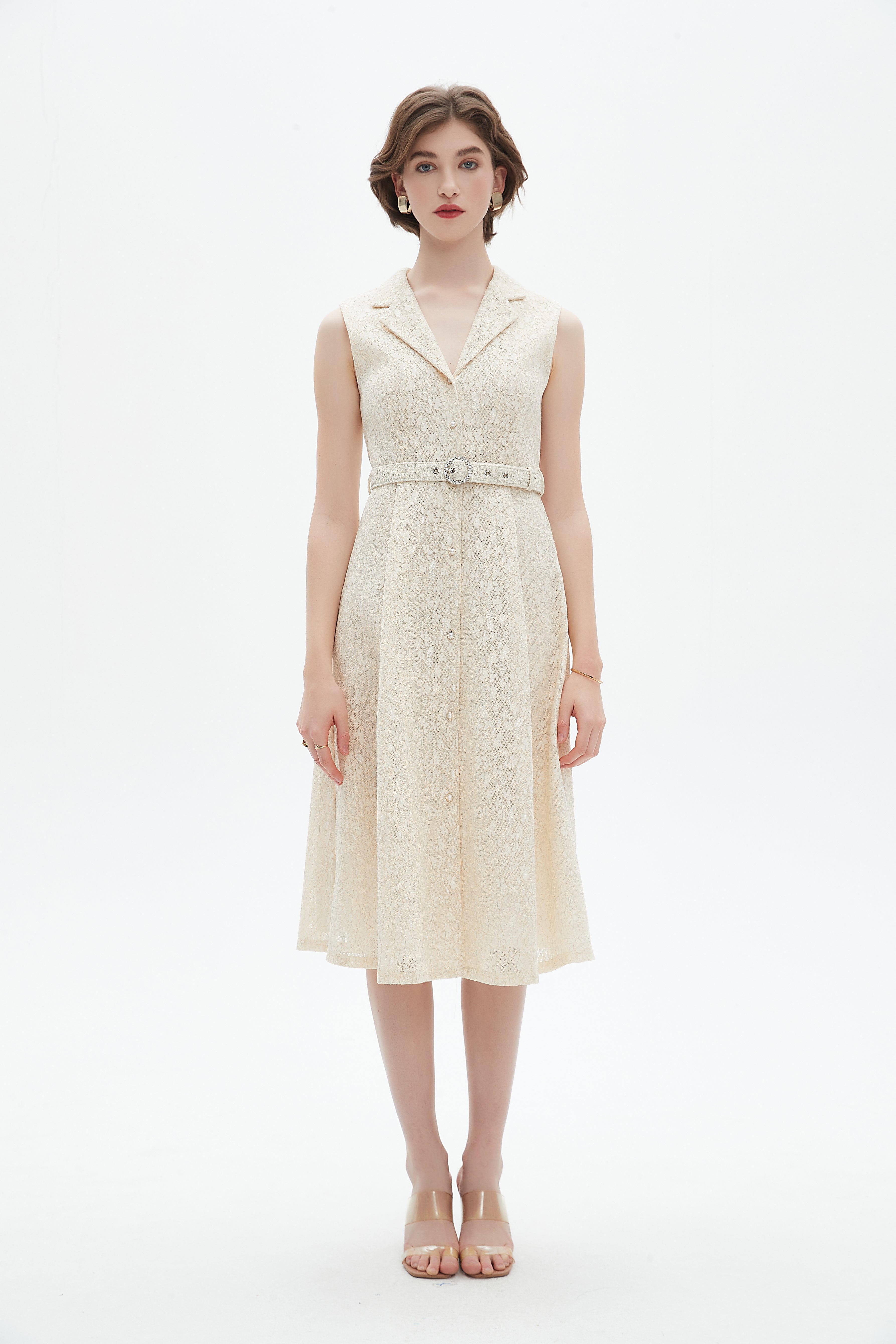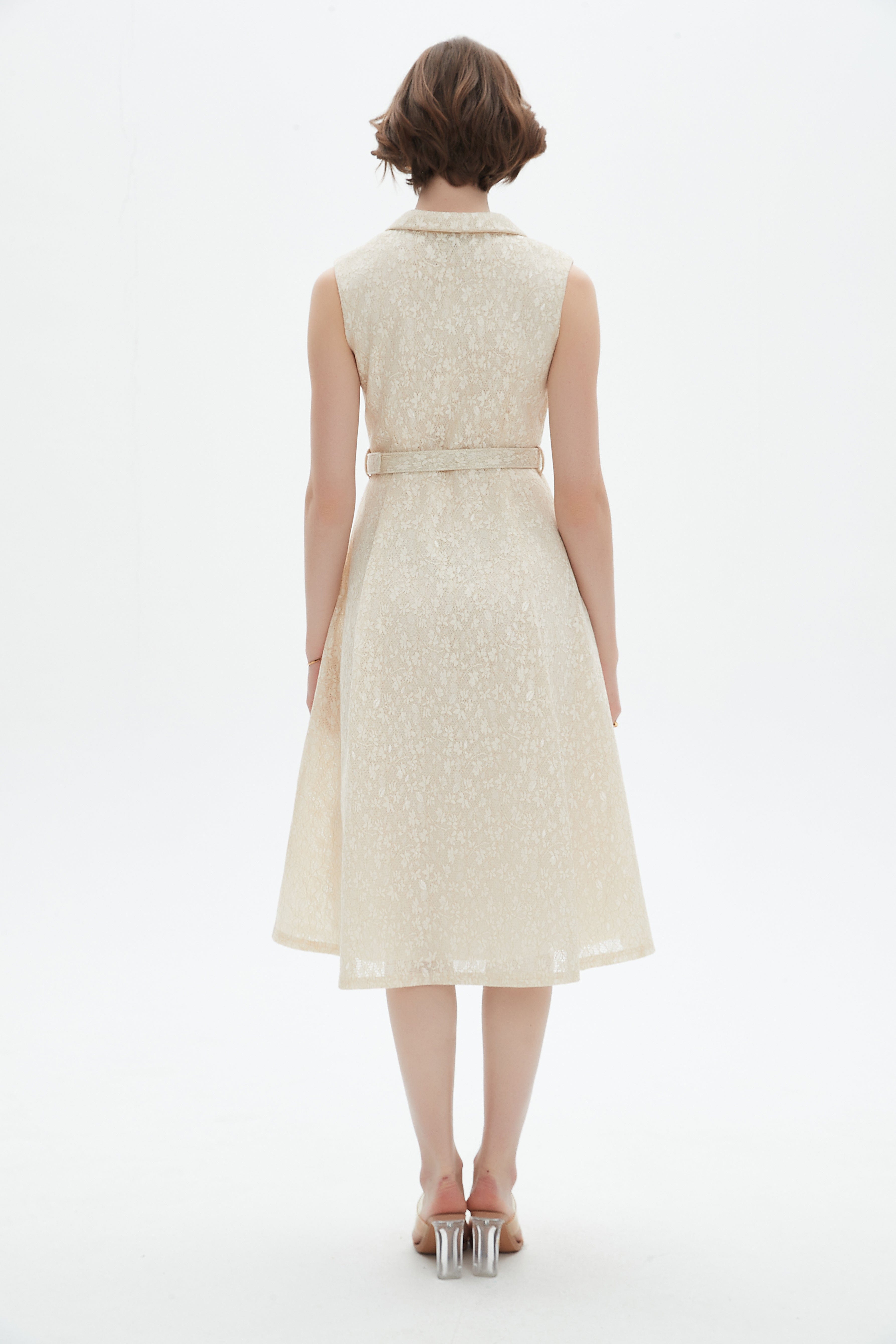 فستان ميدي بدون اكمام واسع من الاسفل بياقة قميص