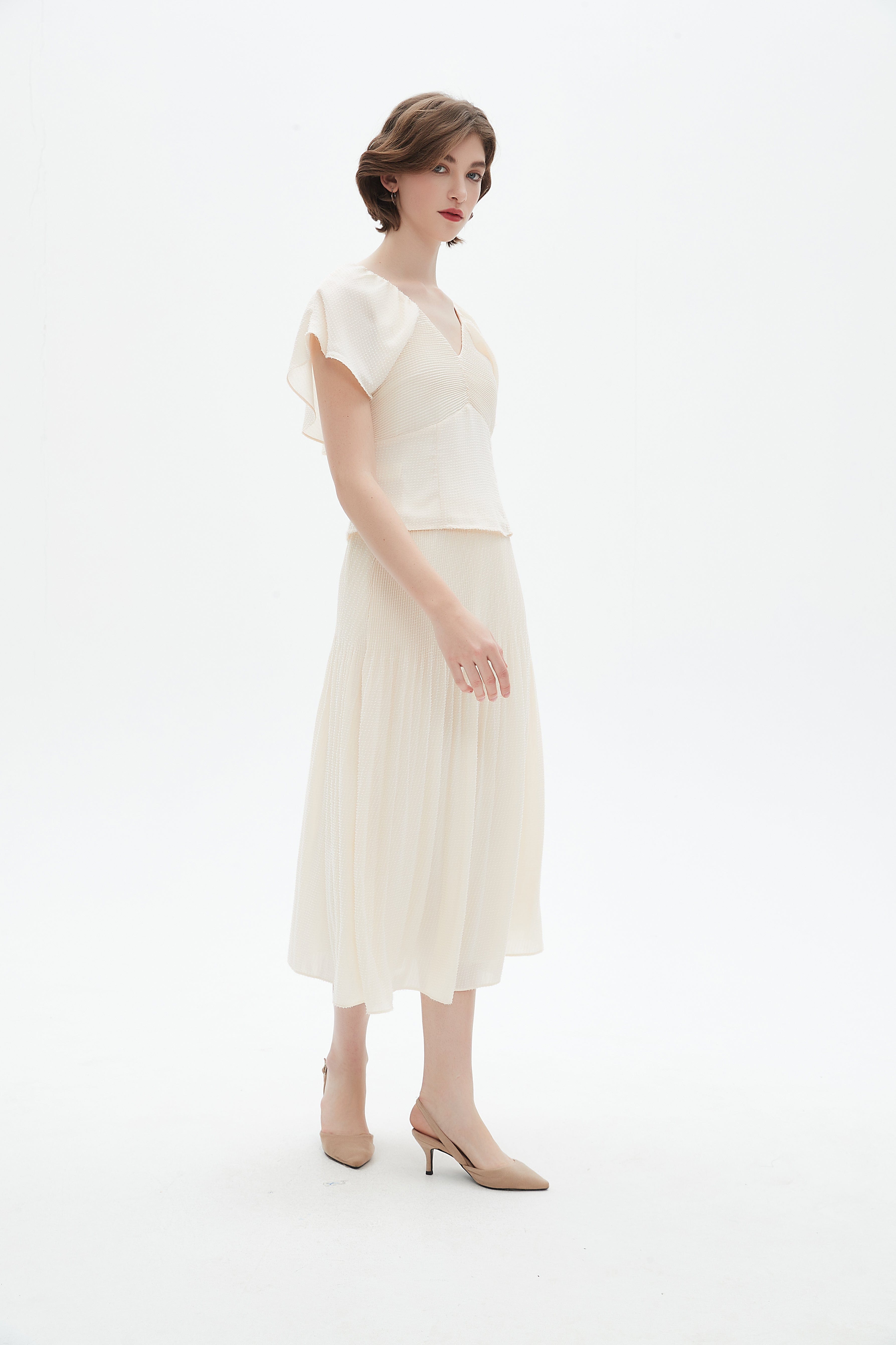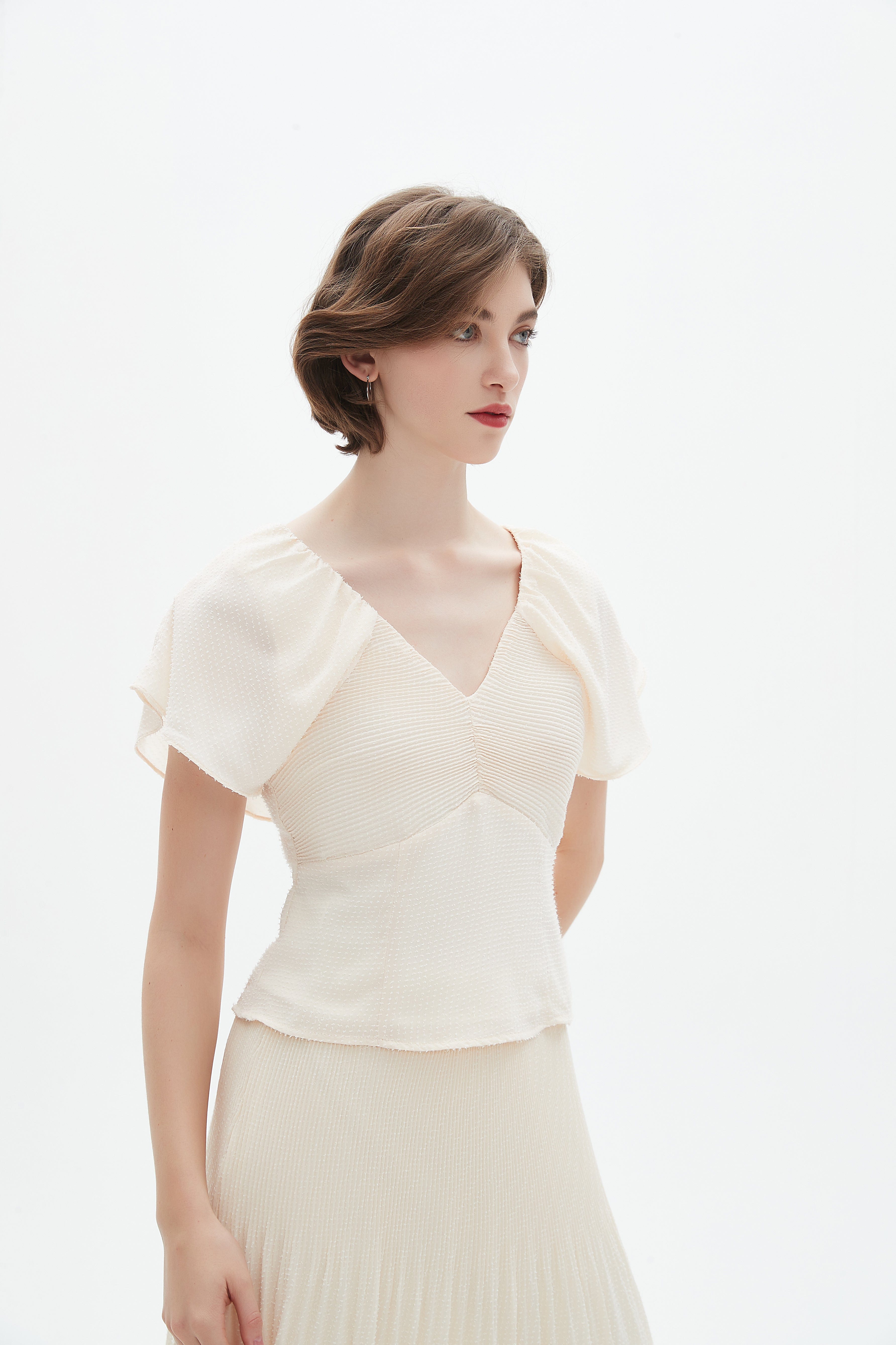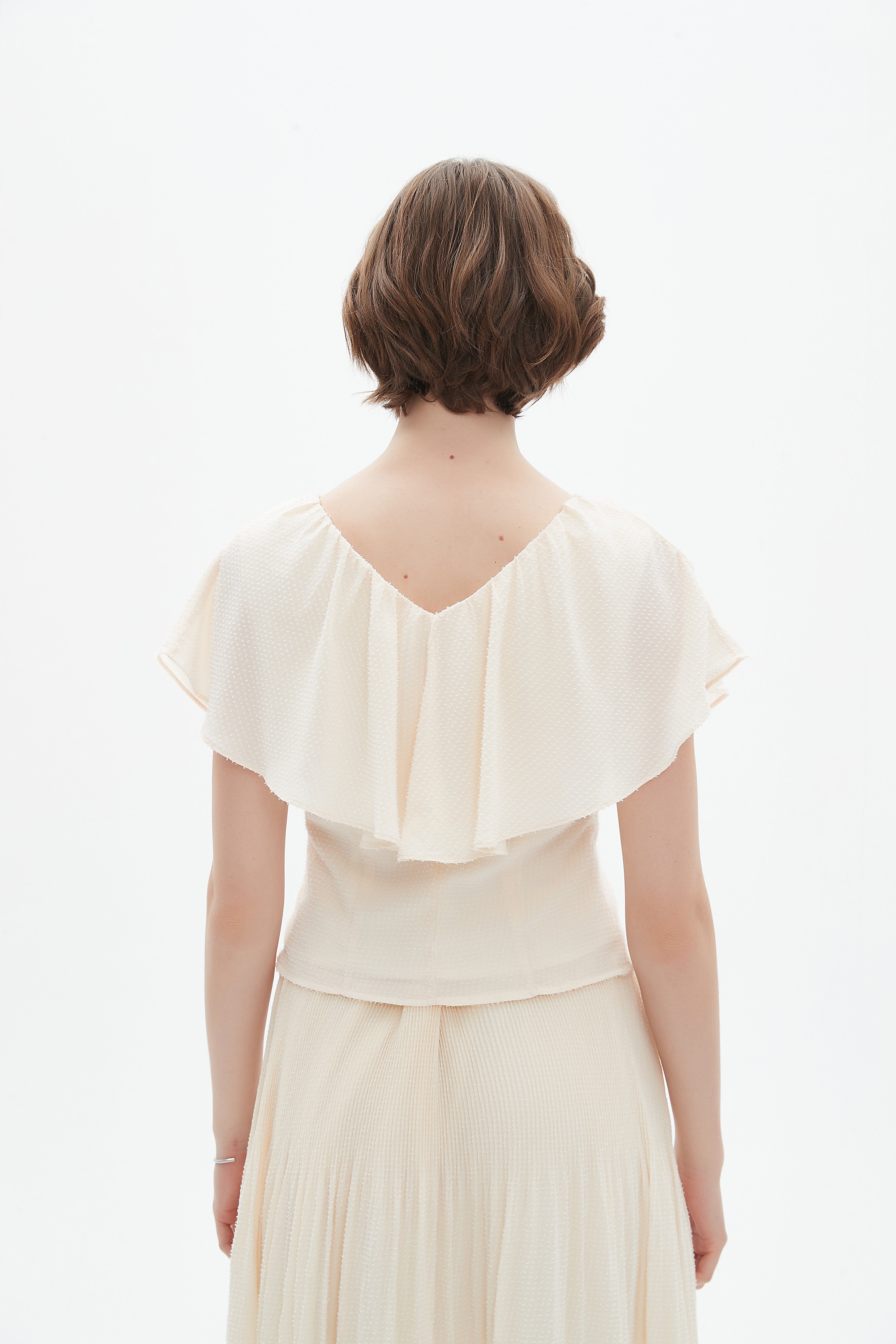 بلوزة نسائية كم قصير ومكشكشة من الخلف بياقة على شكل V