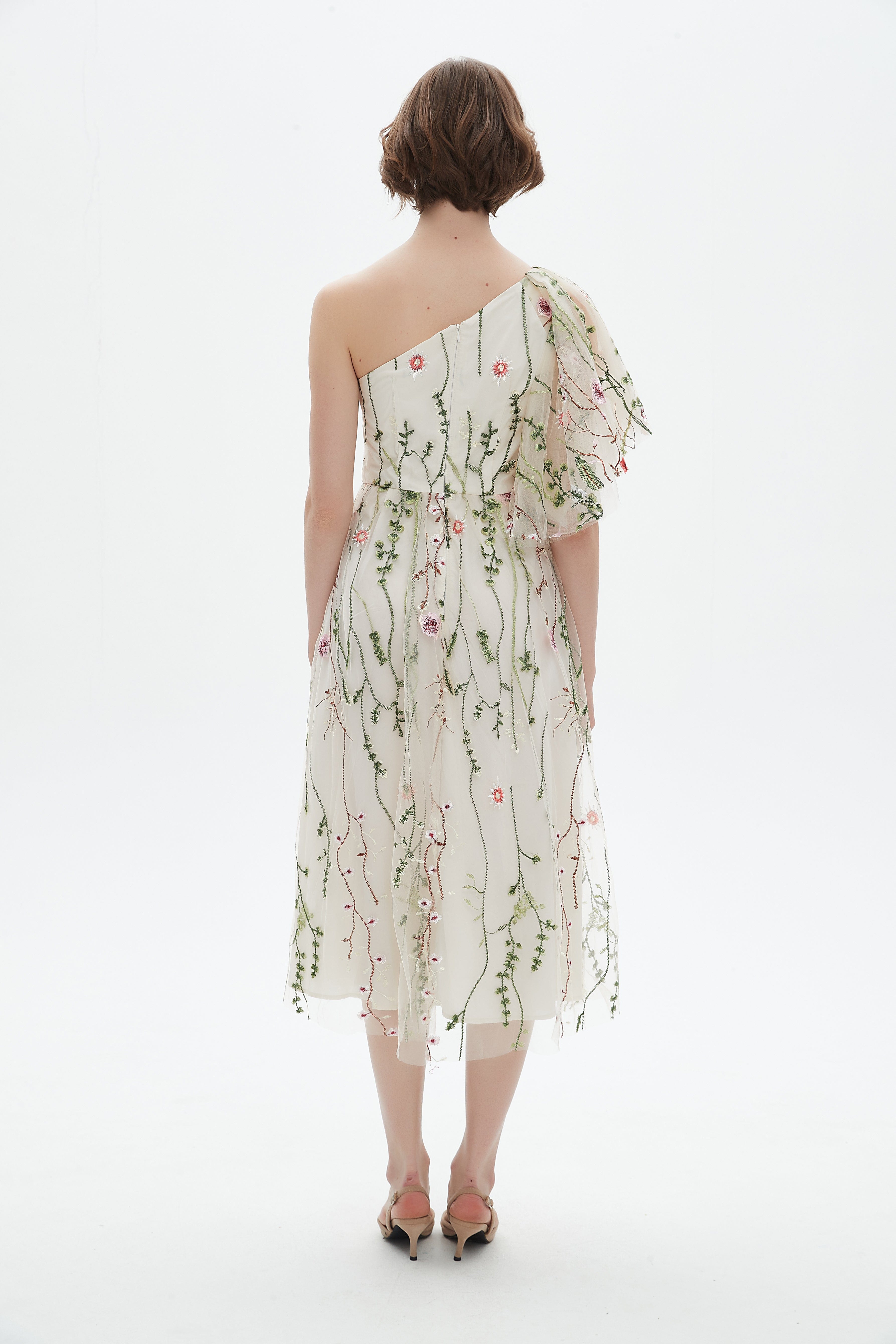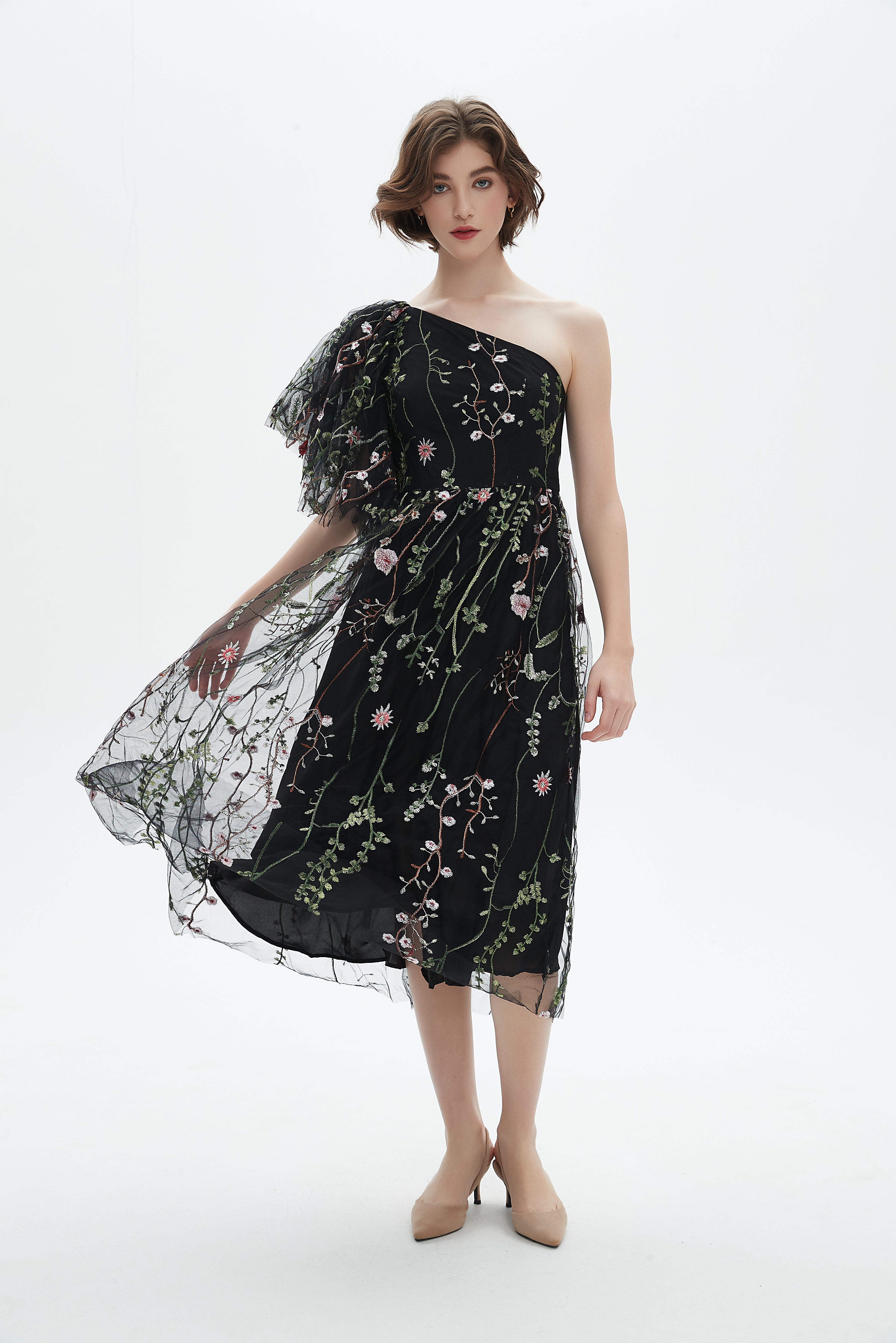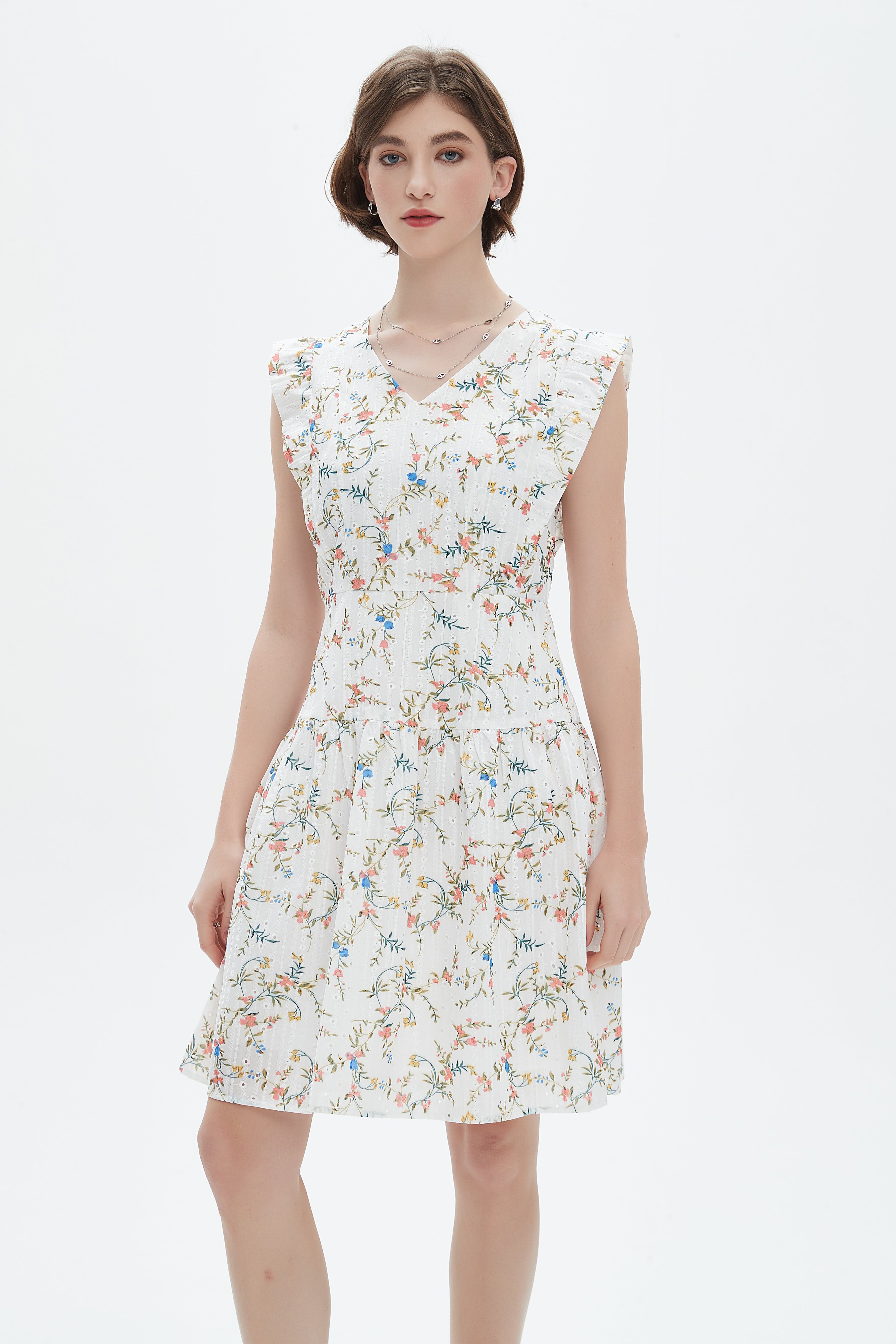 فستان ميدي مطرز بدون اكمام بياقة دائرية