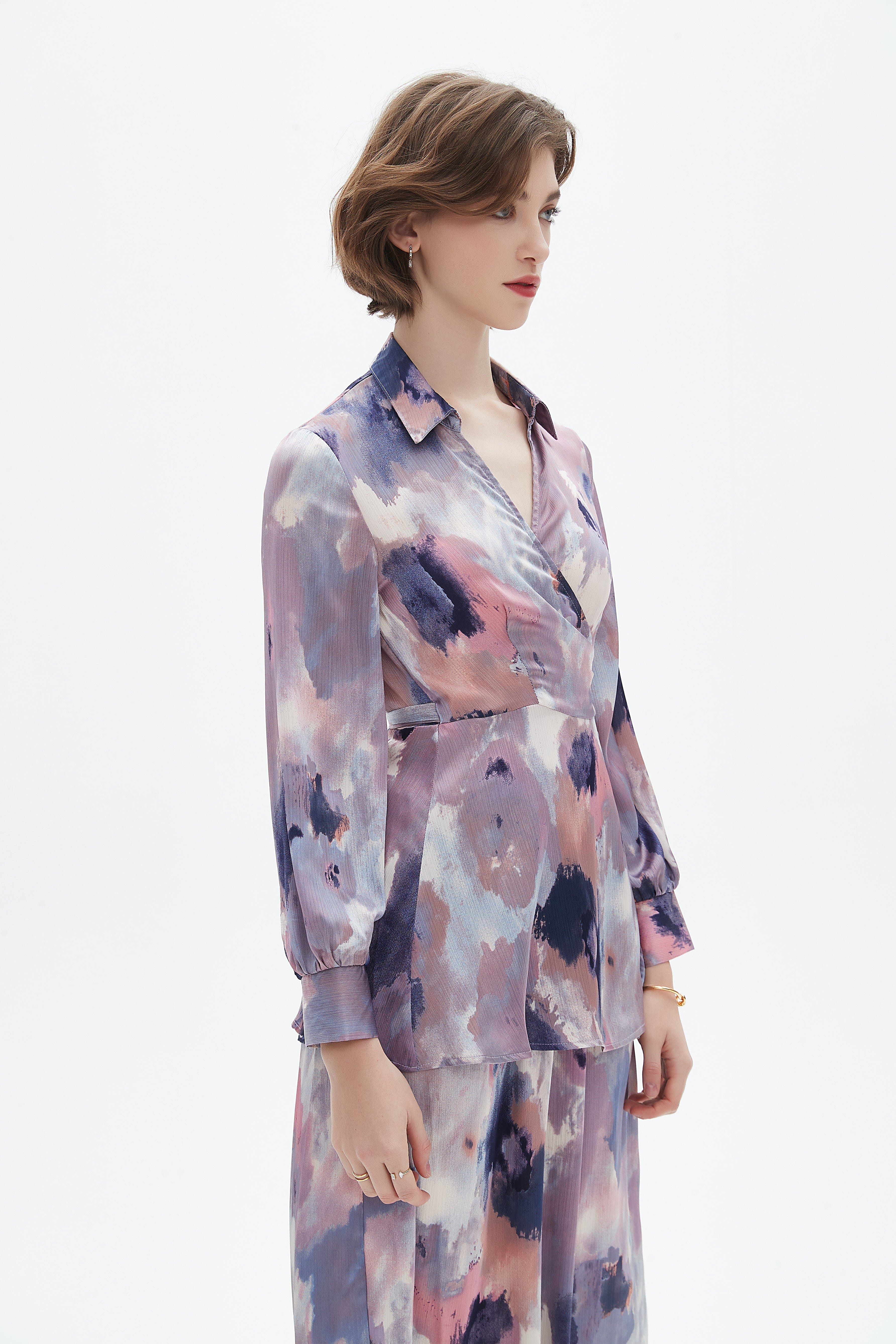 بلوزة نسائية كم طويل مشجرة وبشراشيب فتحة رقبة على شكل V
