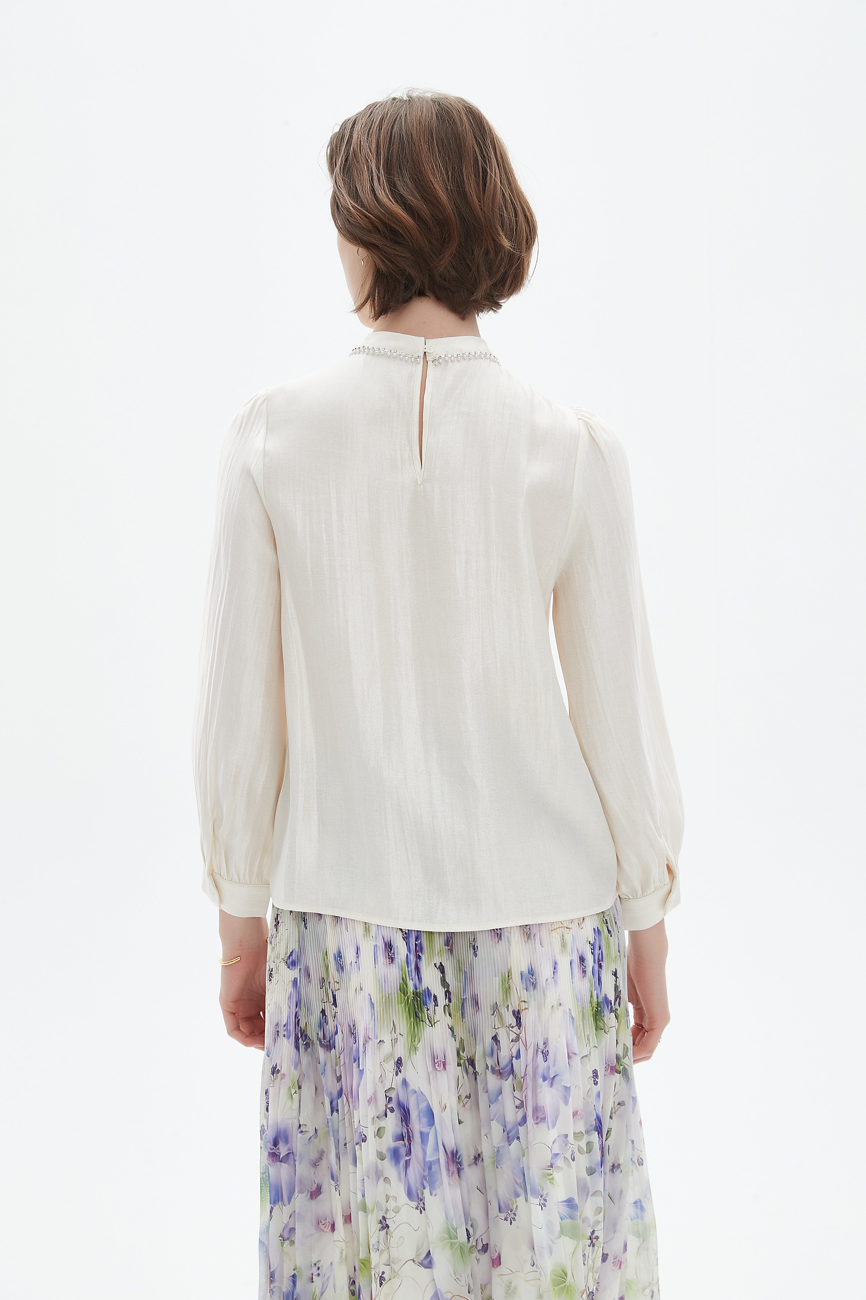 بلوزة بأكمام طويلة ورقبة مدورة بطوق ورود حول الياقة