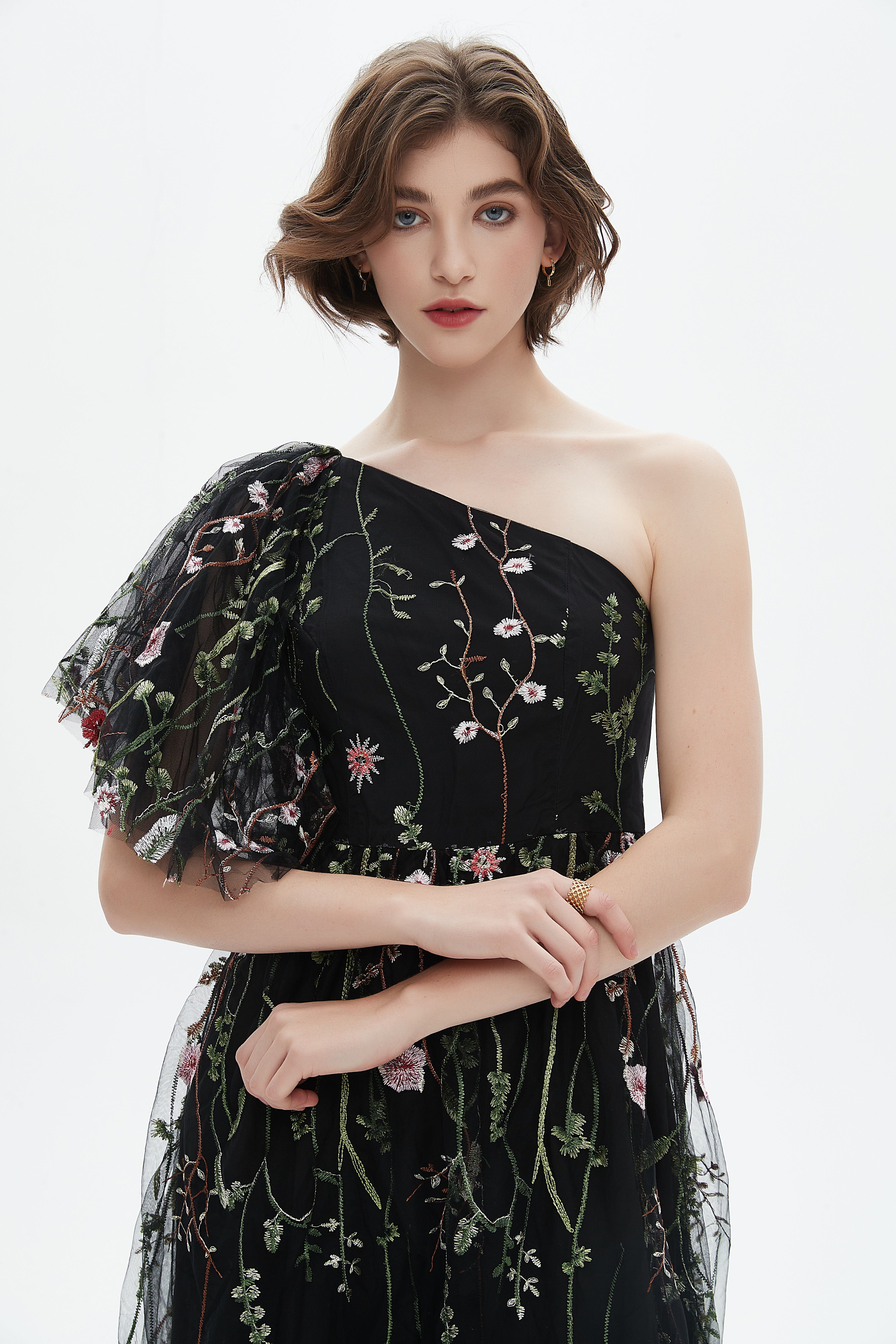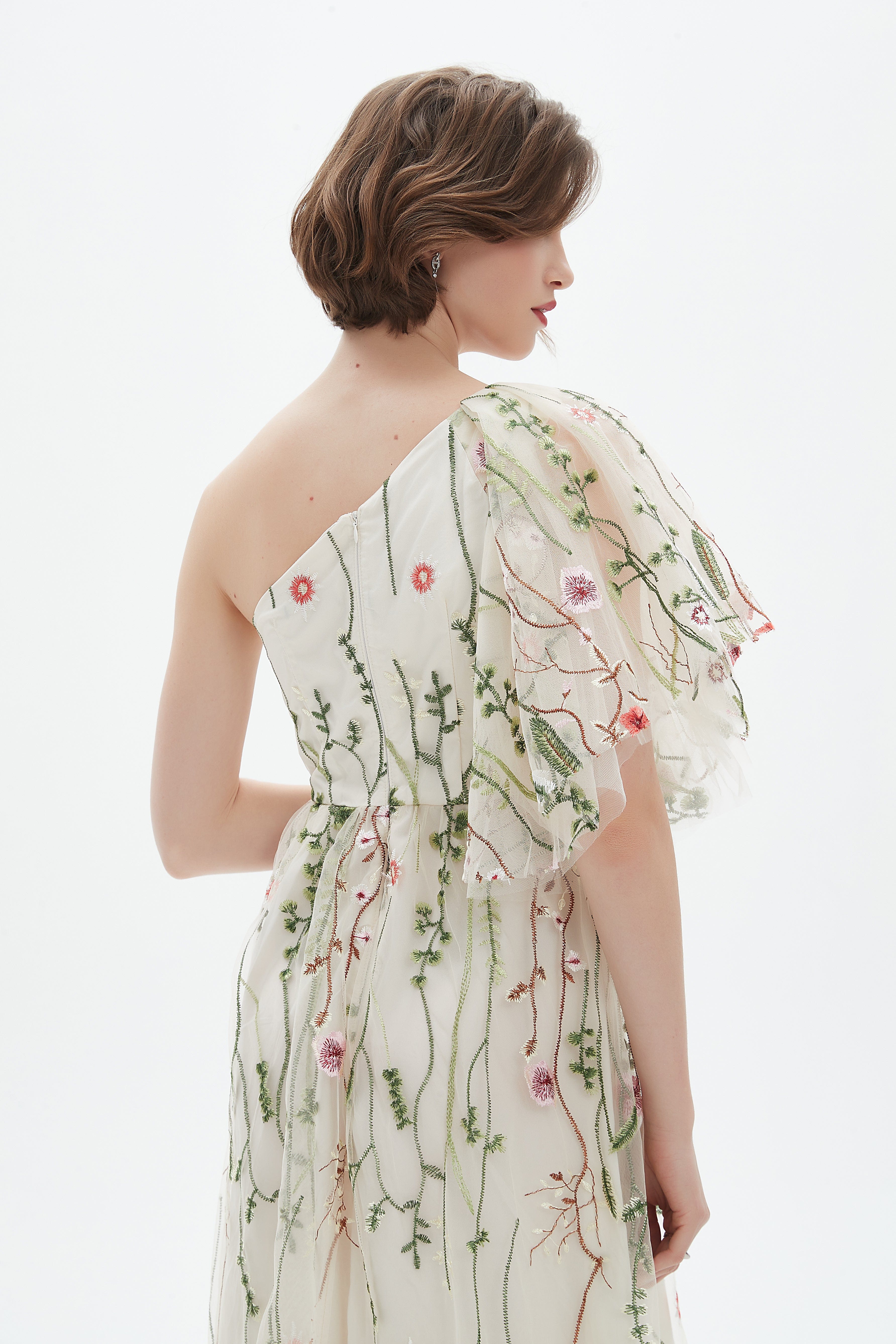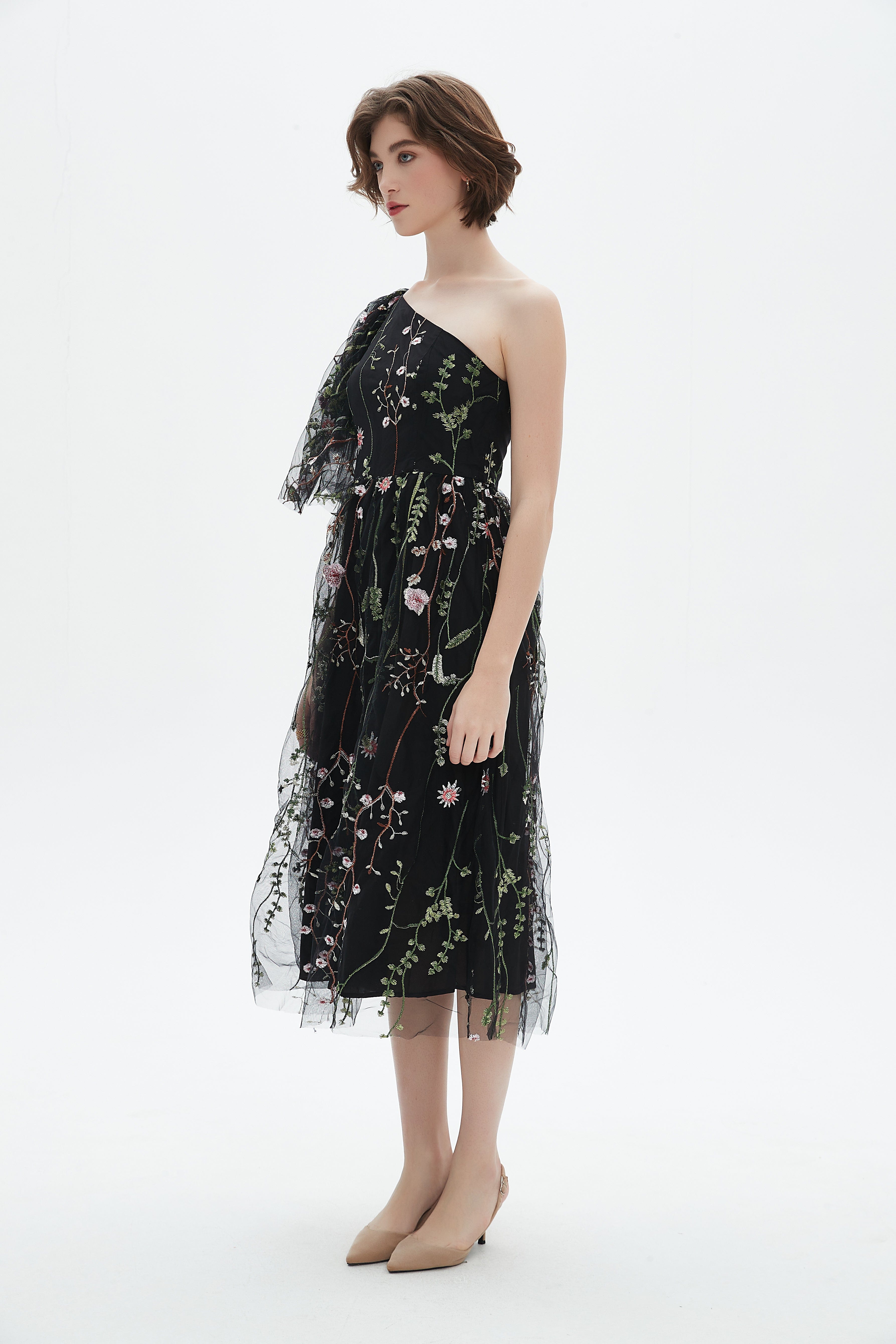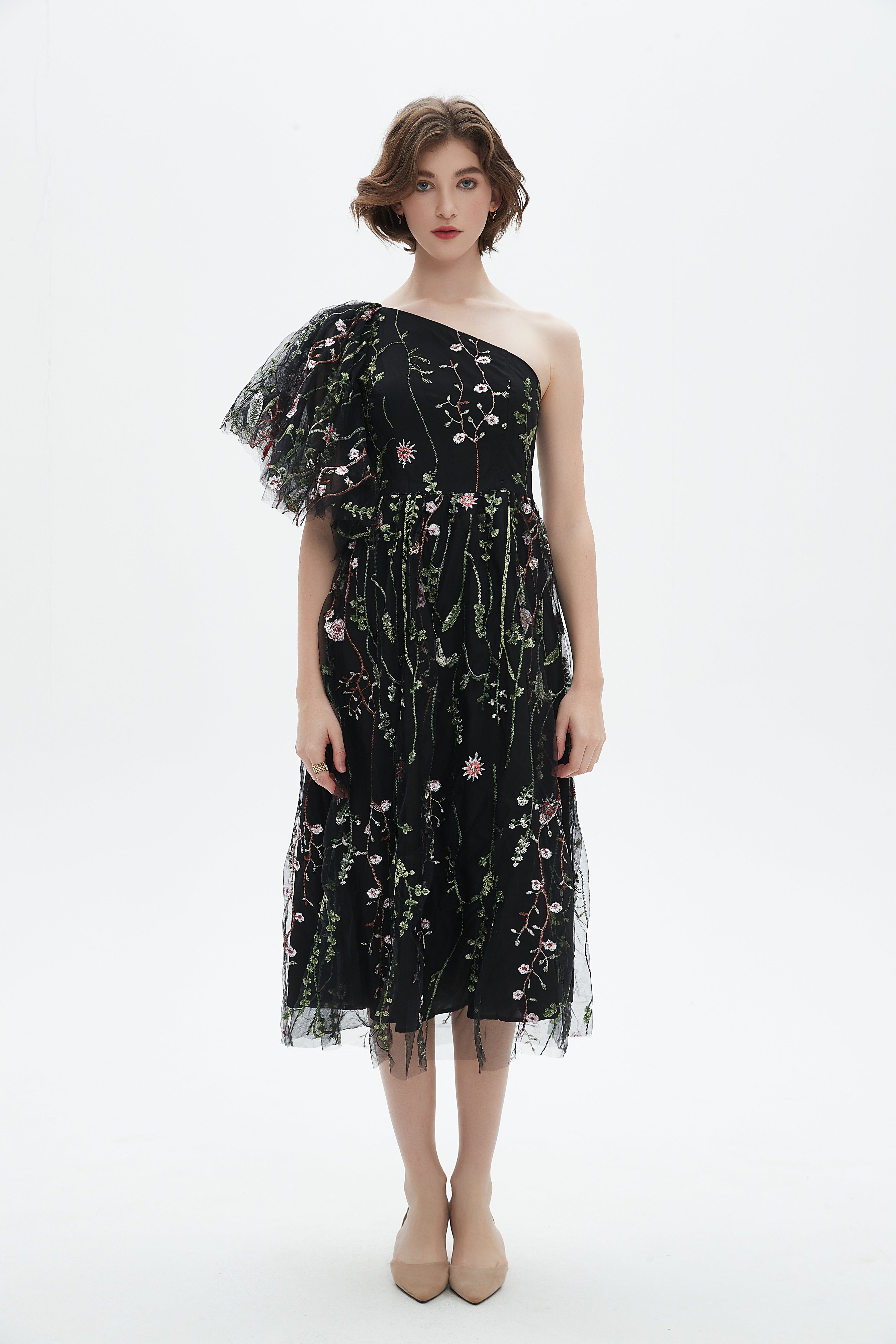 فستان ميدي مطرز حمالات بحزام عالخصر ومكشكش