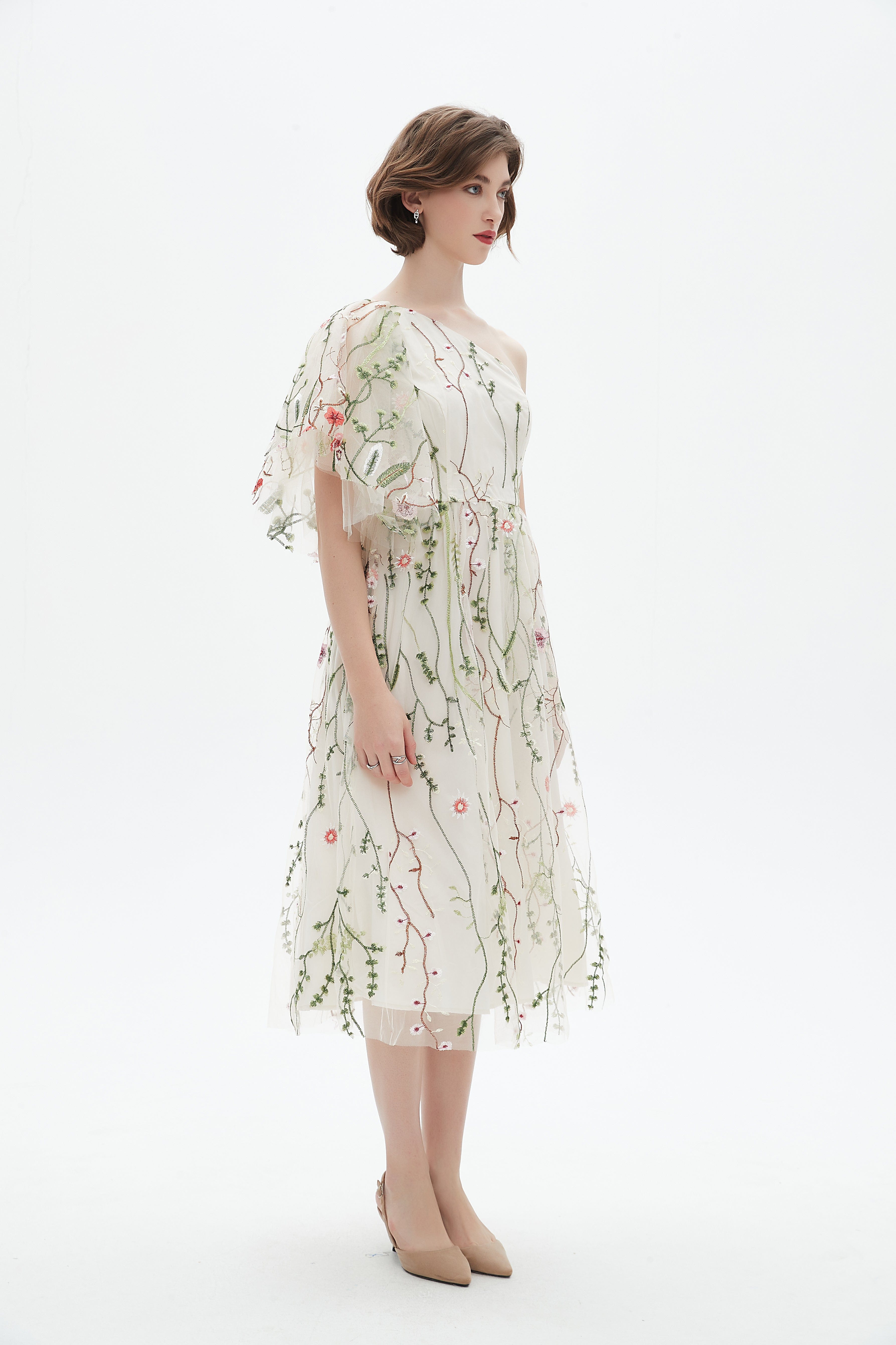 فستان ميدي نصف كم مطرز بأكمام واسعة وفتحة رقبة مربعة