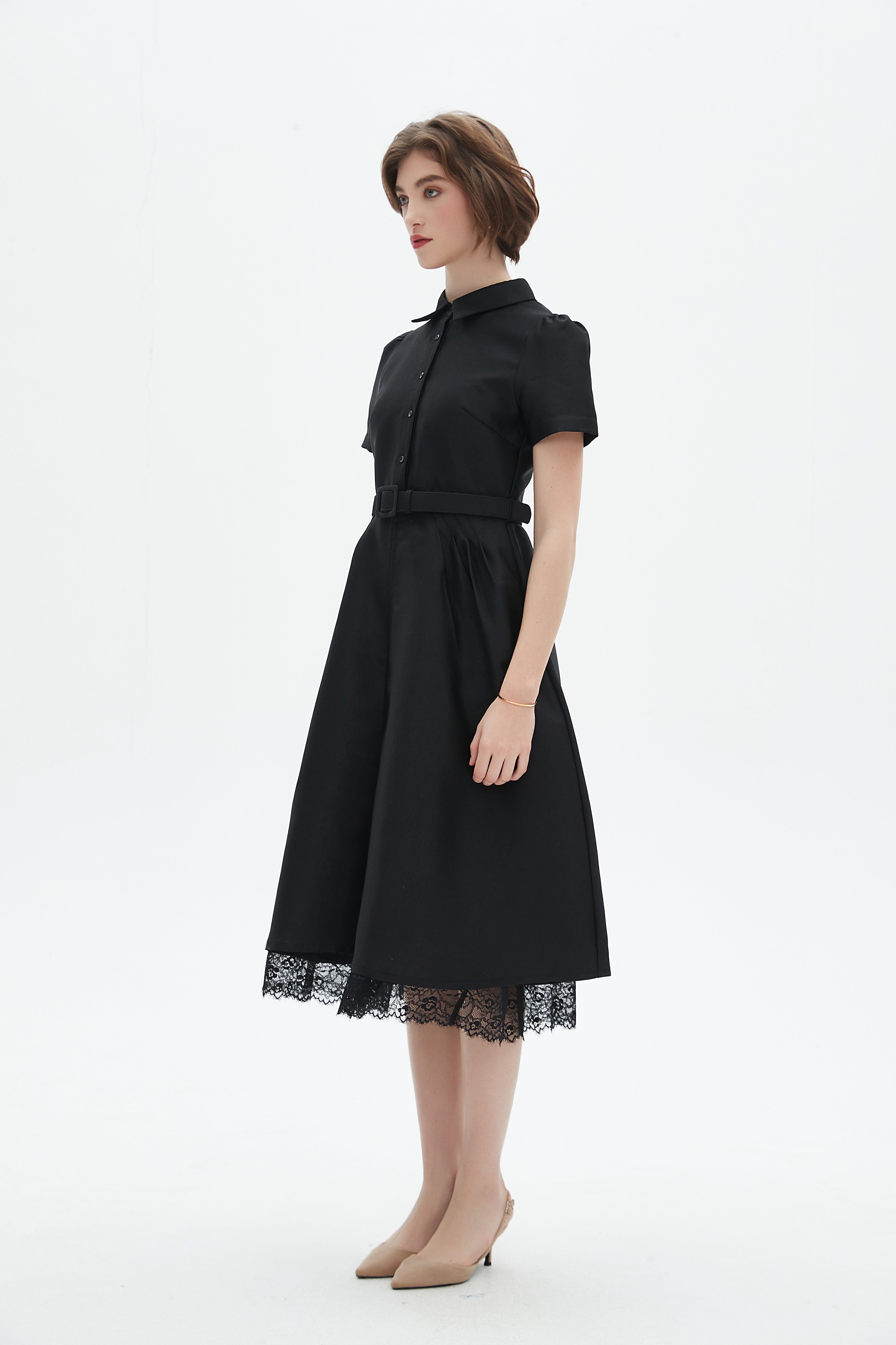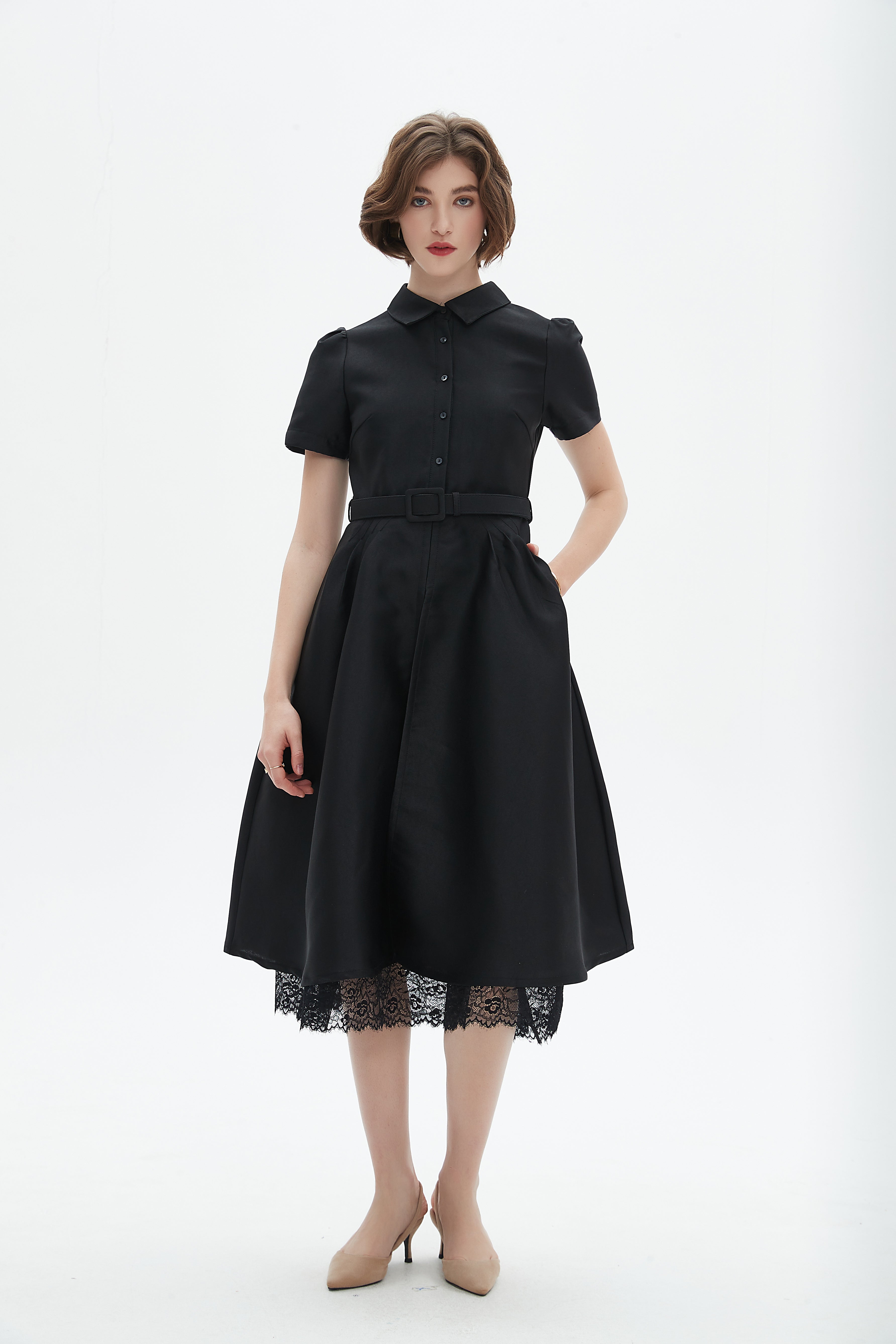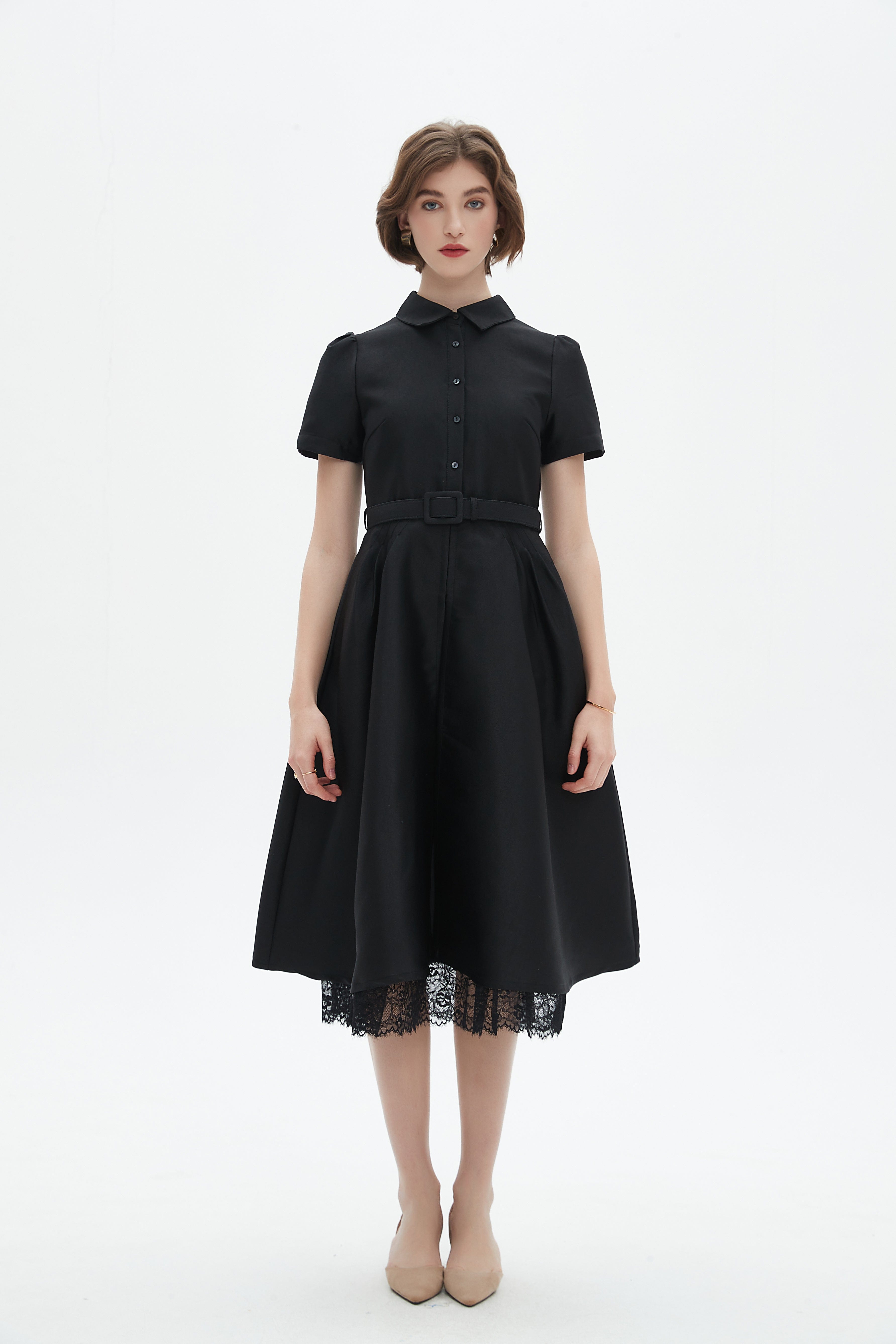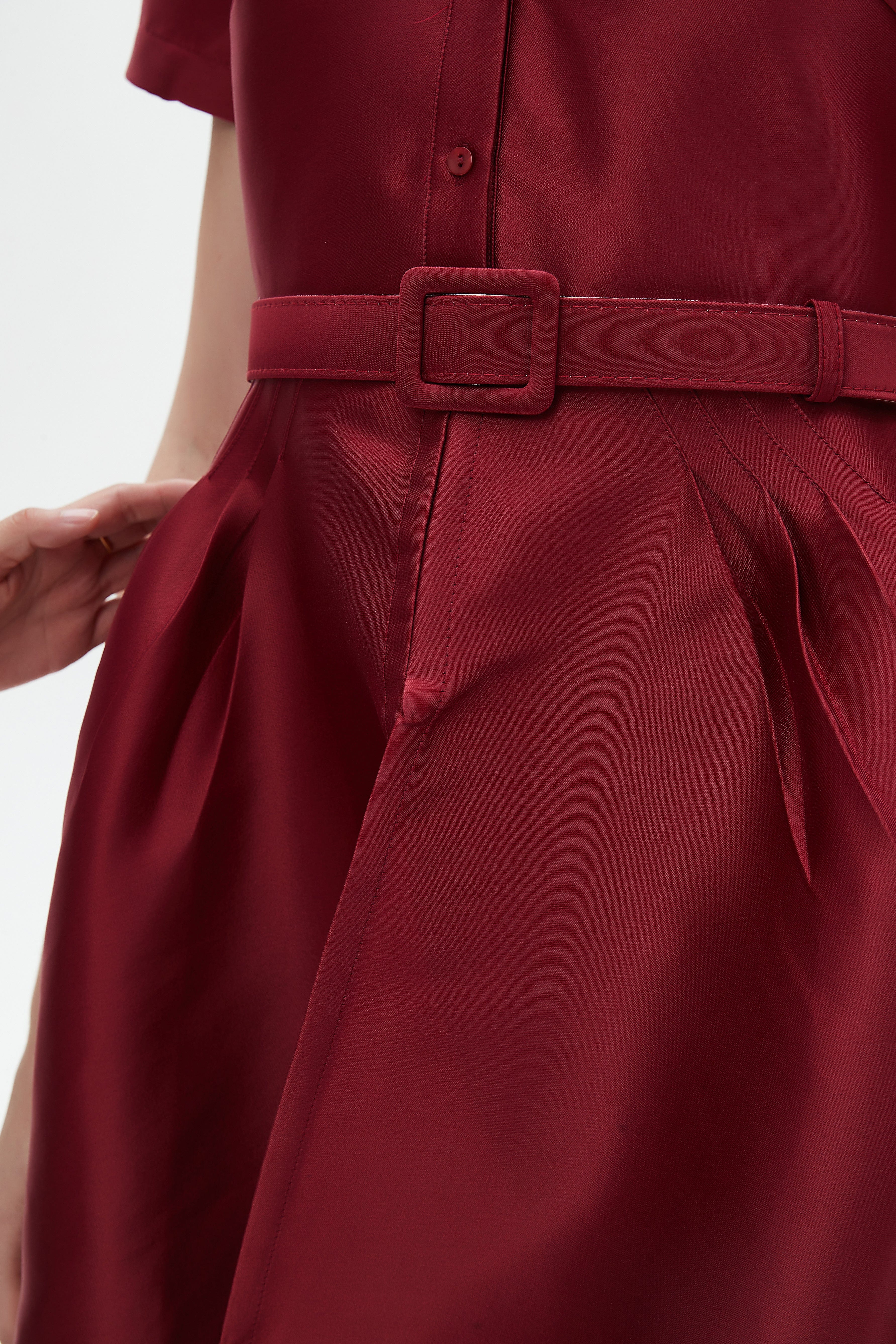 فستان ميدي بأكمام قصيرة وحزام عالخصر بياقة قميص
