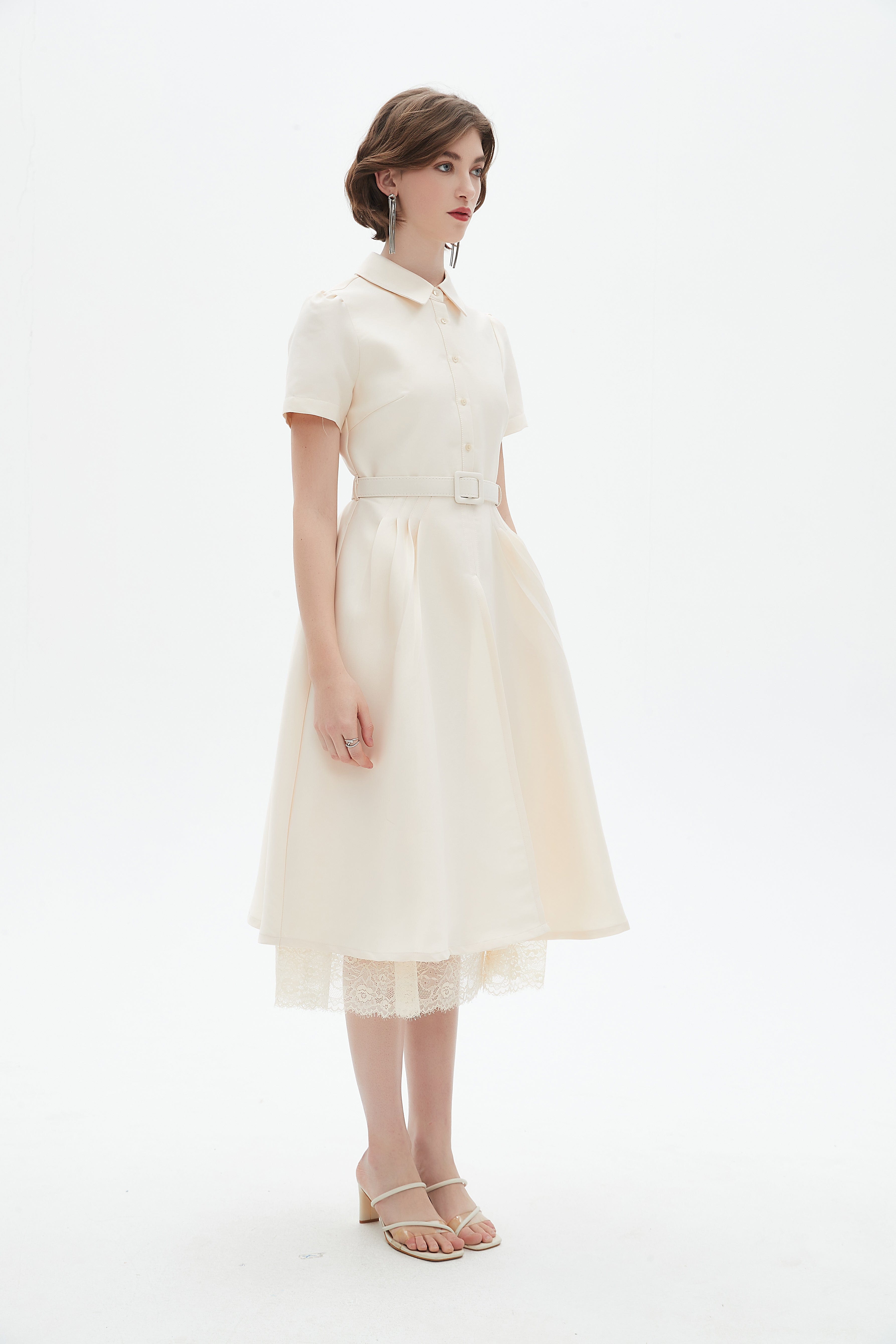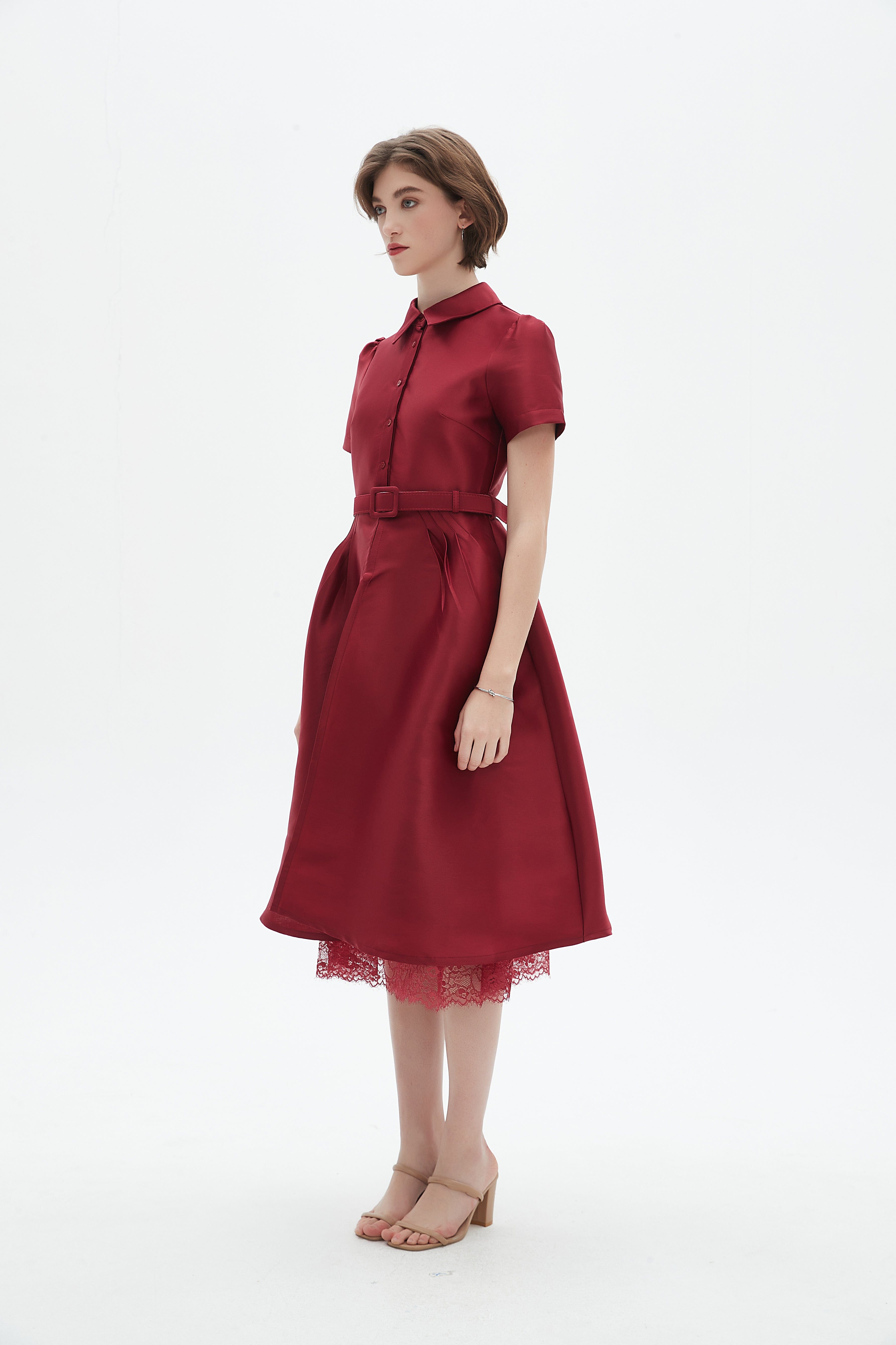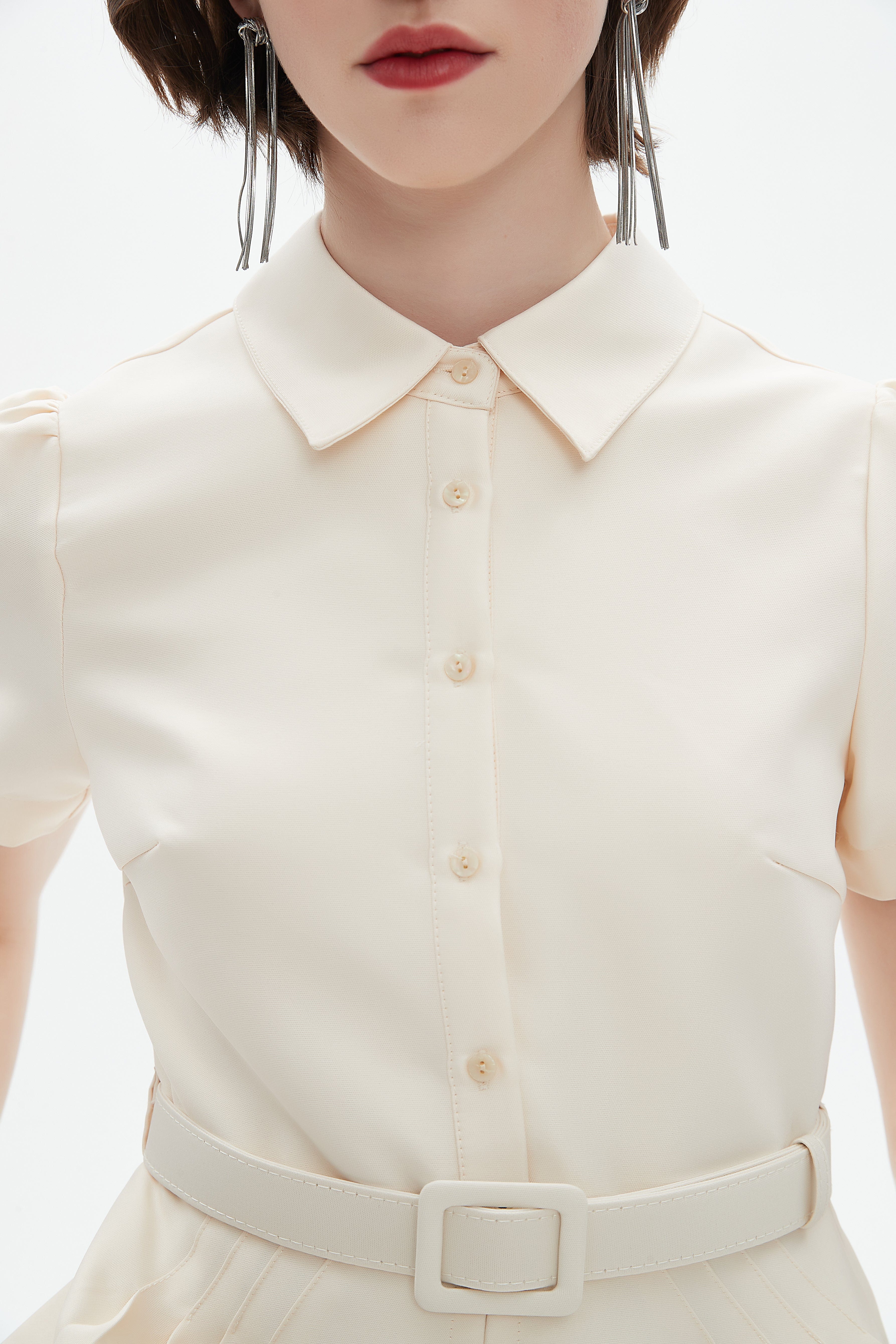 فستان طويل بأكمام قصيرة وحزام عالخصر بياقة قميص مكشكش