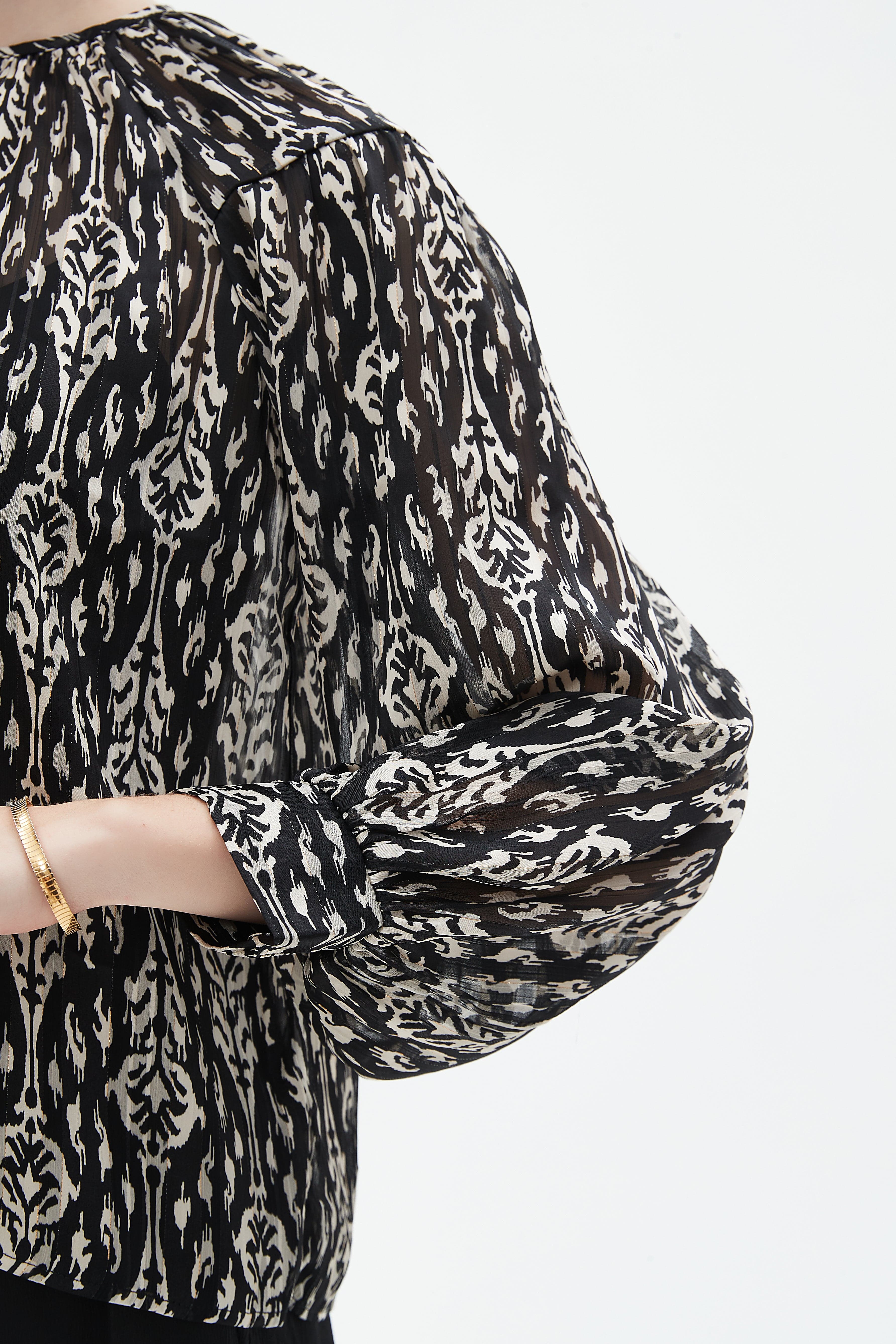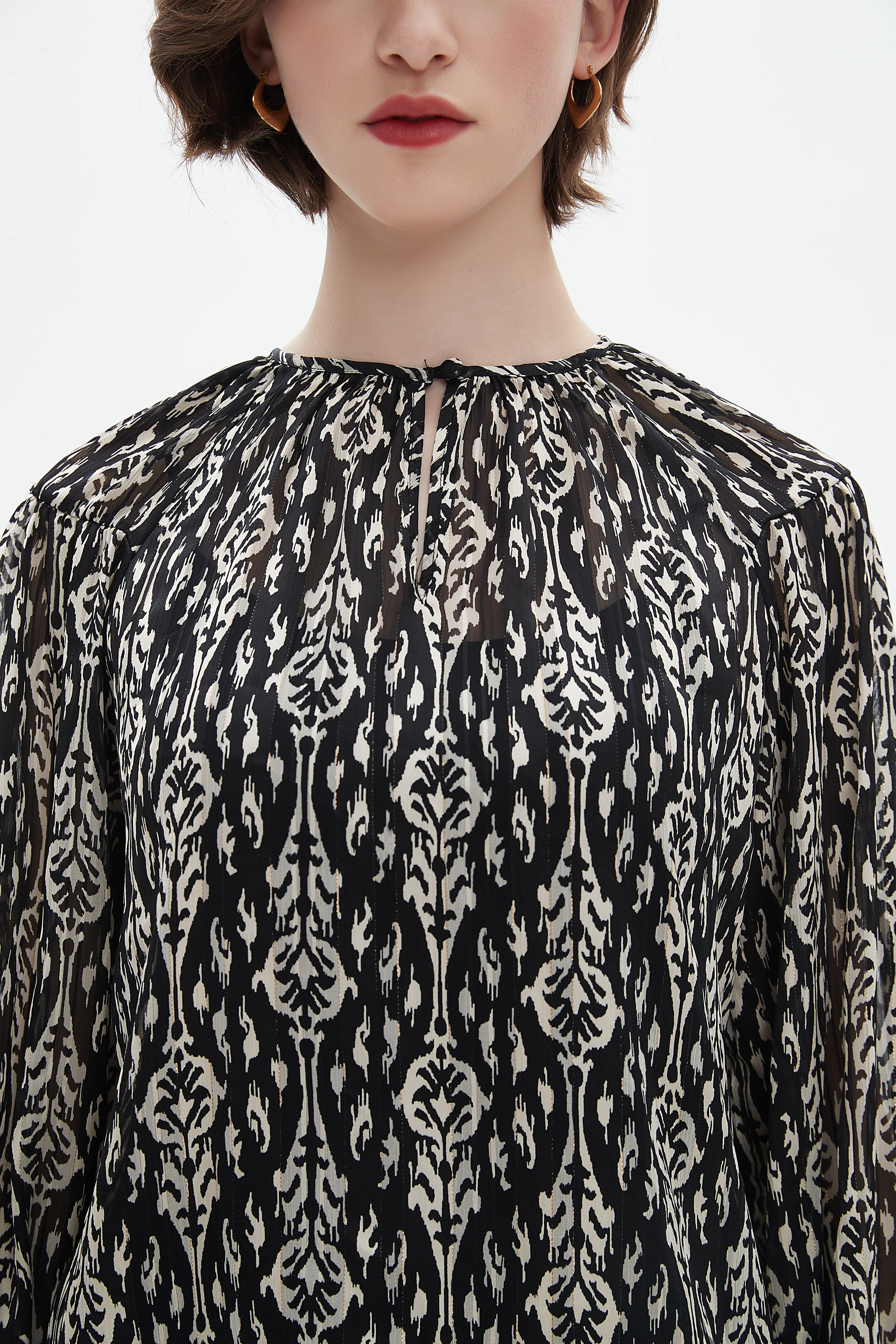 بلوزة نسائية كم طويل منقوشة برقبة دائرية وفتحة من الامام