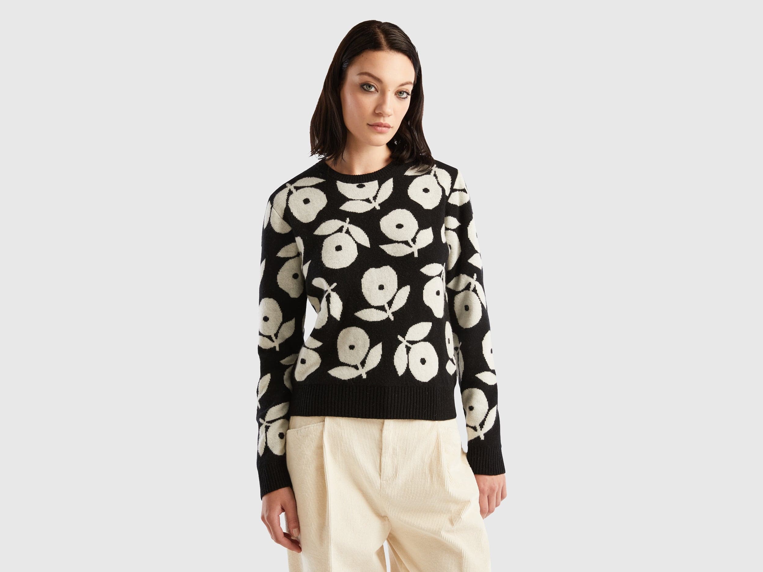 بلوفر صوف بنقشة زهور كم طويل نسائي