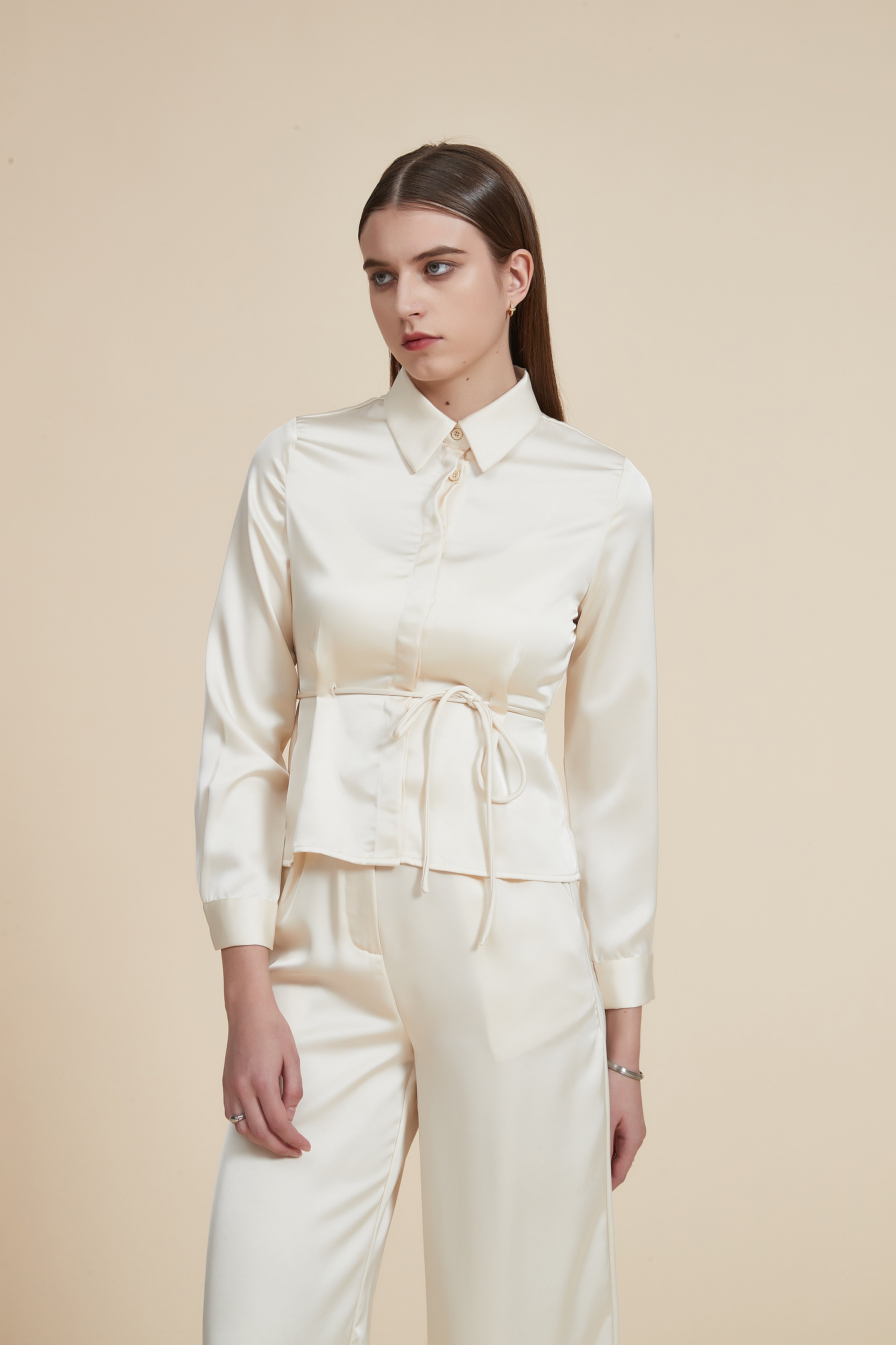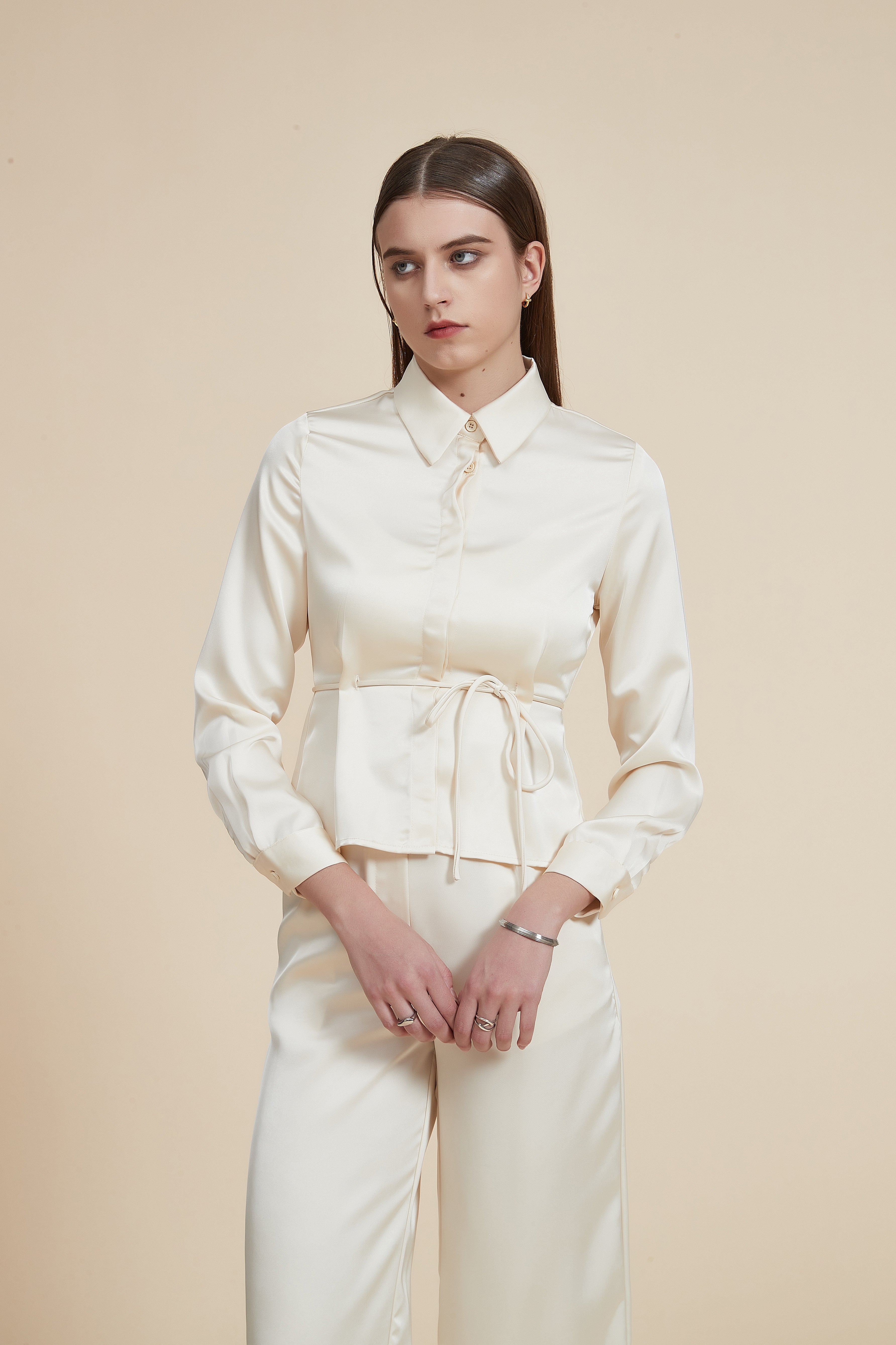 بلوزة بطول الخصر بكم طويل وياقة قميص سادة