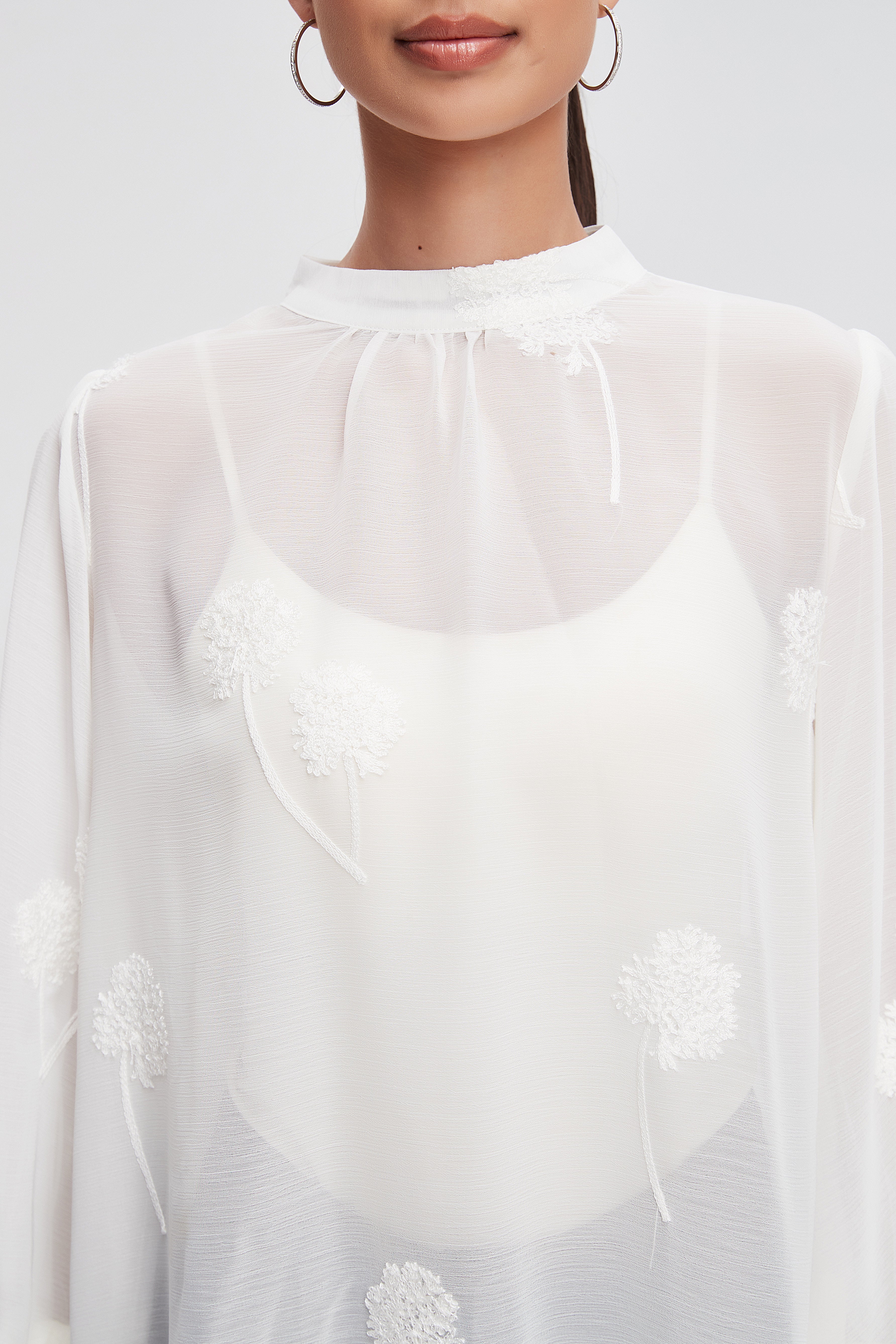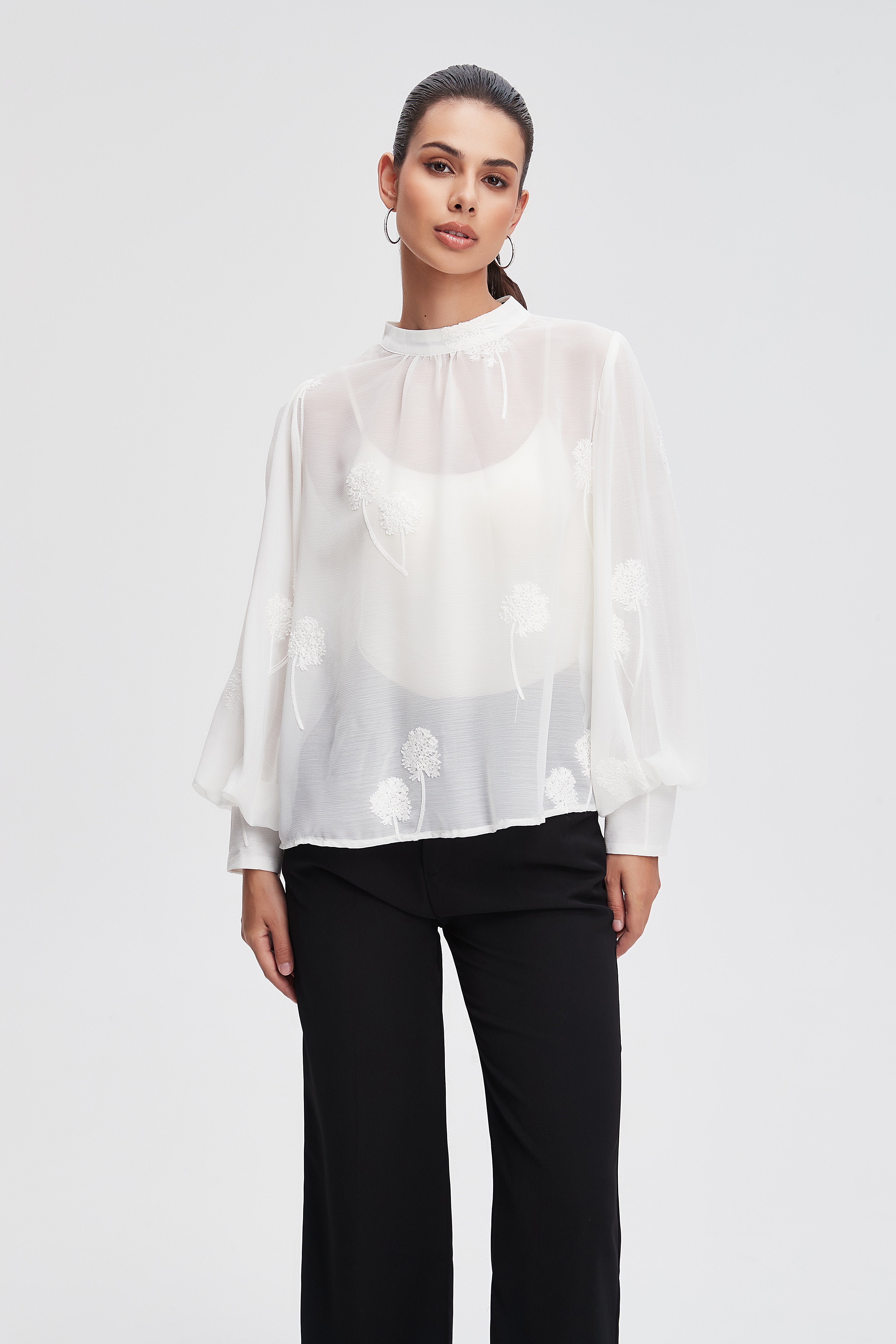 بلوزة بأكمام طويلة واسعة ورقبة مدورة