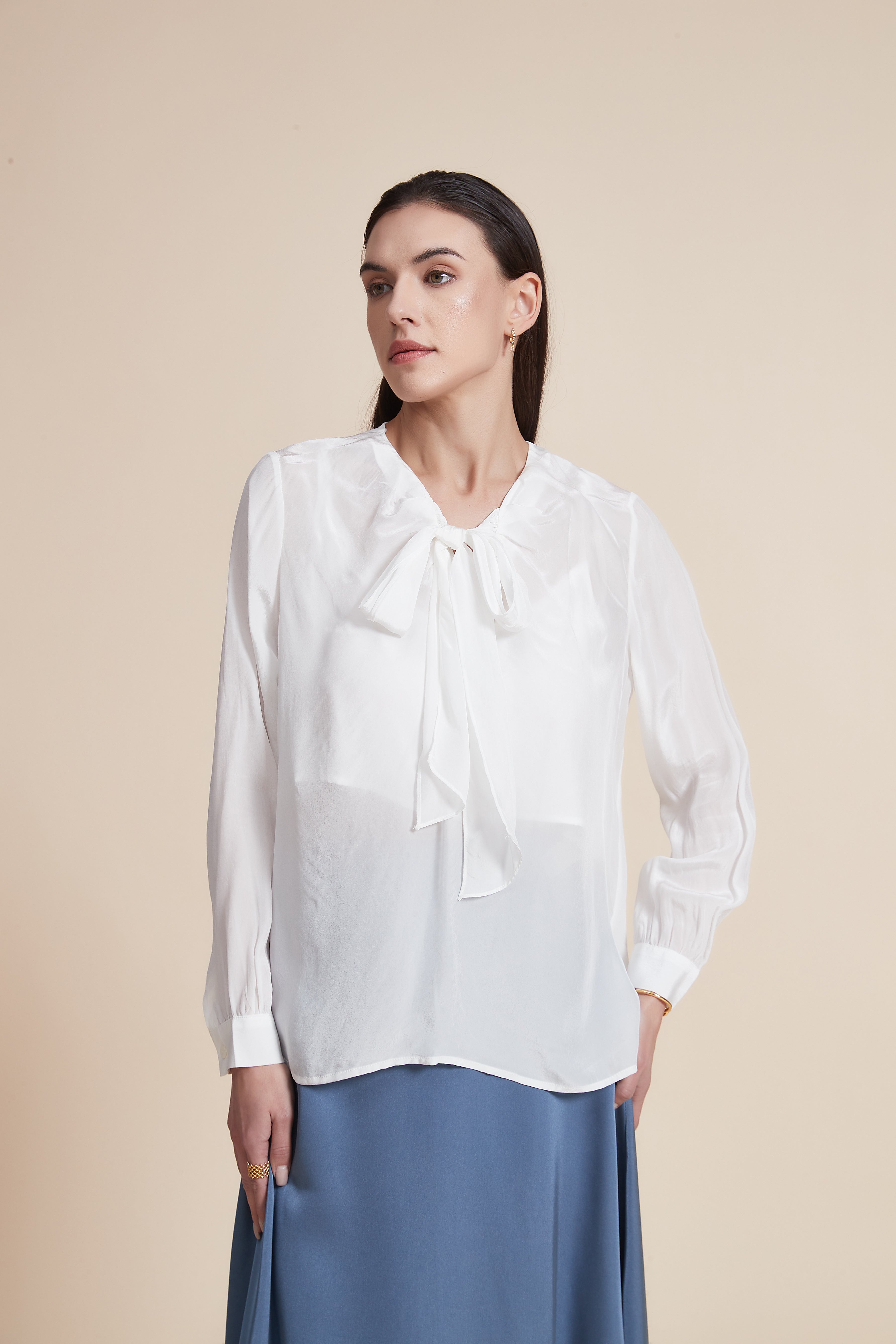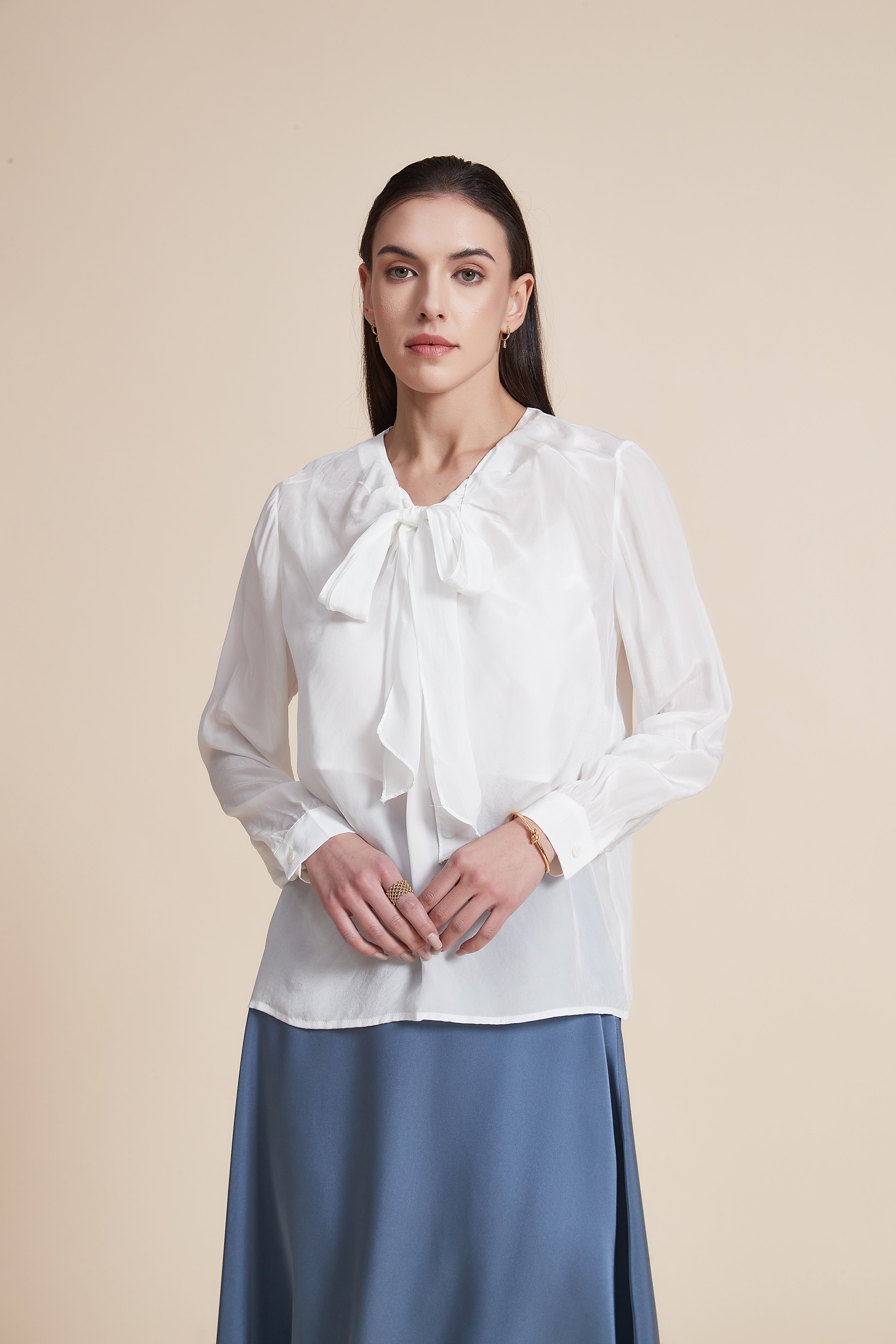 بلوزة بأكمام طويلة وياقة دائرية مع رباط عالي