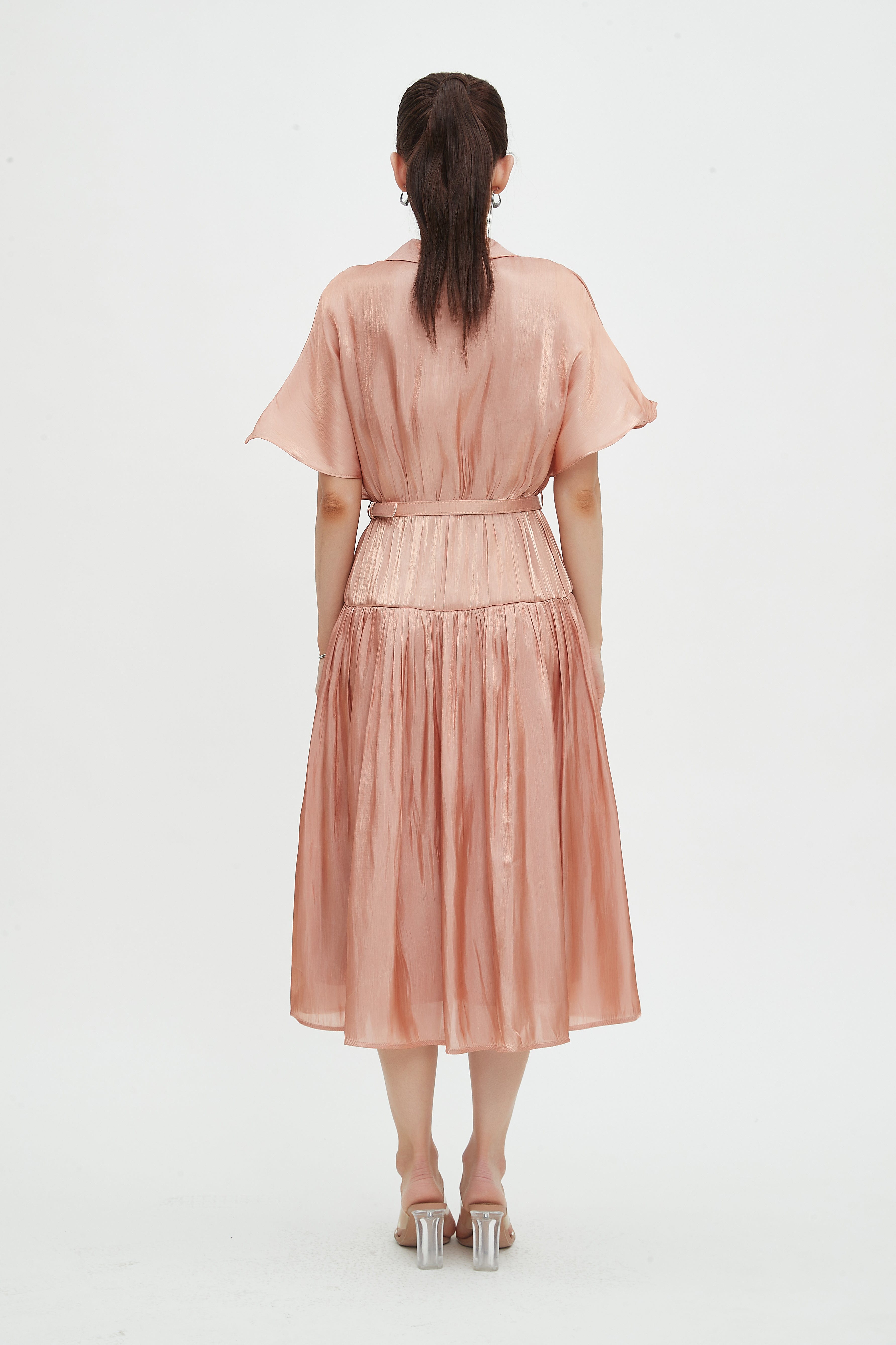 فستان ميدي سادة بأكمام قصيرة برباط خصر
