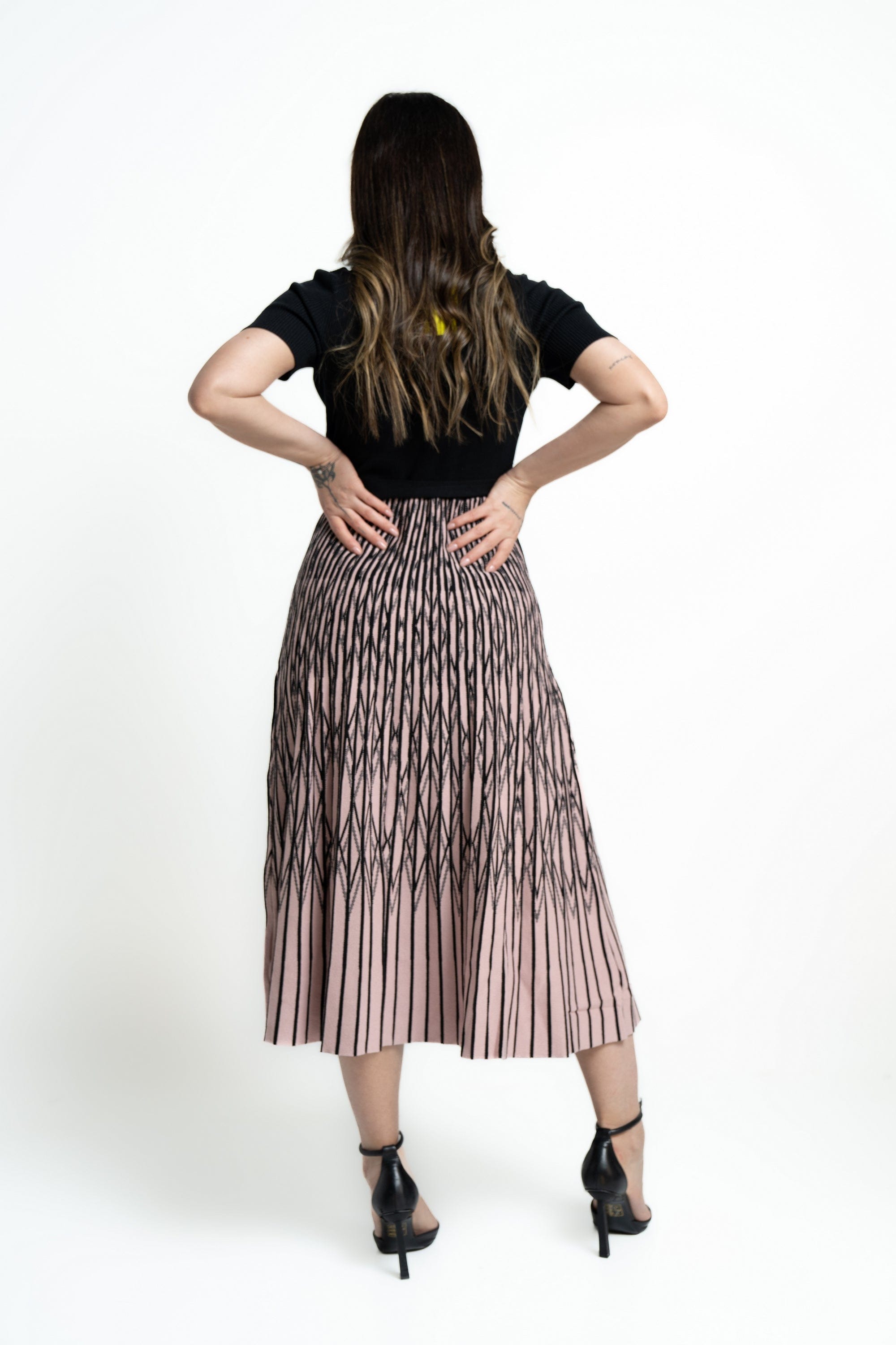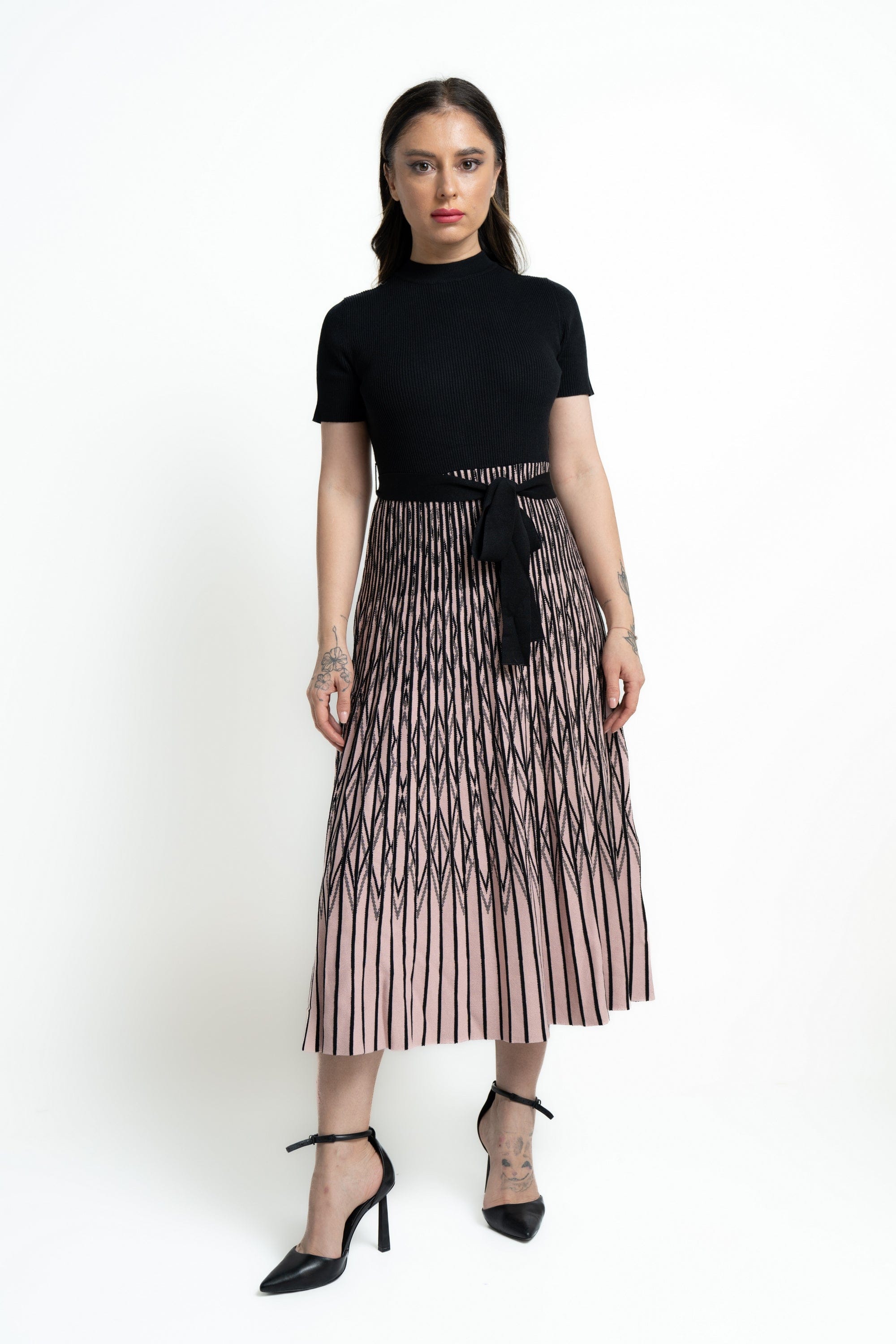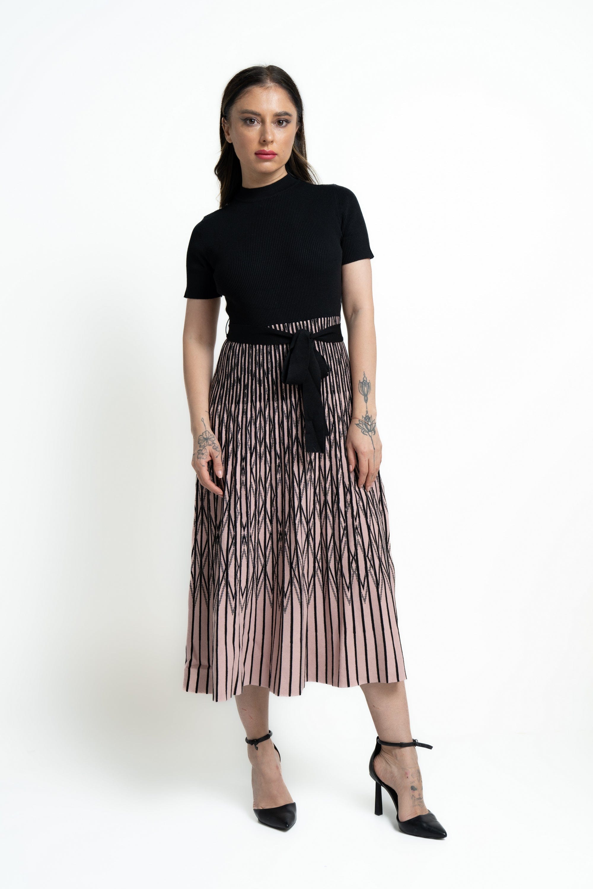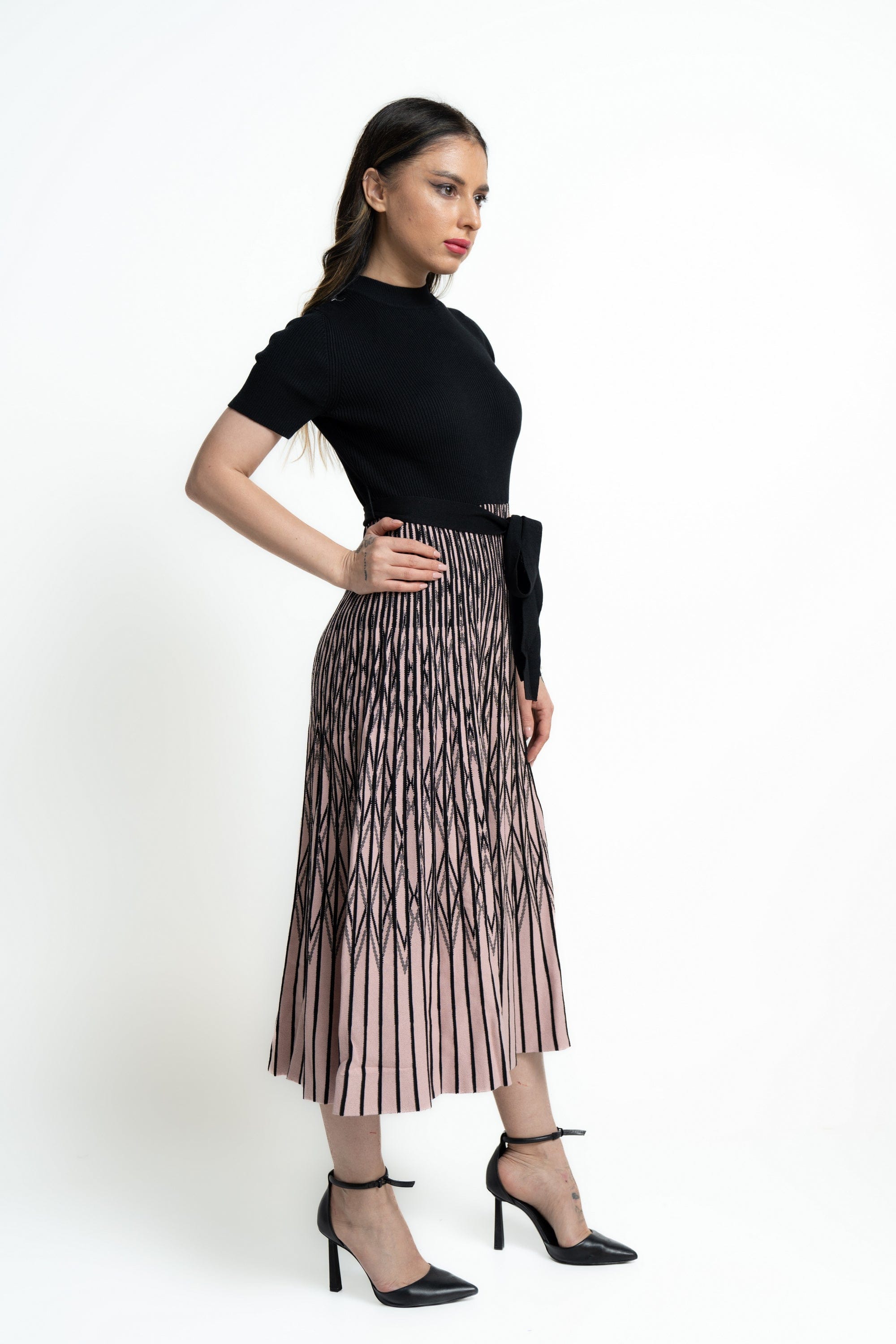 - طول ميدي مخطط بلونين (أسود/وردي) لإطلالة عصرية